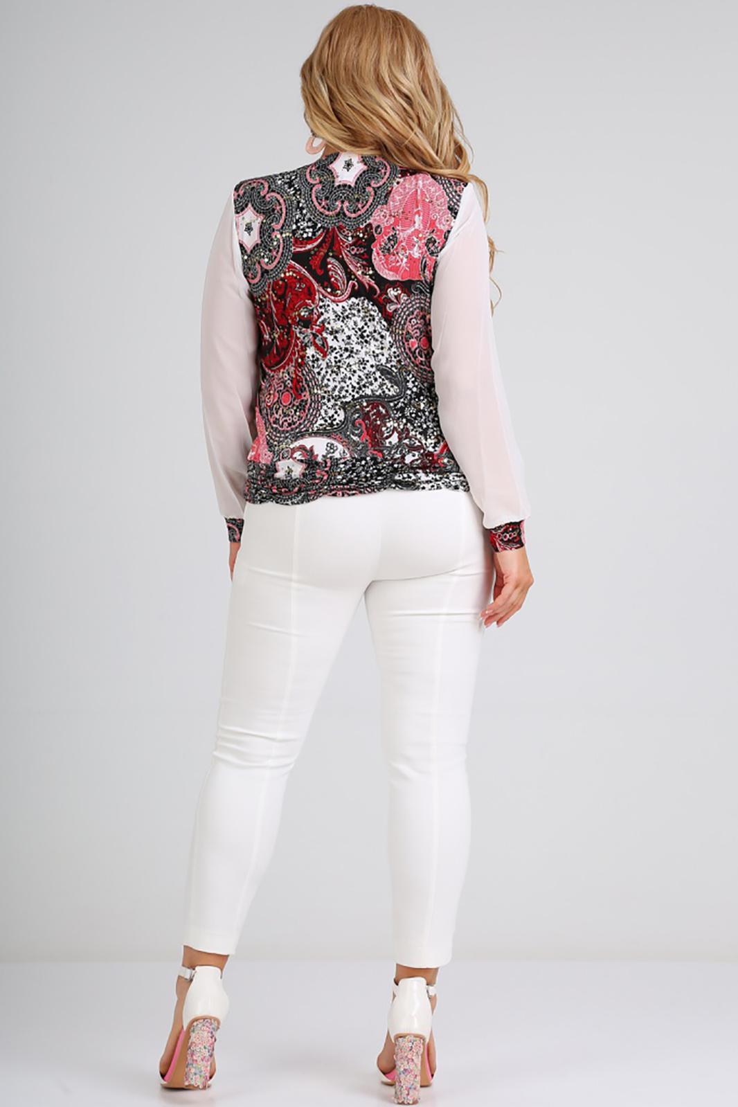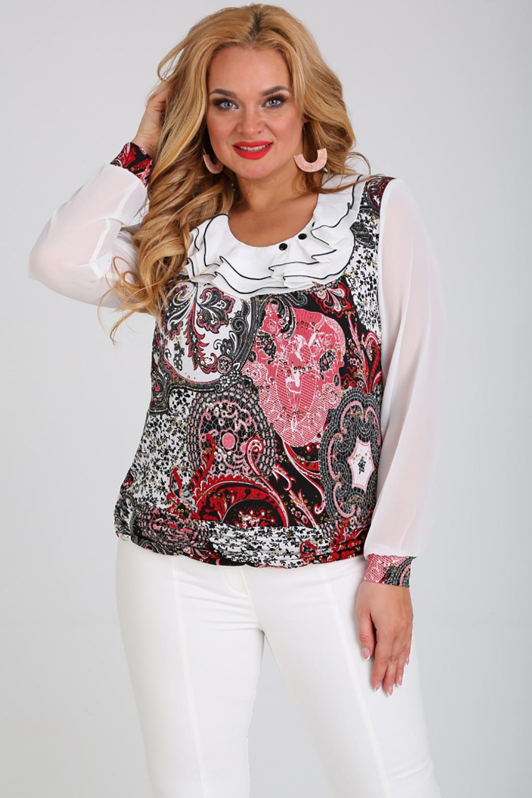Блузка женская полуприлегающего силуэта с втачными одношовными рукавами. Перед с нагрудными вытачками, выходящими из бокового шва. Горловина округлой формы с отложным многослойным воротником-рюшей. По низу изделия притачная широкая манжета, присборенная ниткой-резинкой. Низ рукавов обработан притачными манжетами. Спинка цельная.
