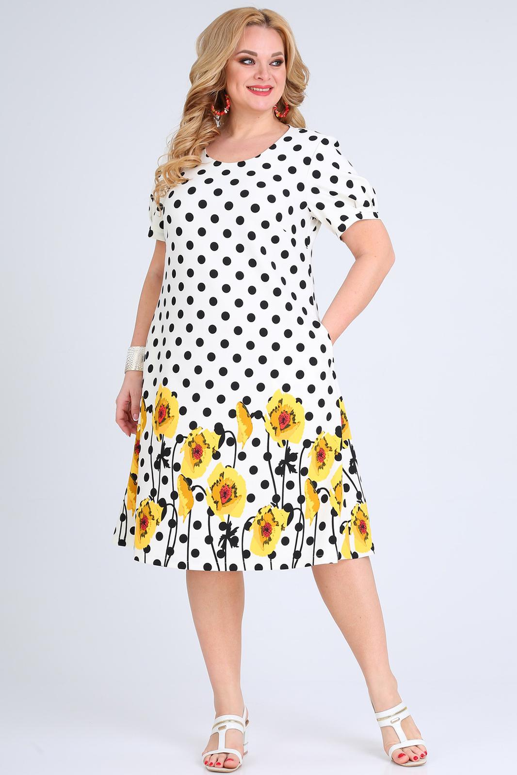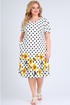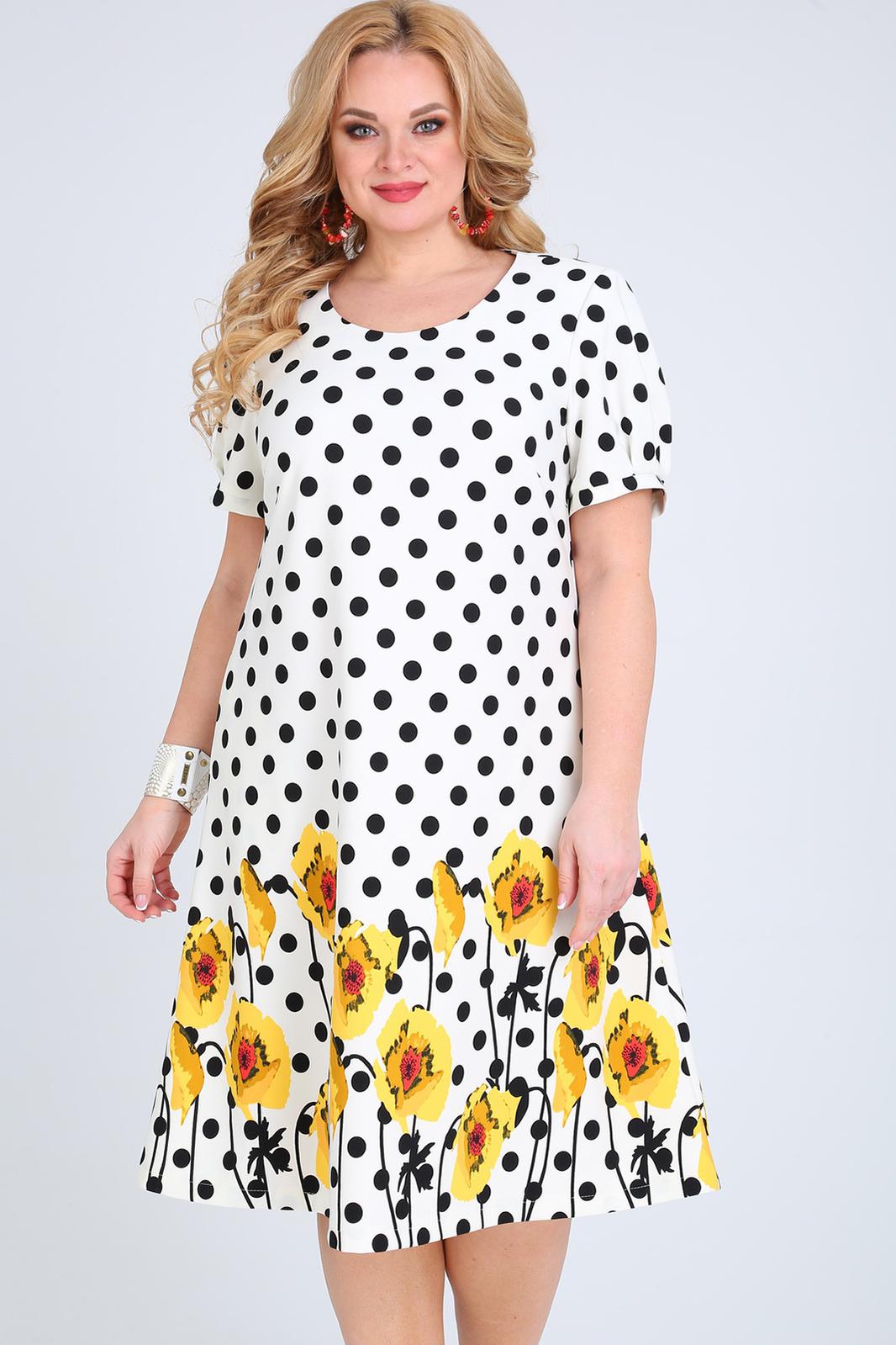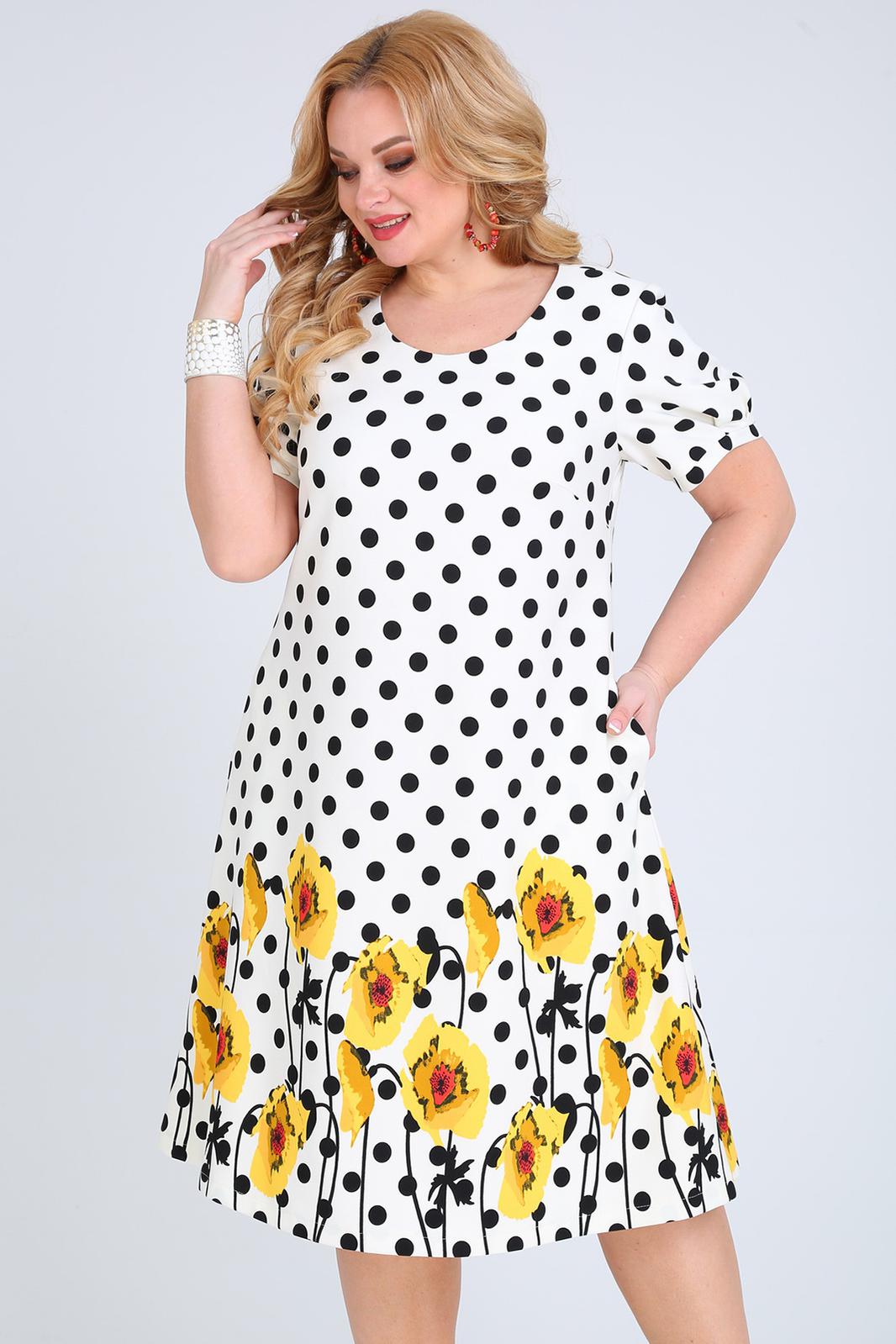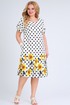 Платье женское А-силуэта изготовлено из эластичного текстильного полотна с оригинальным цветочным принтом. Горловина округлой формы, втачной короткий рукав с небольшими застрочными складками по низу обработанными планкой. В боковых швах функциональные карманы.