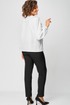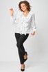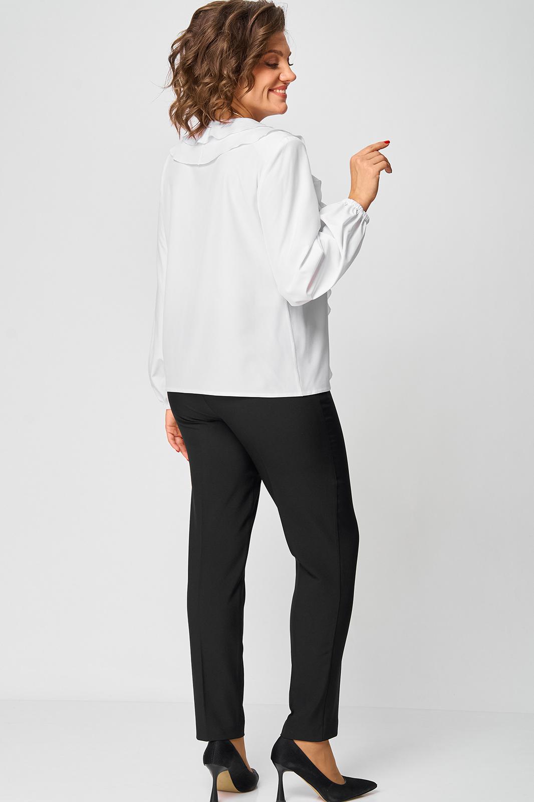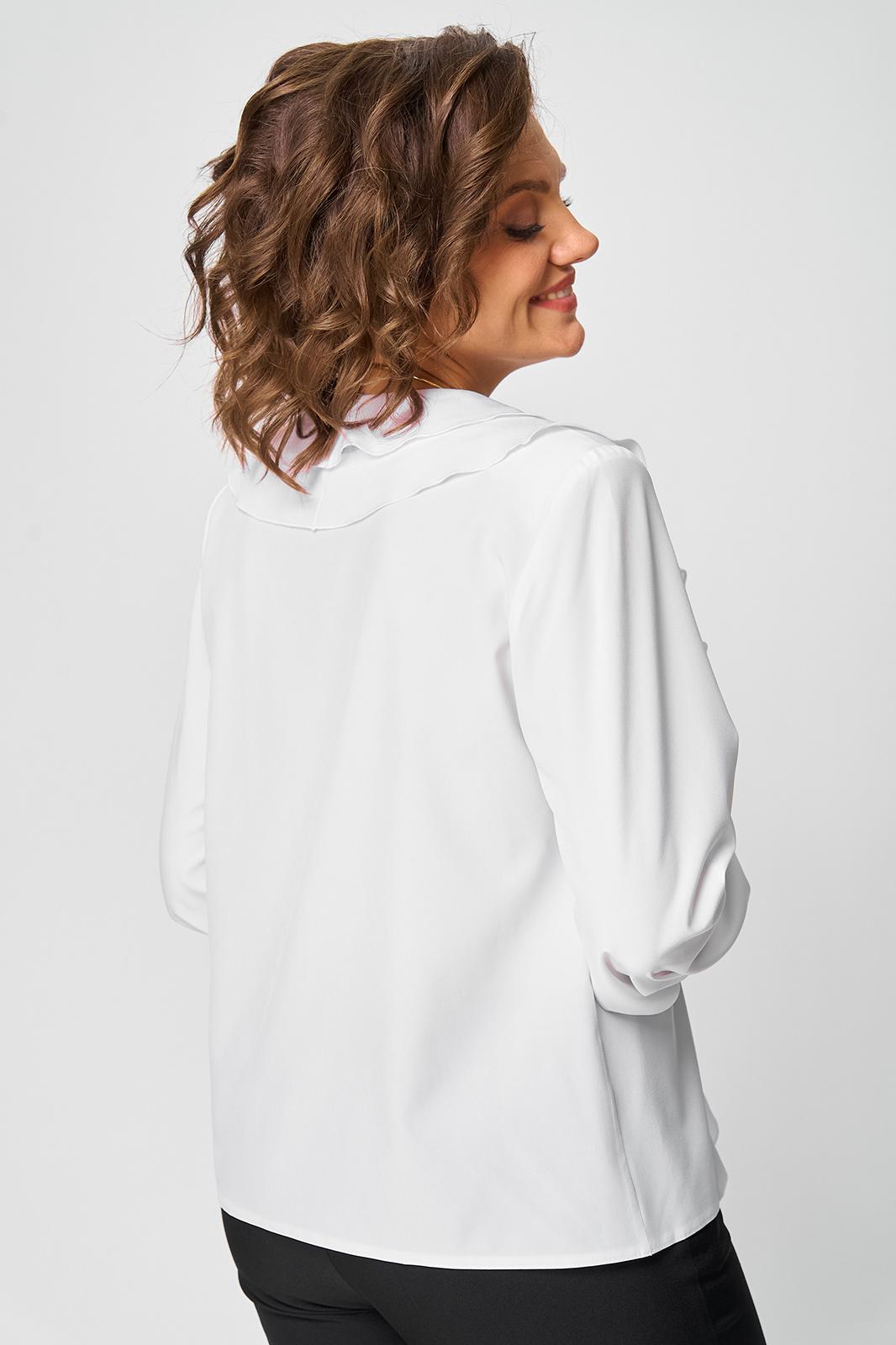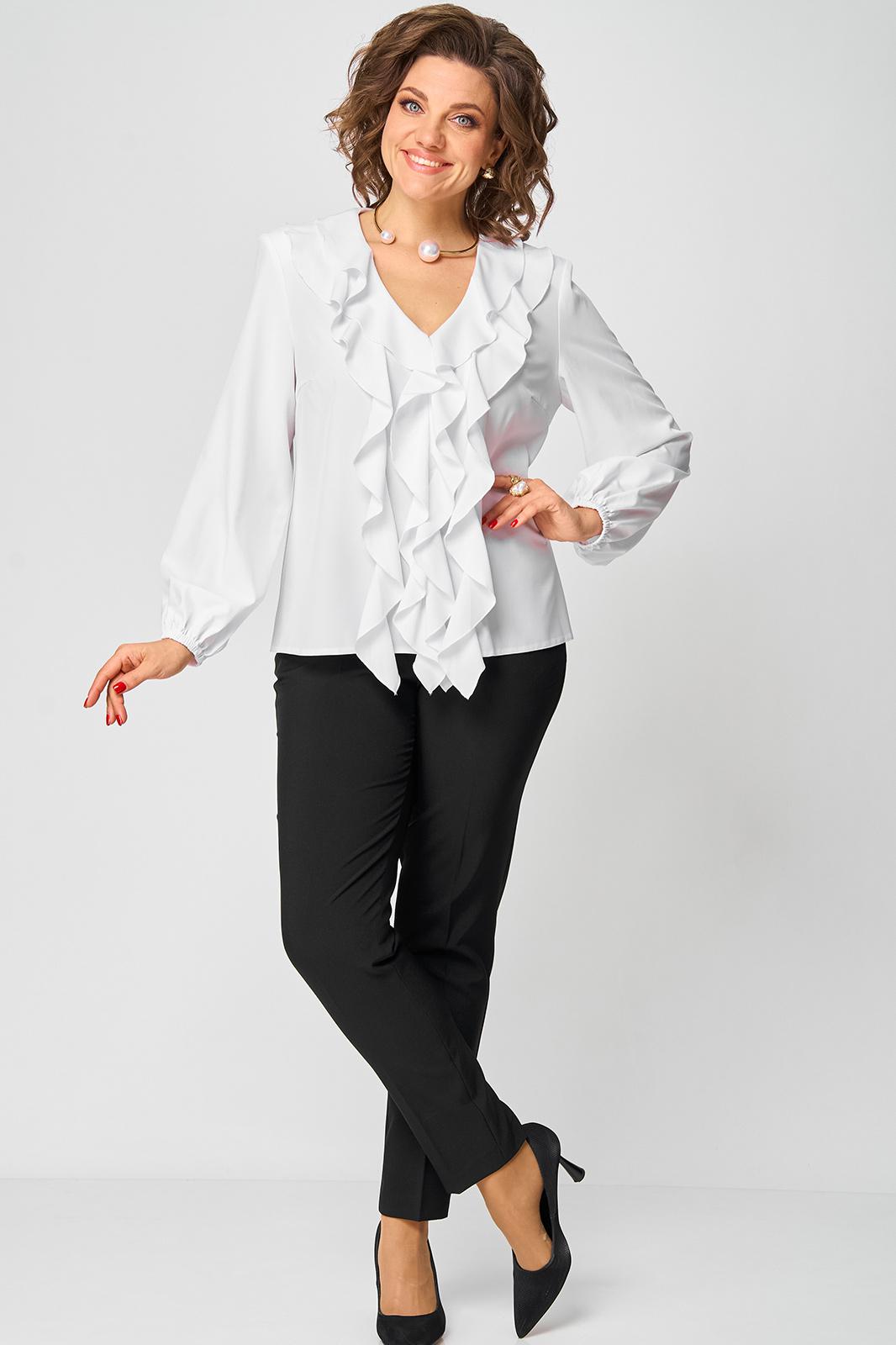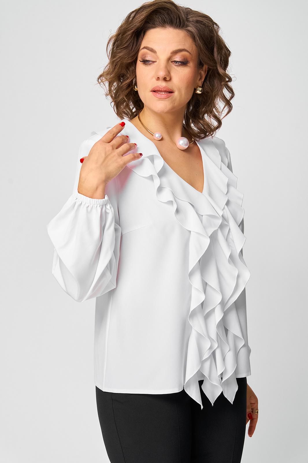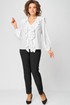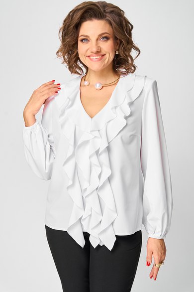 Блузка женская прямого кроя с втачным рукавом. Вырез горловины v- образной формы, оформлен двумя рядами воланов переходящими в шов по переду. По линии груди вытачки. Спинка цельная. Рукав длинный расширенный к низу собран на резинку.