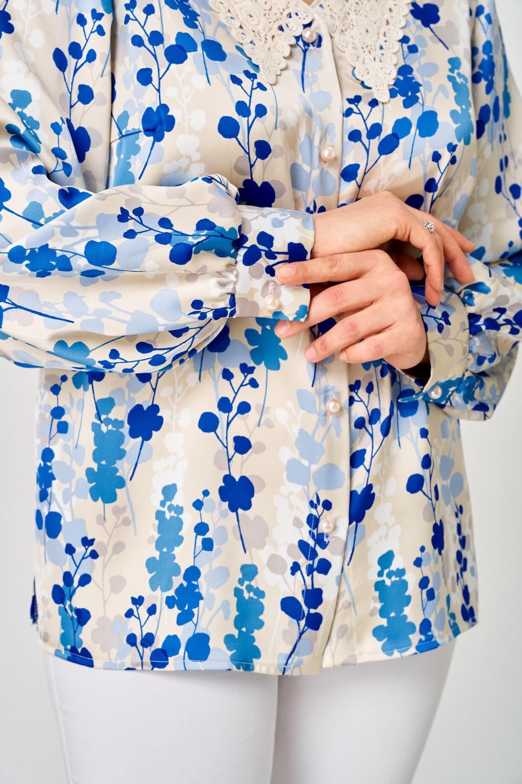 Блузка женская прямого силуэта, с втачным рукавом. Горловина v-образной формы. Отделкой служит воротничок из кружева. Застежка центральная на пять петель и пуговиц. По линии груди вытачки. Рукав длинный расширенный к низу, на притачной манжете с застежкой на петлю и пуговицу. В боковых швах обработаны разрезы.