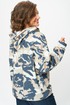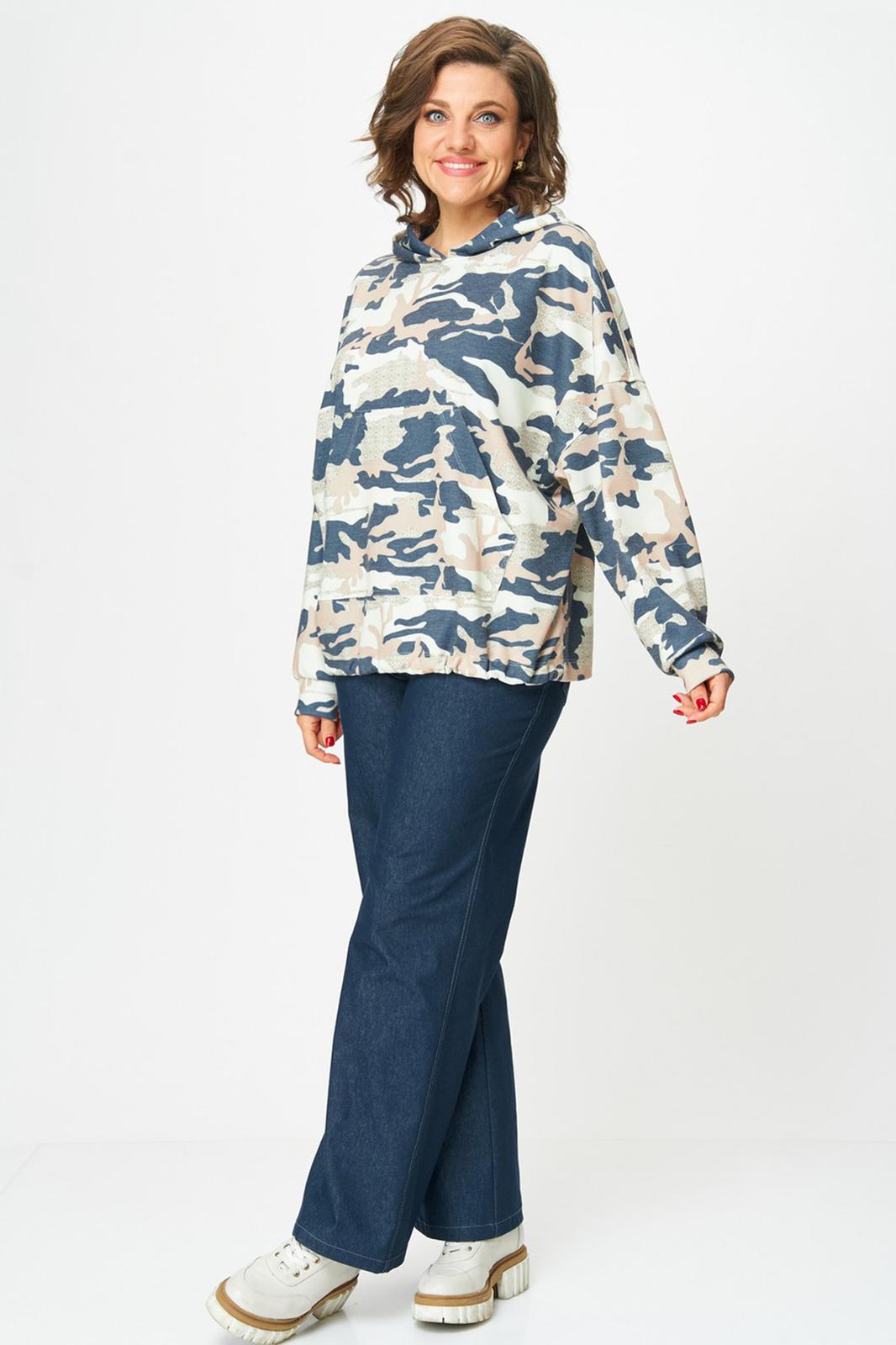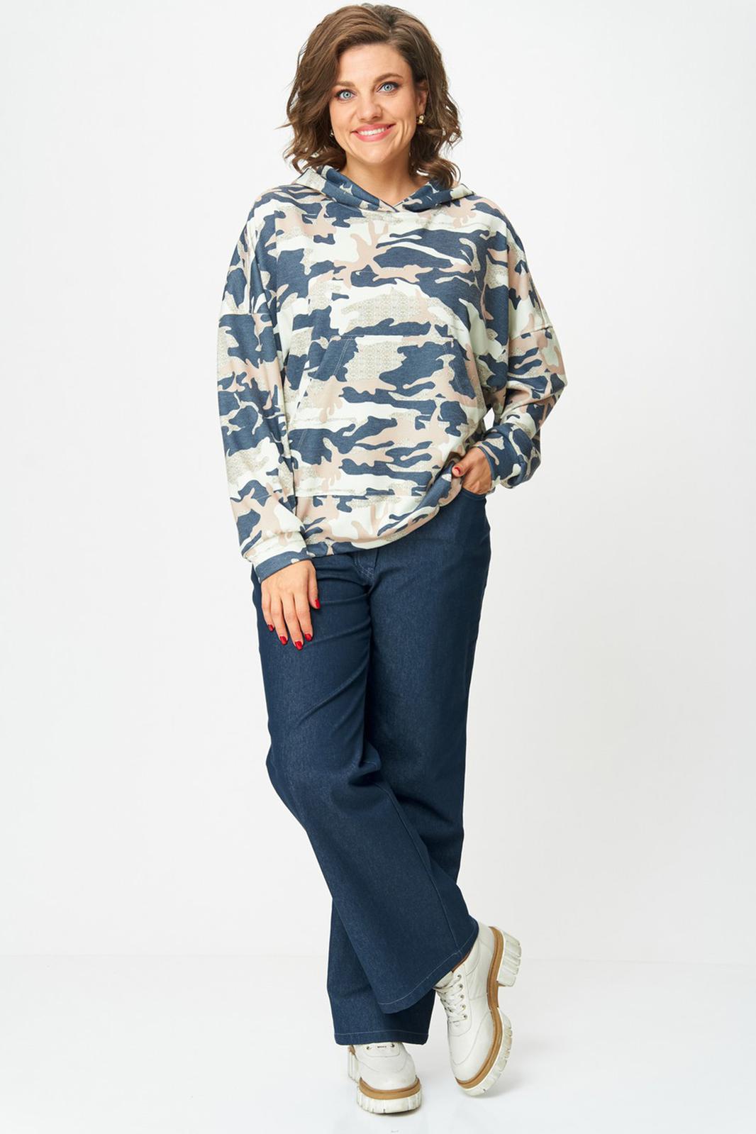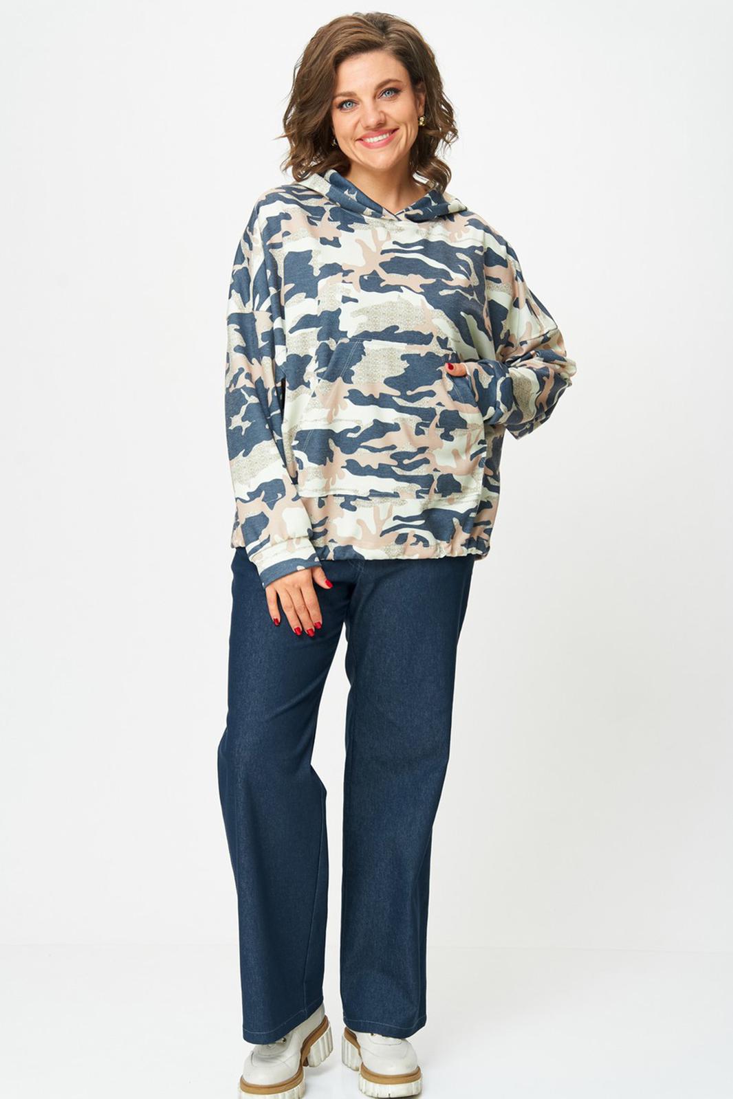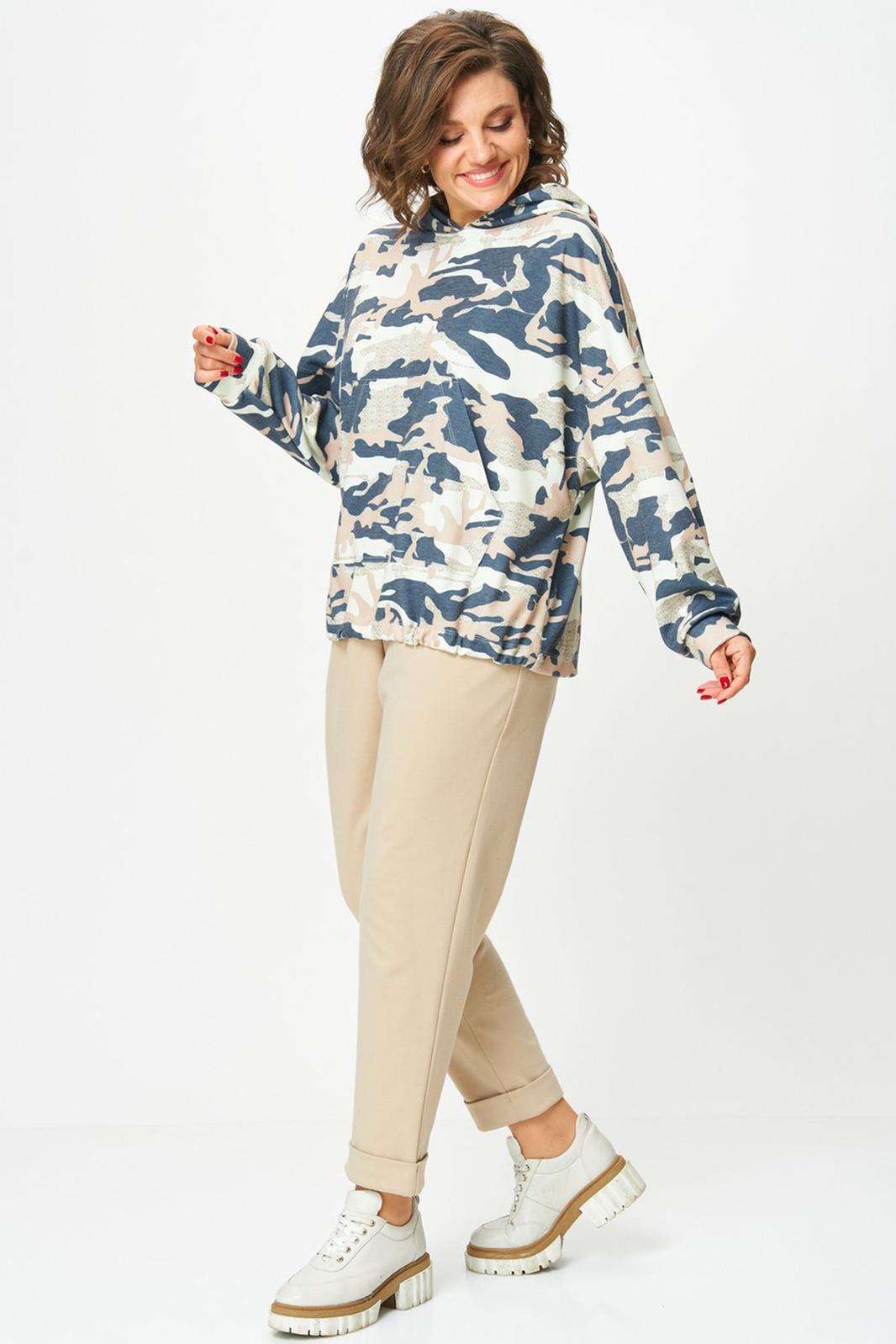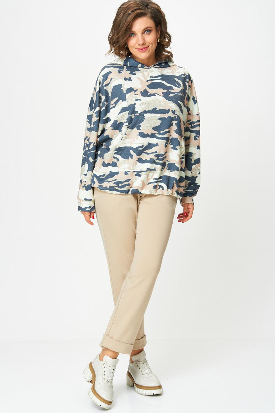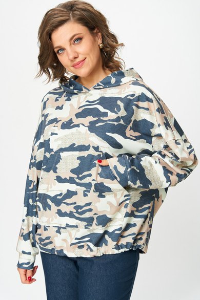 Толстовка женская оверсайз с втачным рукавом. Линия плеча спущенная. Горловина с капюшоном. По переду карман кенгуру. Рукав длинный по низу с притачной манжетой. По низу ширина толстовки регулируется фиксаторами с резинкой.