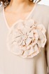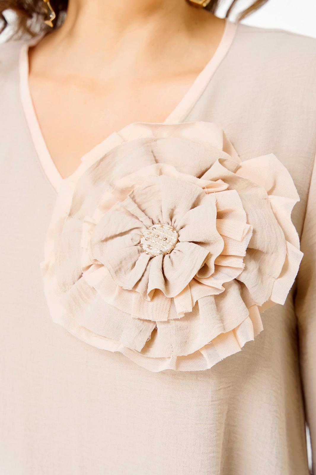 Блузка A – силуэта c втачным рукавом. Горловина v- образной формы. Рукав длиной ¾, с расширением по низу. По горловине и низу рукава бейка из сетки. Украшением служит съемный объемный цветок.