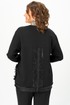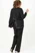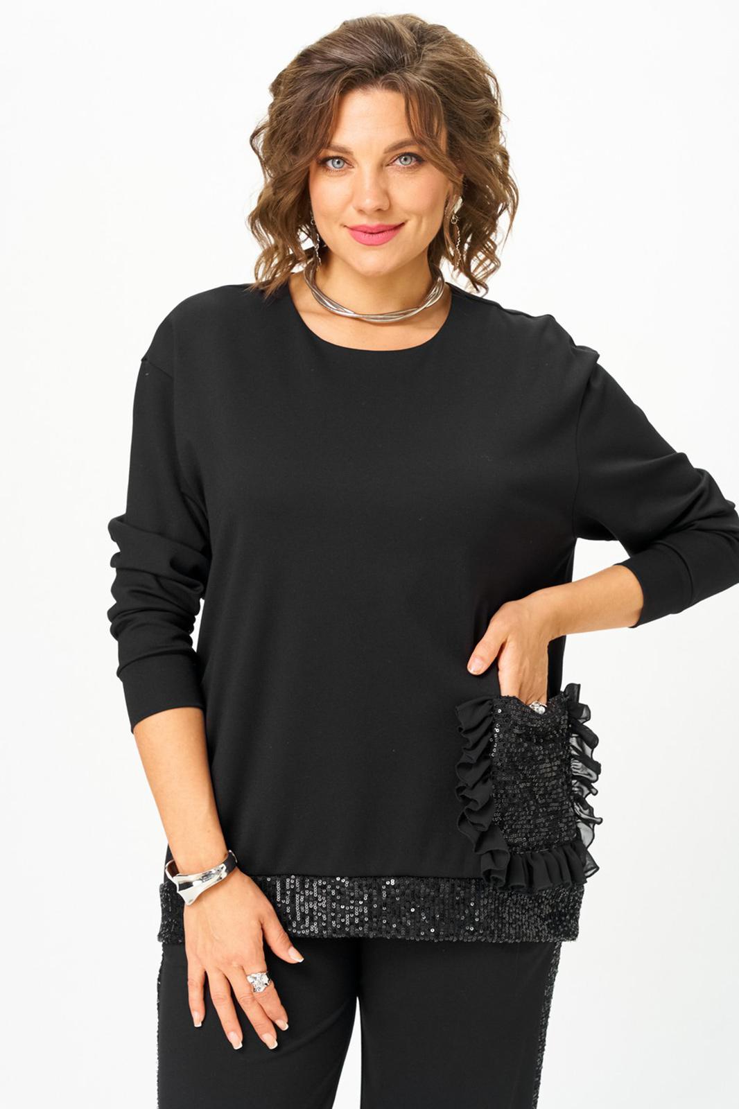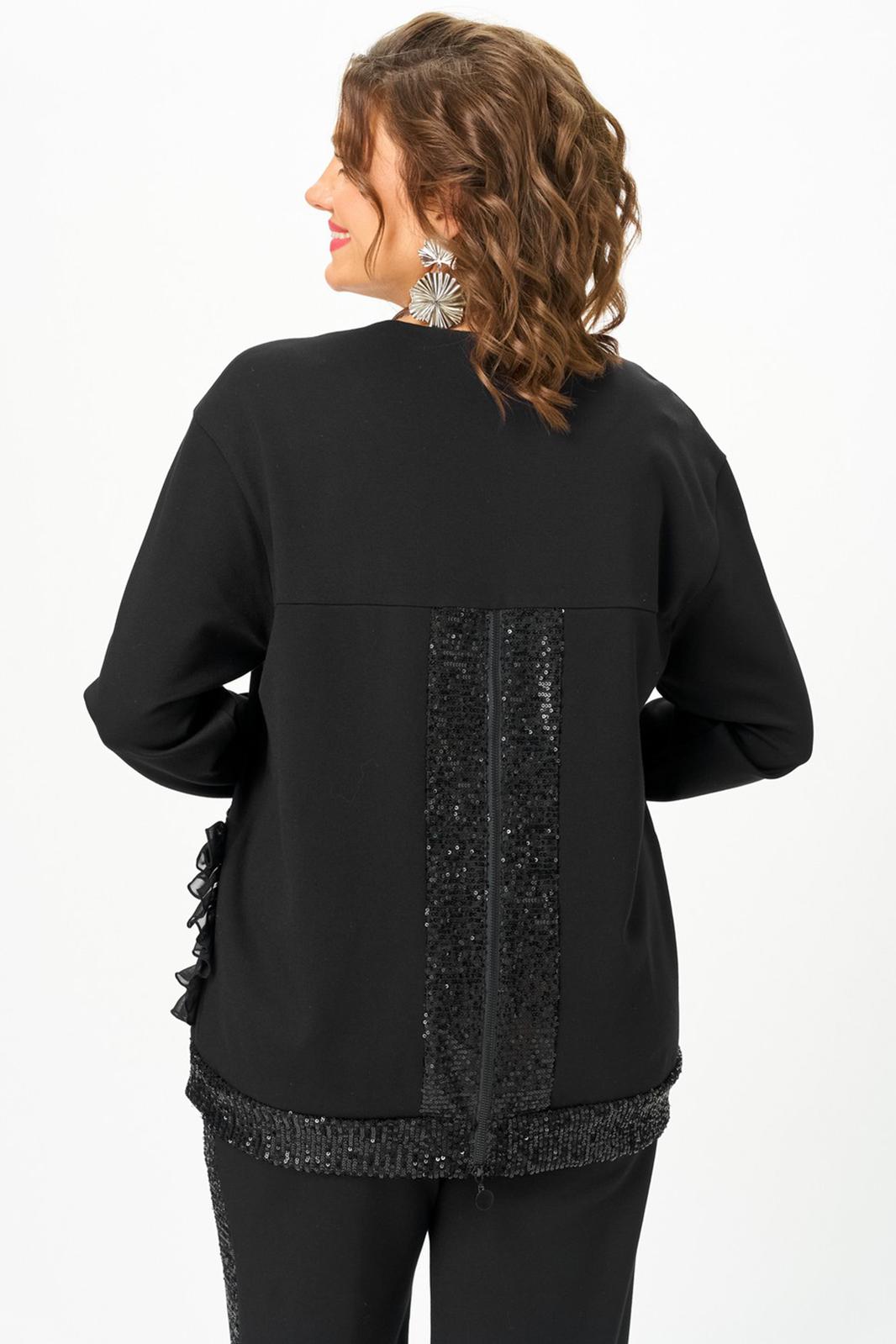 Джемпер прямого силуэта, длиной ниже линии бедер, с втачным рукавом. Линия плеча слегка спущена. Накладной карман с оборкой в нижней части переда. Спинка с кокеткой и застежкой молнией с планкой из пайетки в нижней части добавляет нотку роскоши и индивидуальности. Горловина округлой формы. Рукава длинные на притачной манжете. Пояс из пайетки по низу джемпера создает интересный силуэт и становится ярким акцентом.