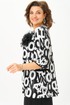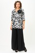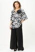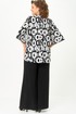 Блузка А-силуэта с втачным рукавом. Вырез орловины v- образной формы. Рукав длиной 3/4 расширен к низу. По горловине и по низу рукава бейка из сетки. Украшением служит съемный объемный цветок из отделочной ткани.