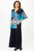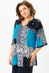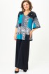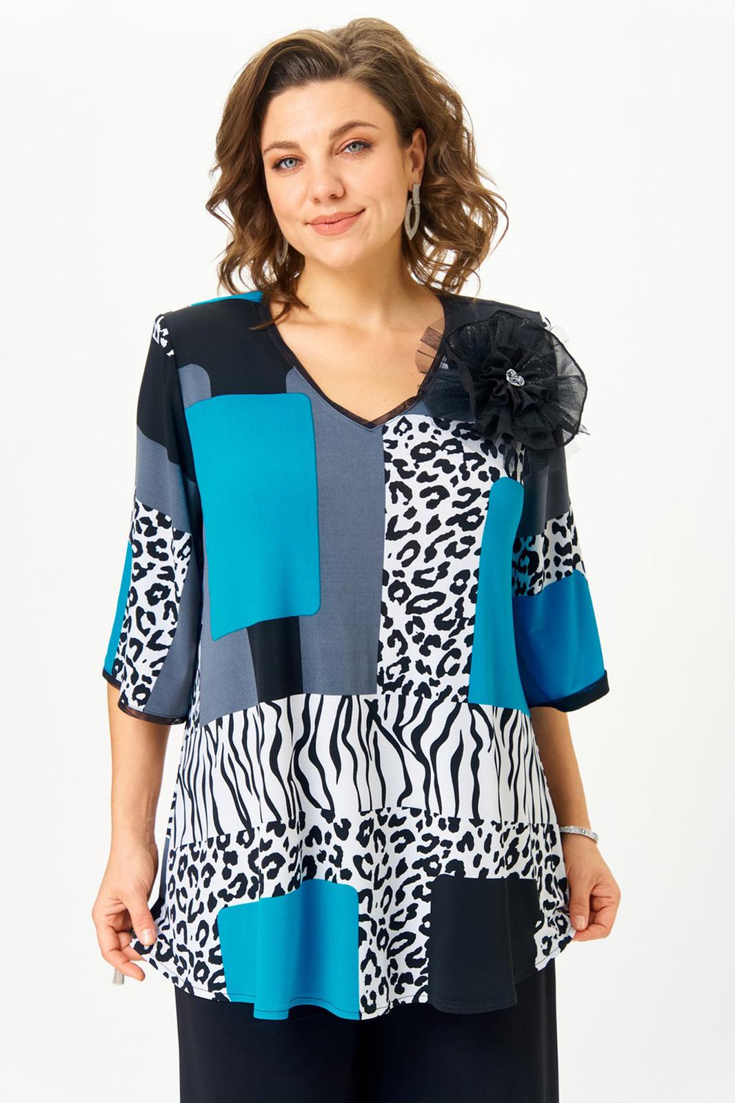 Блузка А-силуэта с втачным рукавом. Вырез орловины v- образной формы. Рукав длиной 3/4 расширен к низу. По горловине и по низу рукава бейка из сетки. Украшением служит съемный объемный цветок из отделочной ткани.