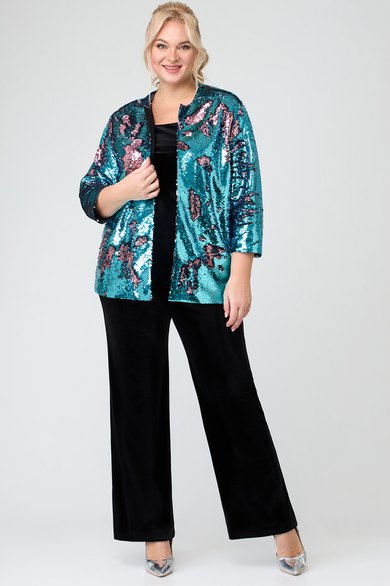 Жакет из ткани с пайетками, прямого силуэта. Линия плеча слегка спущенная. Рукав втачной длинной ¾. Жакет на подкладке.