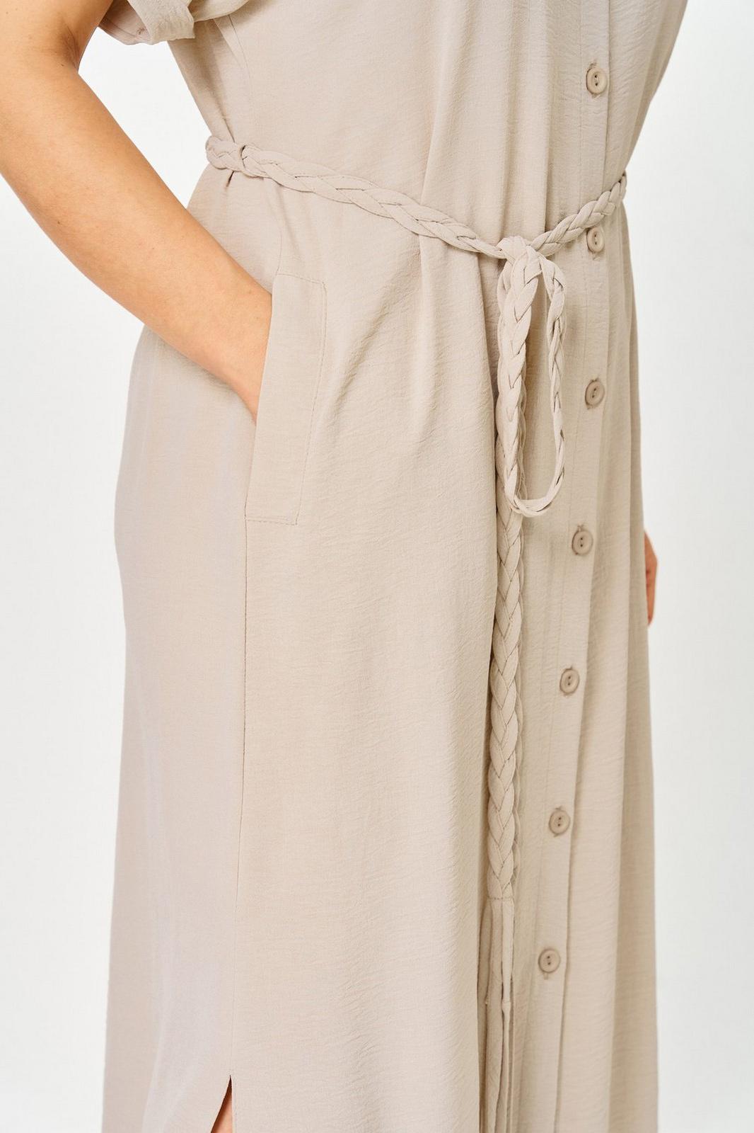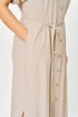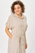 Платье женское прямого силуэта со спущенной линией плеча. Застежка центральная на 8 петель и пуговиц. Воротник отложной на стойке. По верхней части спинки кокетка, нижняя часть спинки со встречной складкой. В боковых швах карманы. По линии талии пояс в тон ткани. Низ рукава с манжетой и декоративной патой. Платье с фигурной линией низа и разрезами.
