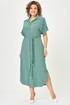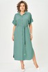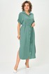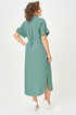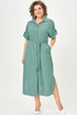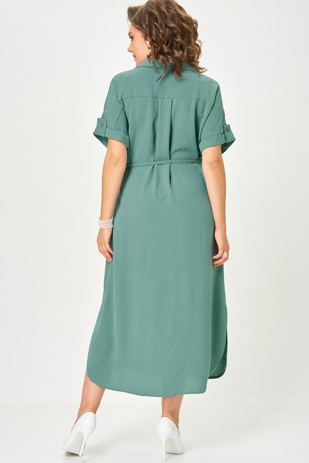 Платье женское прямого силуэта со спущенной линией плеча. Застежка центральная на 8 петель и пуговиц. Воротник отложной на стойке. По верхней части спинки кокетка, нижняя часть спинки со встречной складкой. В боковых швах карманы. По линии талии пояс в тон ткани. Низ рукава с манжетой и декоративной патой. Платье с фигурной линией низа и разрезами.