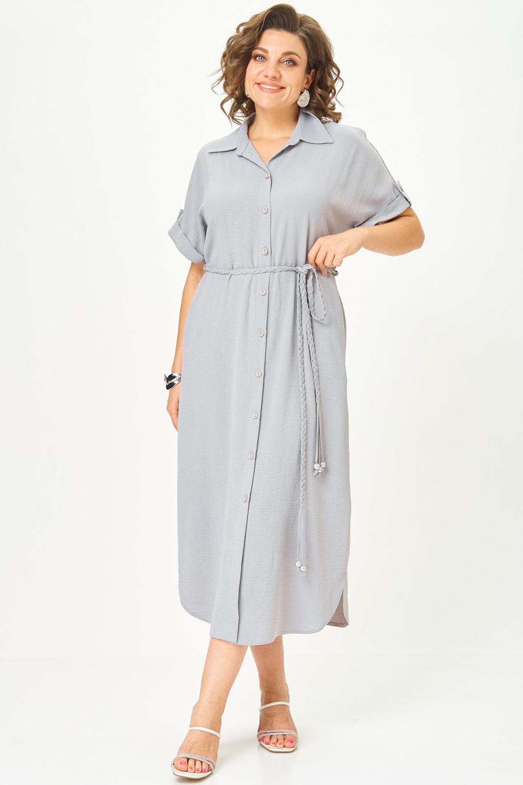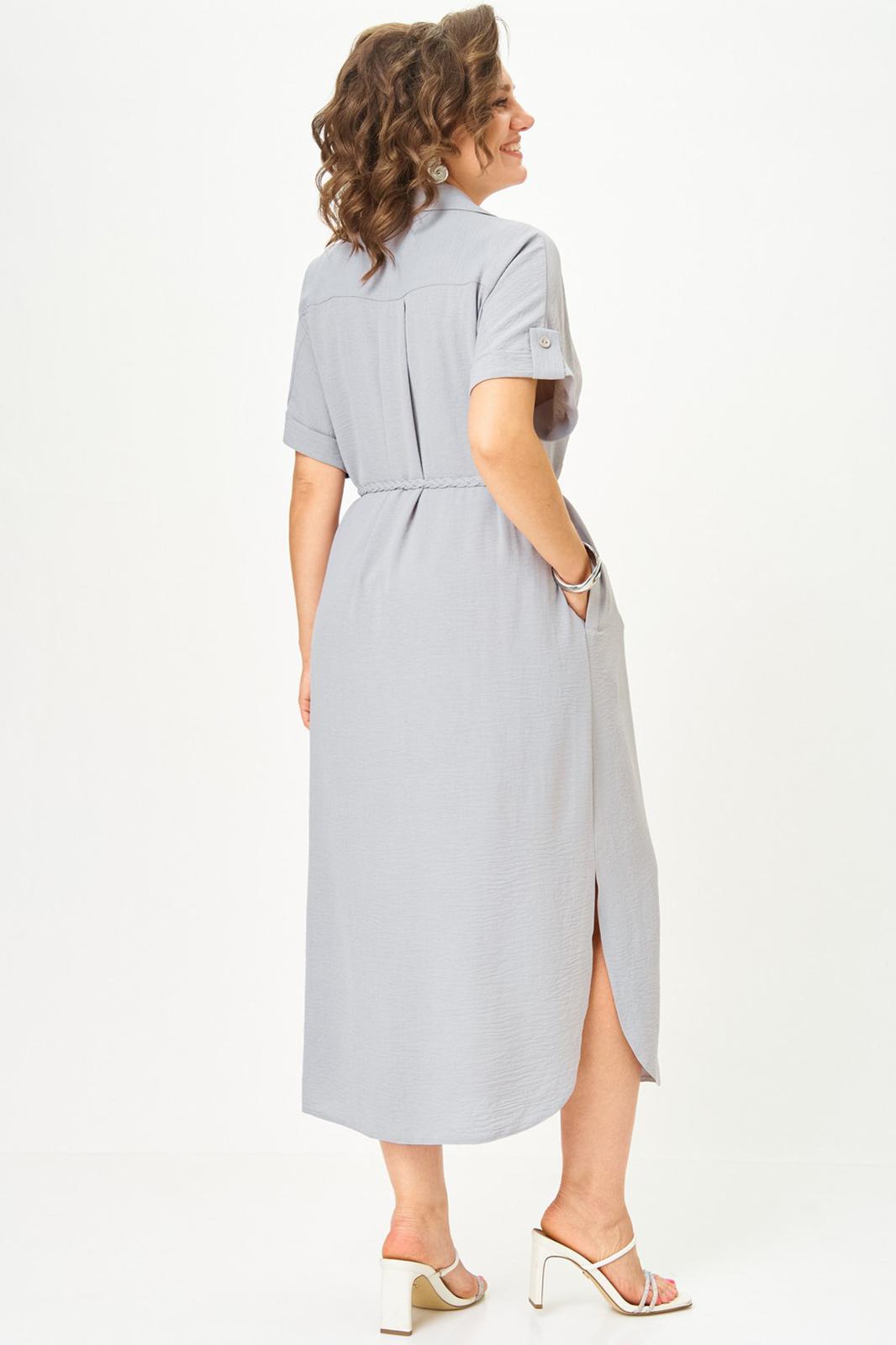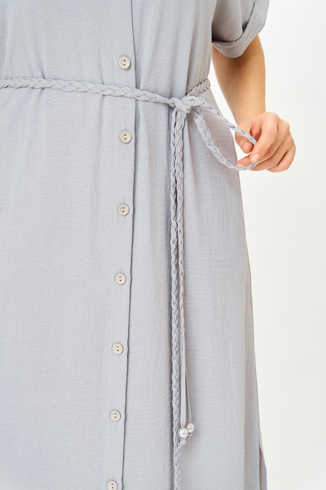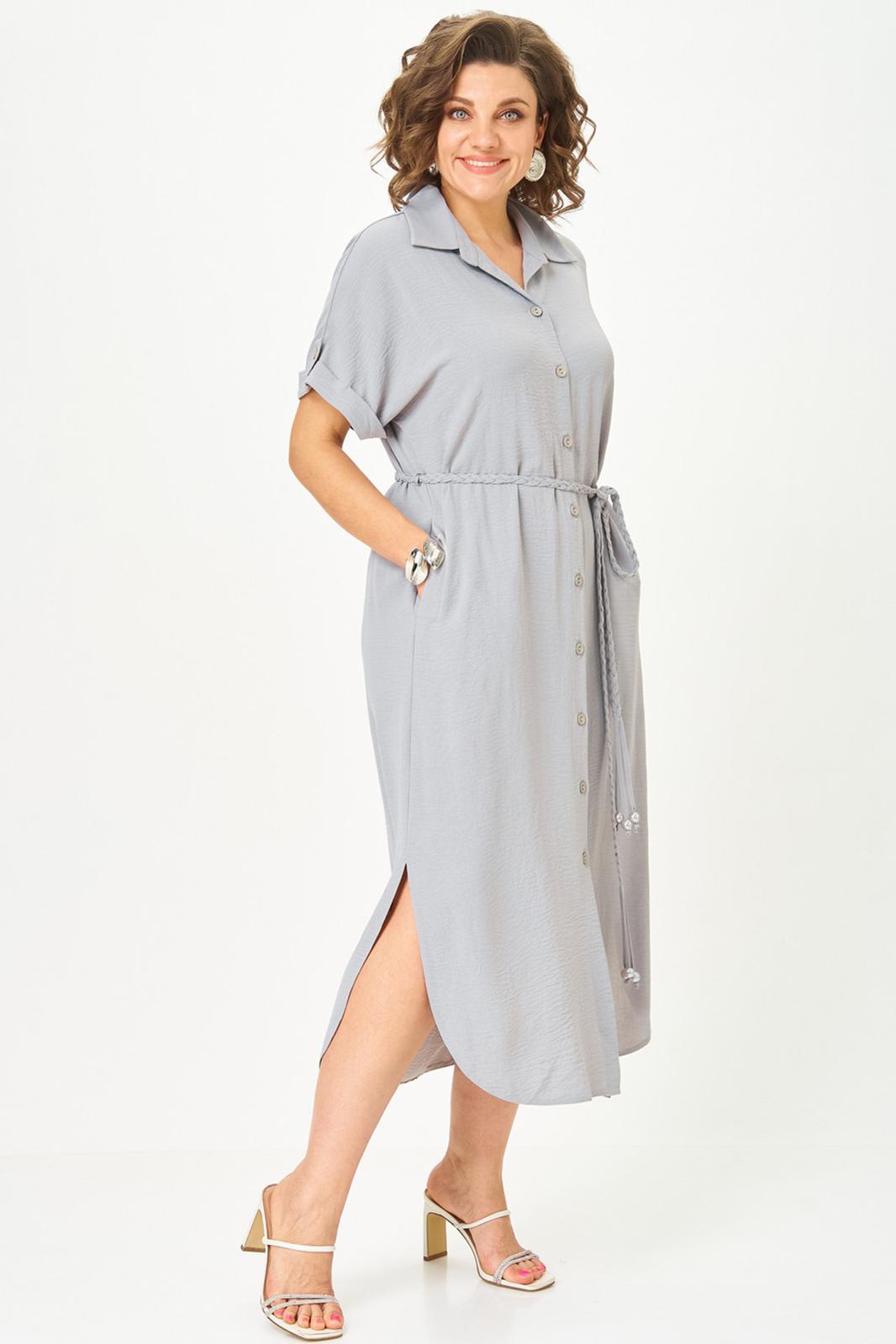 Платье женское прямого силуэта со спущенной линией плеча. Застежка центральная на 8 петель и пуговиц. Воротник отложной на стойке. По верхней части спинки кокетка, нижняя часть спинки со встречной складкой. В боковых швах карманы. По линии талии пояс в тон ткани. Низ рукава с манжетой и декоративной патой. Платье с фигурной линией низа и разрезами.