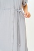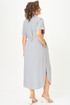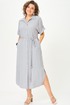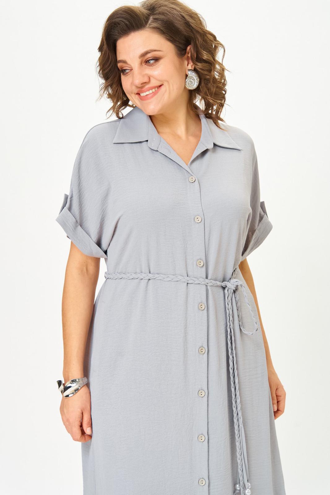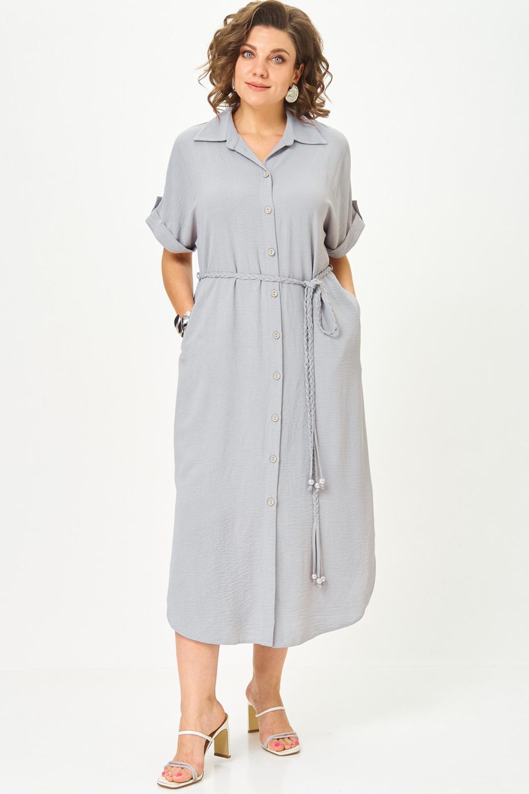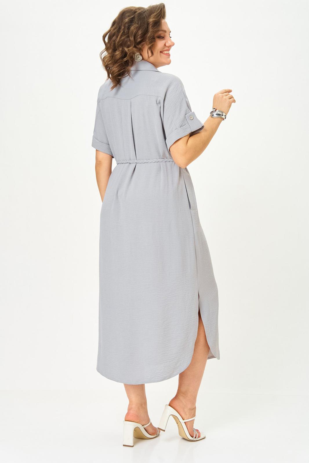 Платье женское прямого силуэта со спущенной линией плеча. Застежка центральная на 8 петель и пуговиц. Воротник отложной на стойке. По верхней части спинки кокетка, нижняя часть спинки со встречной складкой. В боковых швах карманы. По линии талии пояс в тон ткани. Низ рукава с манжетой и декоративной патой. Платье с фигурной линией низа и разрезами.