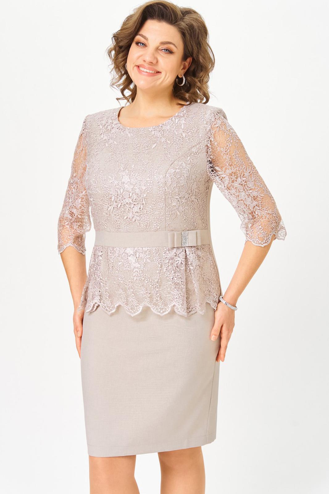 Платье женское прилегающего силуэта с втачным рукавом. Верхняя часть переда с рельефами из проймы. По переду отрезной пояс и баска. Спинка платья со средним швом, с застежкой молнией и разрезом. Рукав длиной ¾. Верхняя часть переда, баска и рукав выполнены из кружева. На поясе декоративный бант.