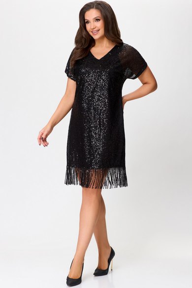 Платье нарядное с пайетками и бахромой прямого кроя, выполнено в комплектации из двух предметов. Линия плеча спущена. Вырез горловины v-образный. Нижнее платье полуприлегающего силуэта, на регулируемых бретелях. По линии груди вытачки.