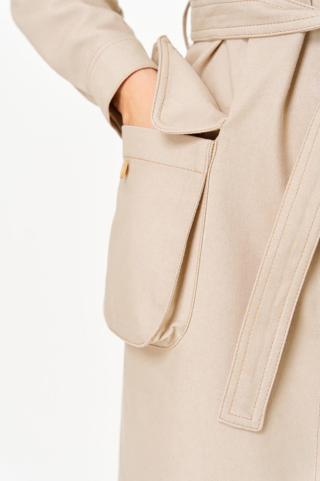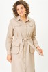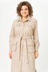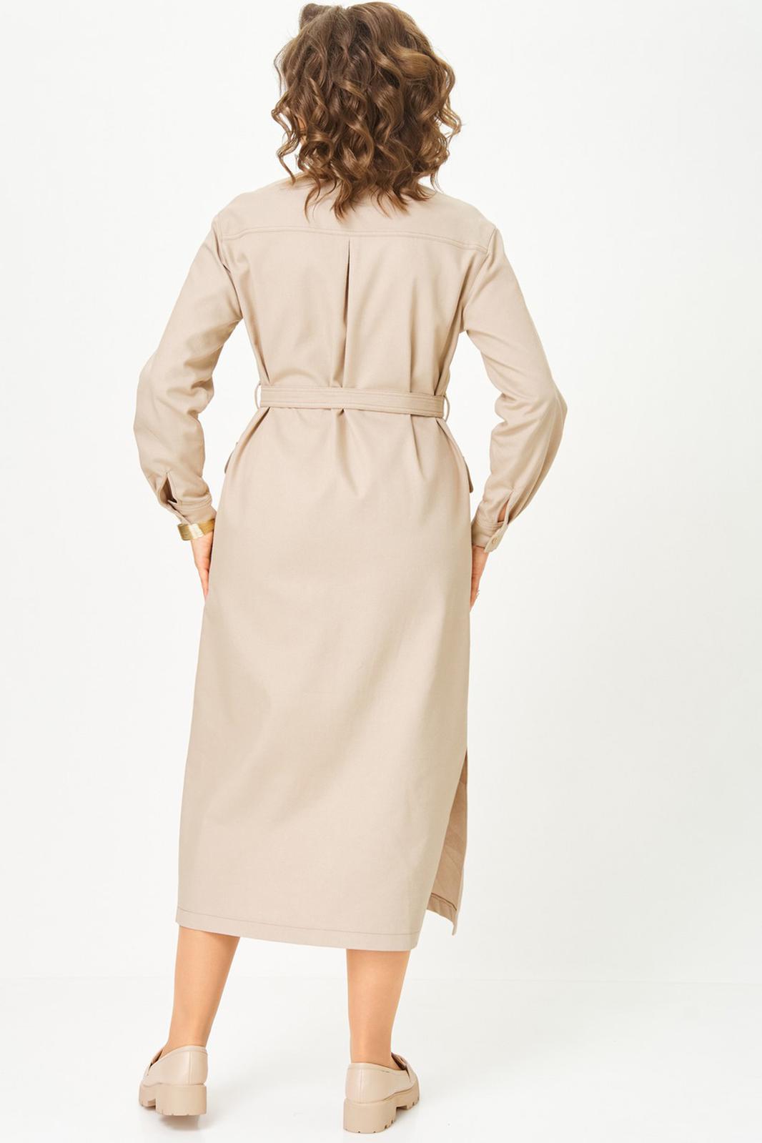 По переду центральная планка с застежкой на петли и пуговицы. По горловине отложной воротник на стойке. По переду в верхней части кокетка и декоративные клапаны в нижней части выполнены объемные накладные карманы с клапаном. По спинке кокетка, и складка из-под кокетки. Рукав втачной со спущенной линией плеча, но низу с притачной манжетой. По талии платье фиксируется съемным поясом.