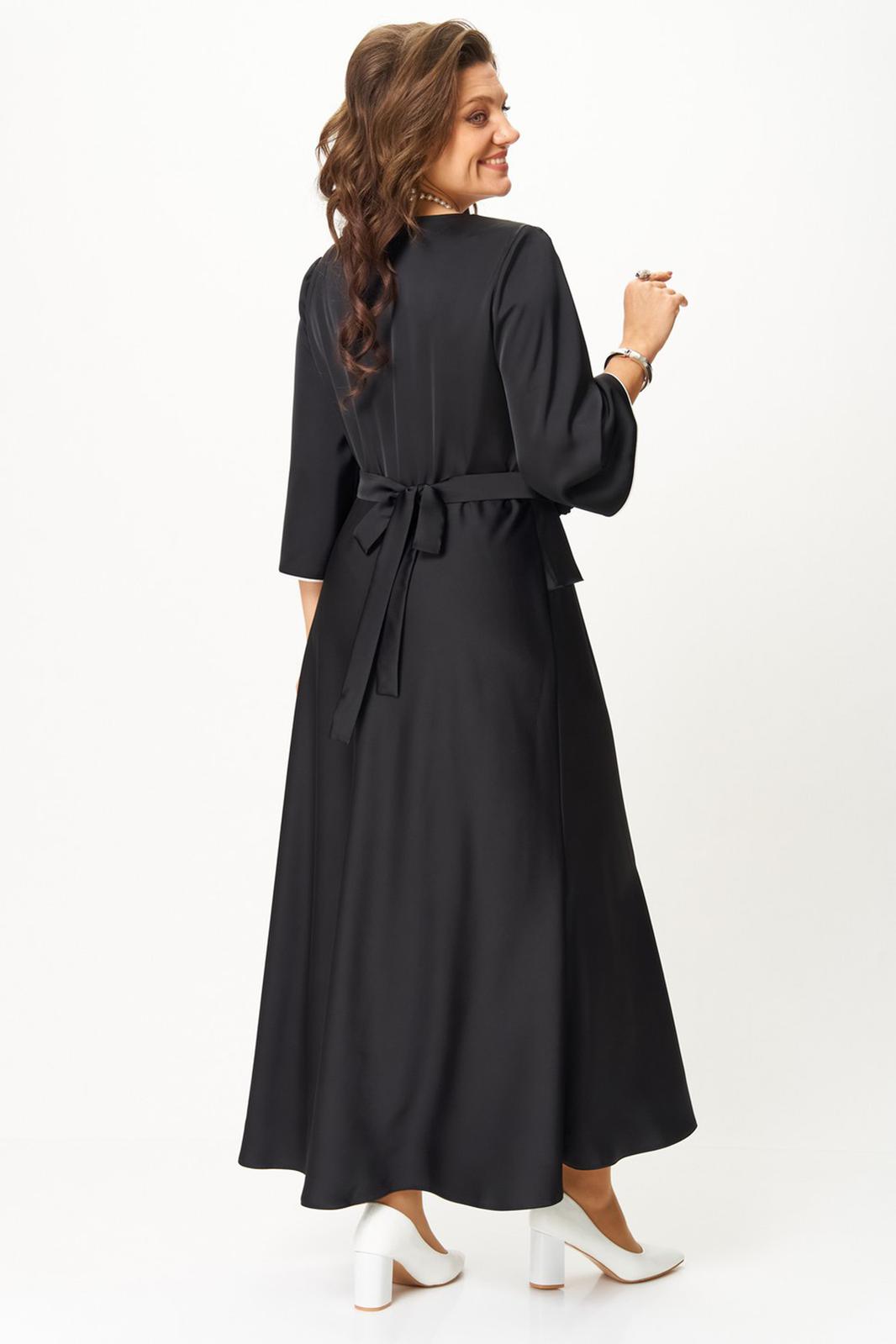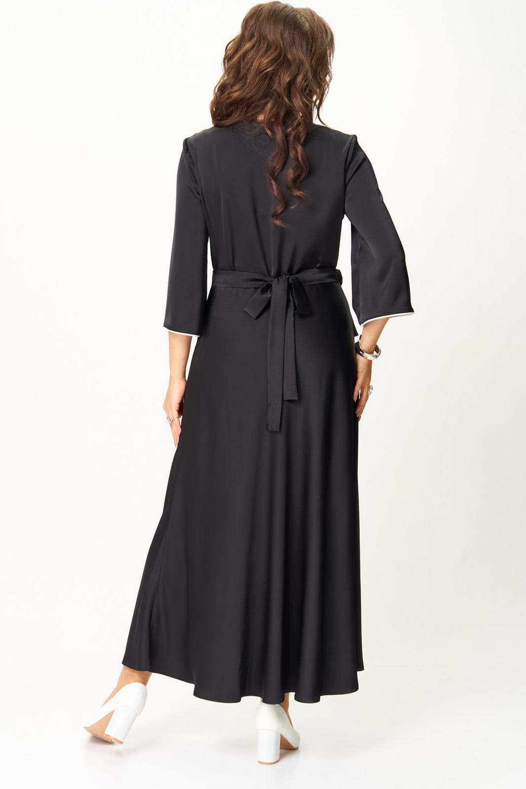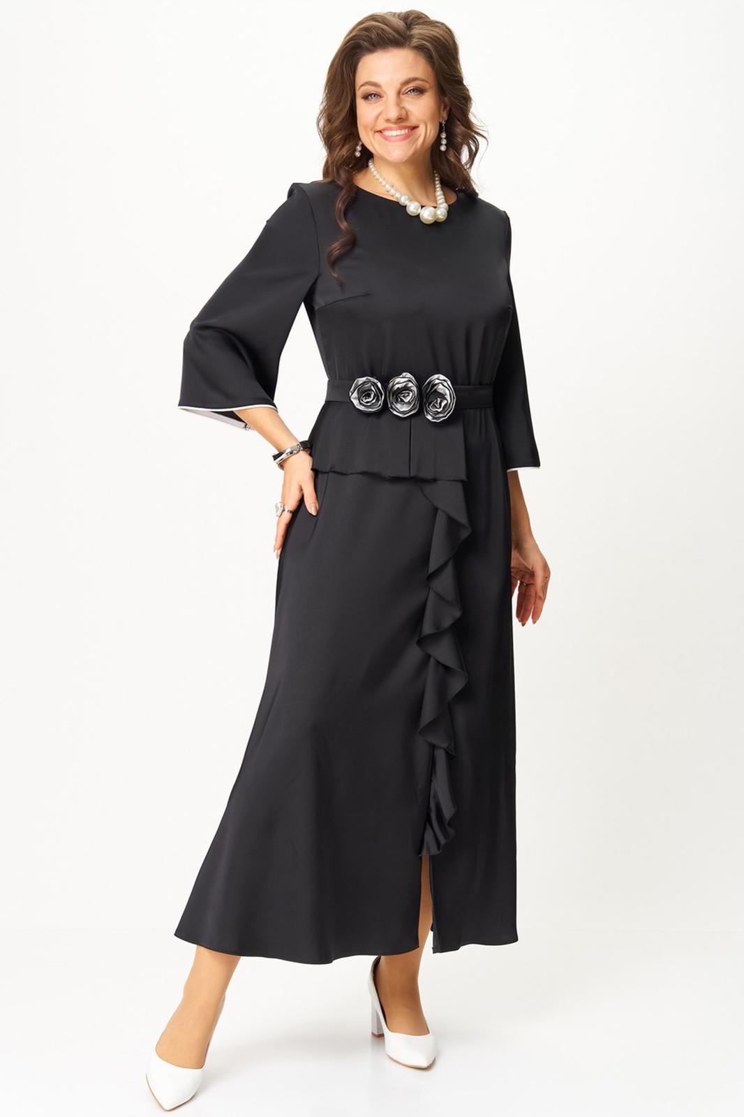Платье женское вечернее полуприлегающего силуэта с втачным рукавом. Горловины округлой формы. По линии груди вытачки. Застежка на потайную молнию в левом боковом шве. Платье отрезное по линии талии, нижняя часть расклешенная. Нижняя часть переда оформлена воланом, переходящим в шов по переду, что добавляет романтичности и легкости. Нижняя часть спинки со средним швом.