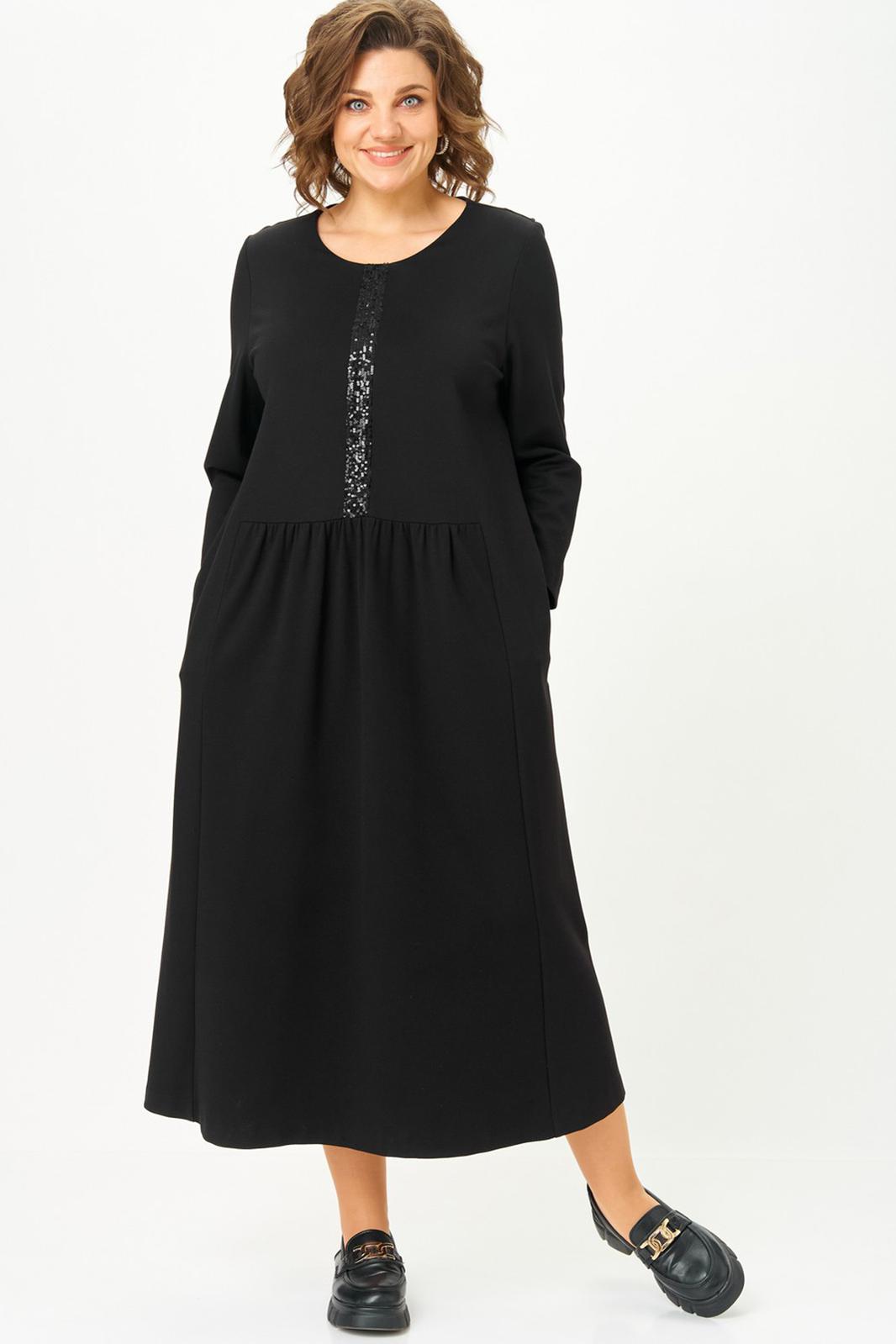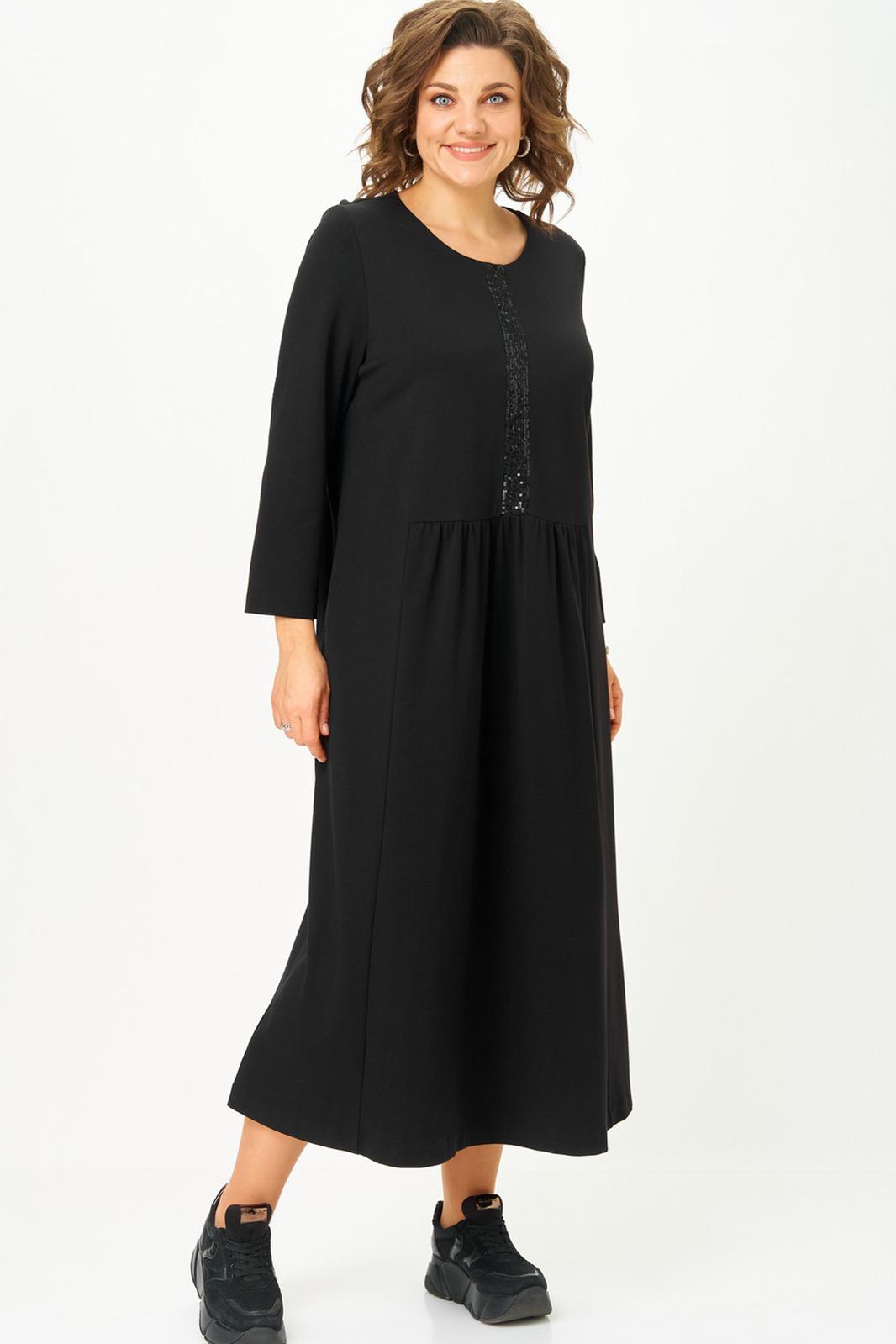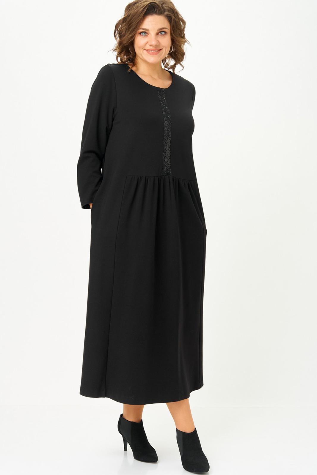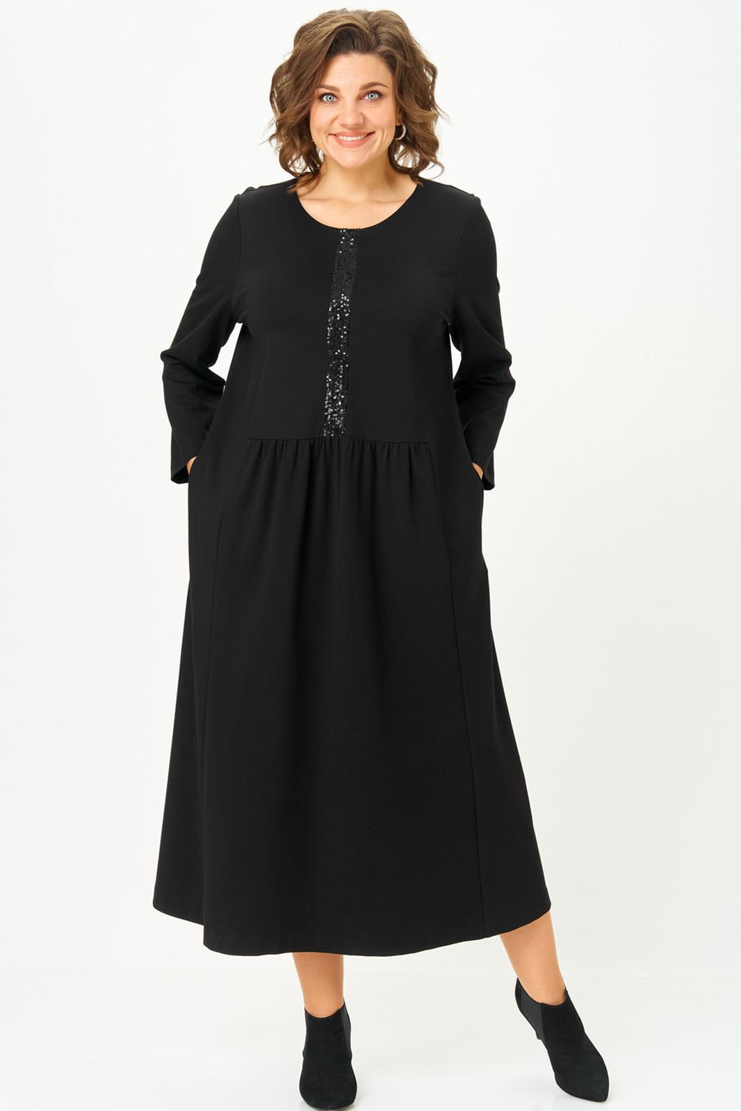 Платье женское свободного силуэта из трикотажного полотна. Модель длины - миди с изящной драпировкой по переду, с втачным рукавом длиной7/8. Горловина округлая. Верхняя часть переда украшена декоративной планкой с пайетками. Спинка цельная. В боковых швах обработаны карманы.