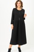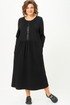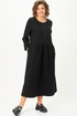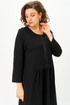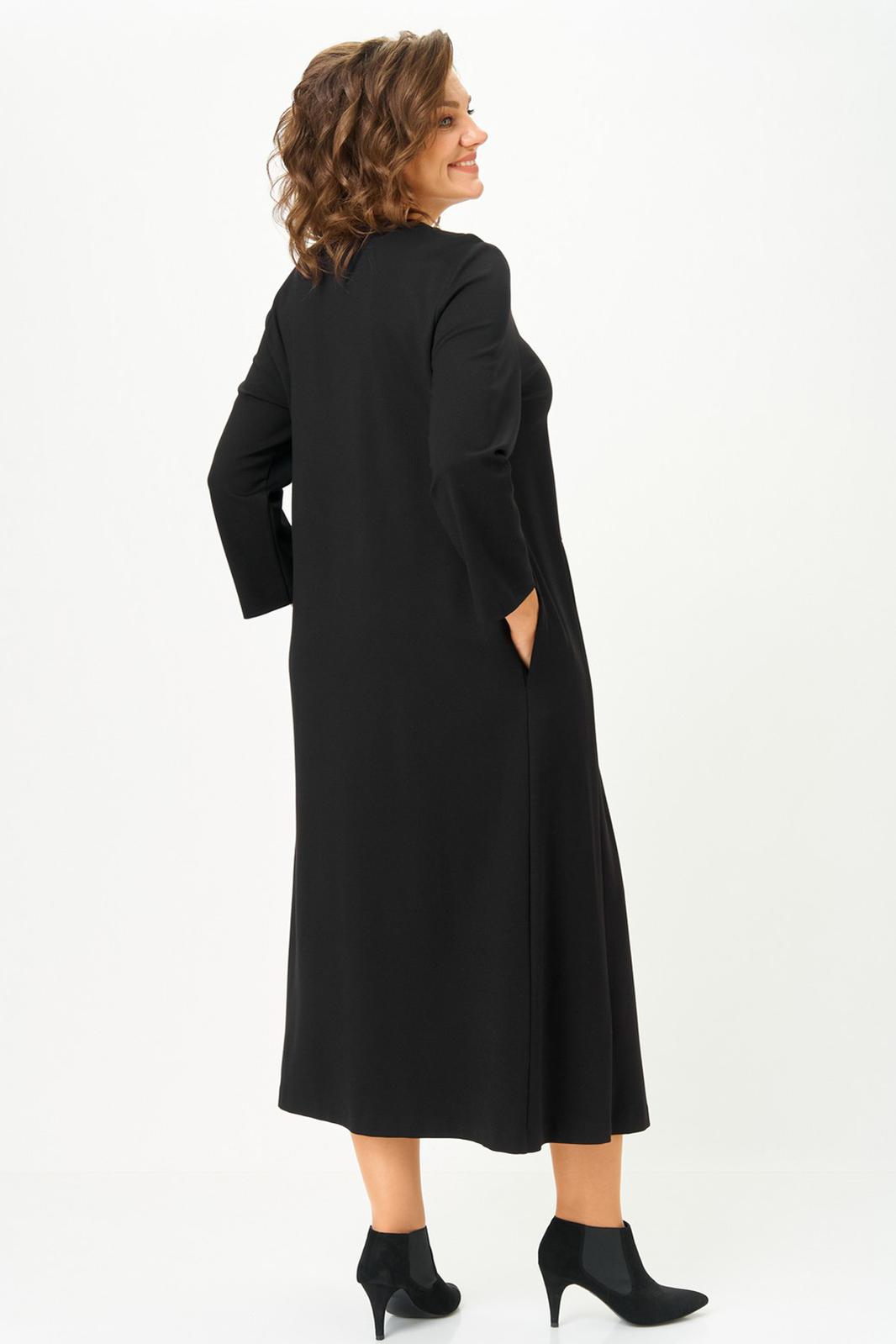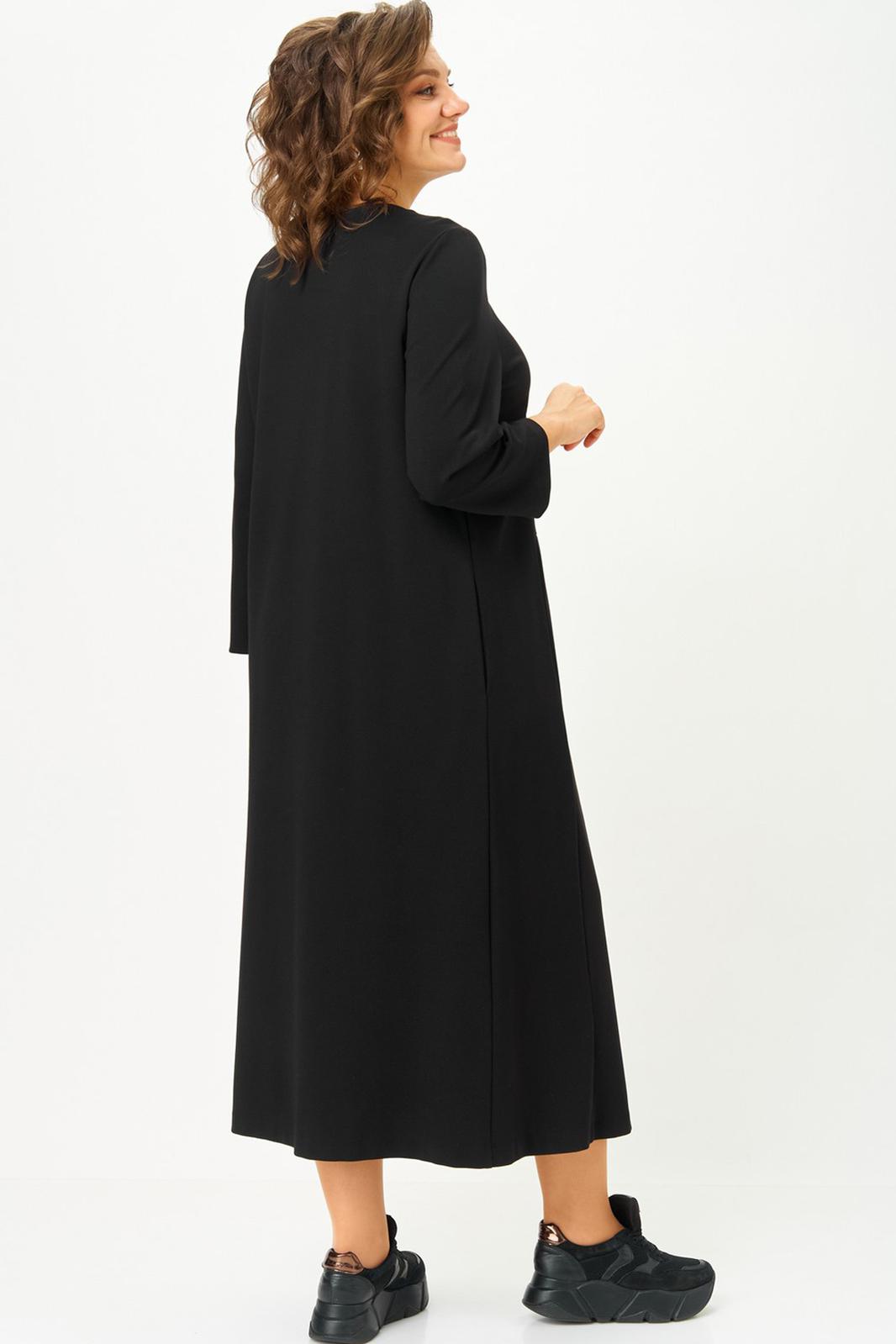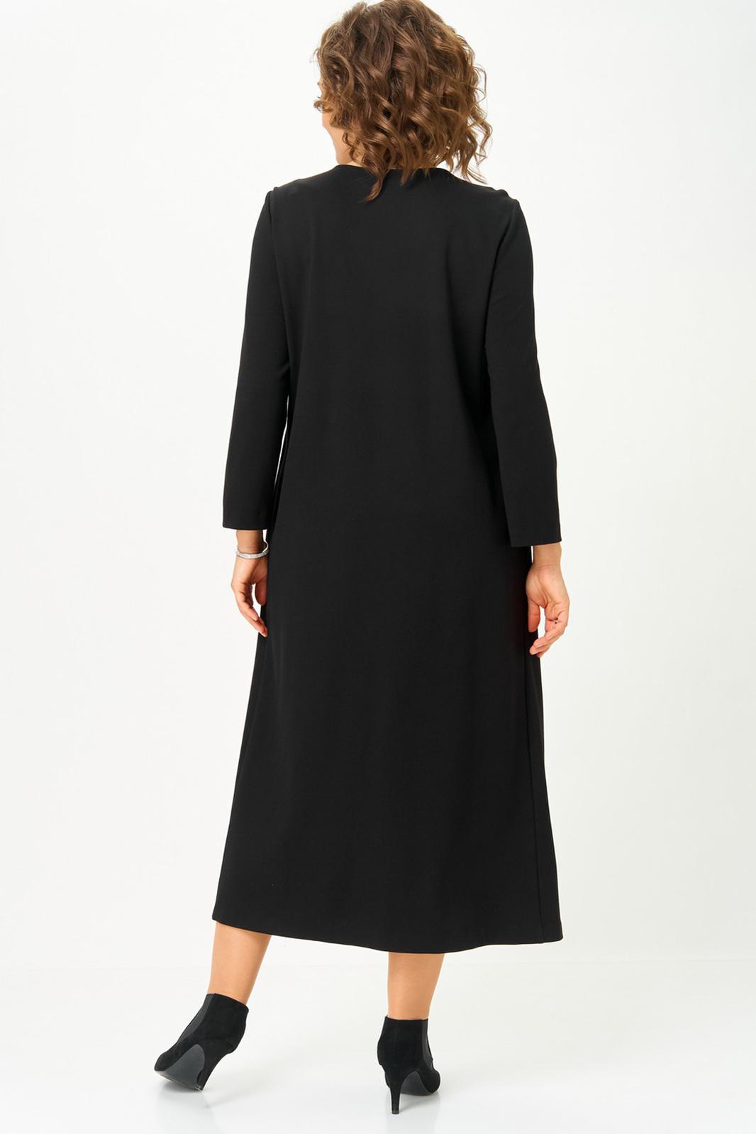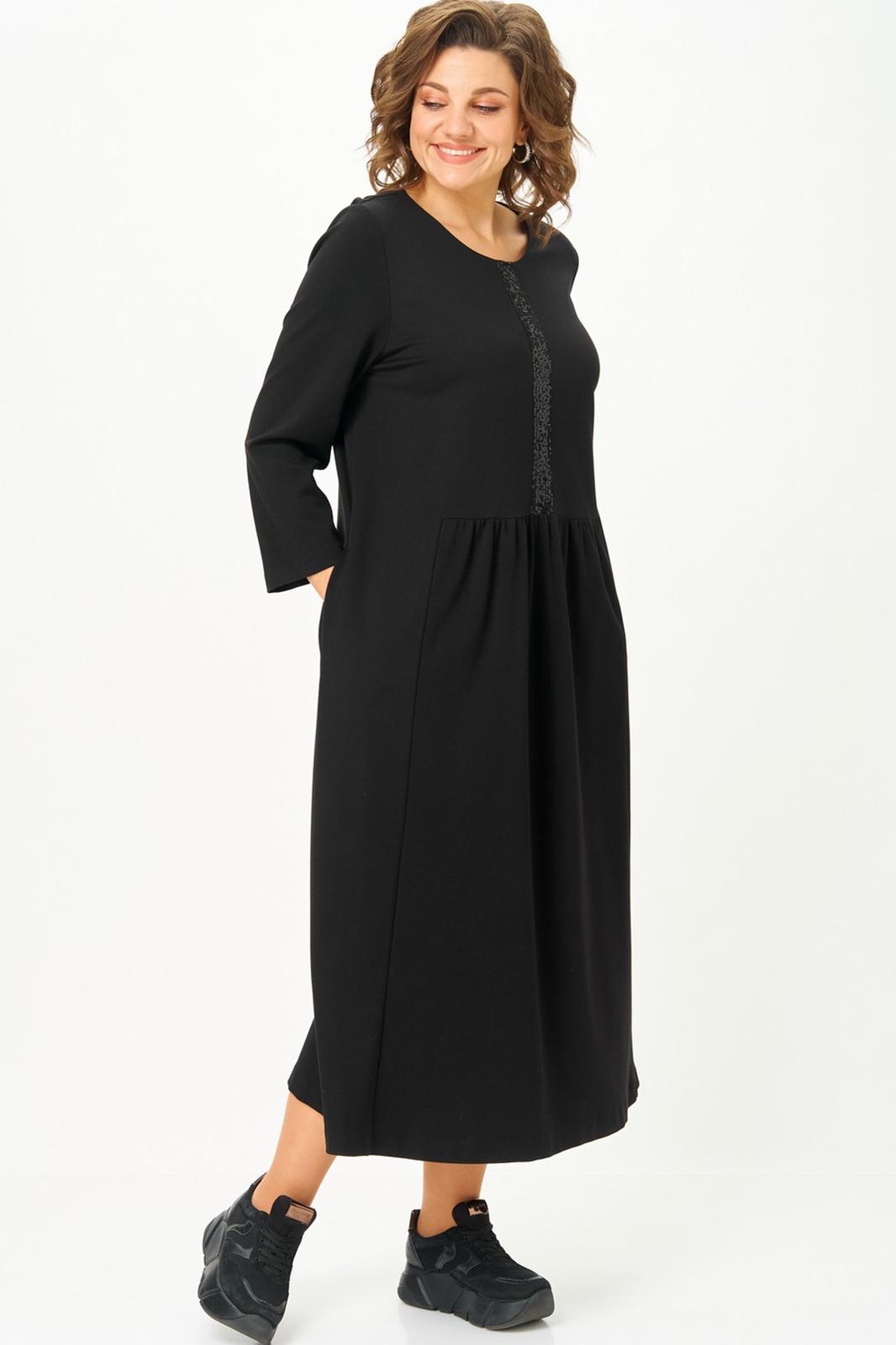 Платье женское свободного силуэта из трикотажного полотна. Модель длины - миди с изящной драпировкой по переду, с втачным рукавом длиной7/8. Горловина округлая. Верхняя часть переда украшена декоративной планкой с пайетками. Спинка цельная. В боковых швах обработаны карманы.
