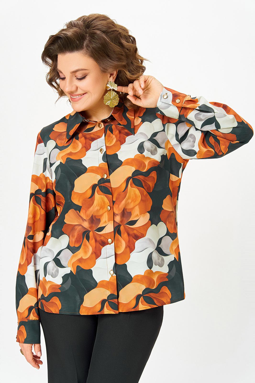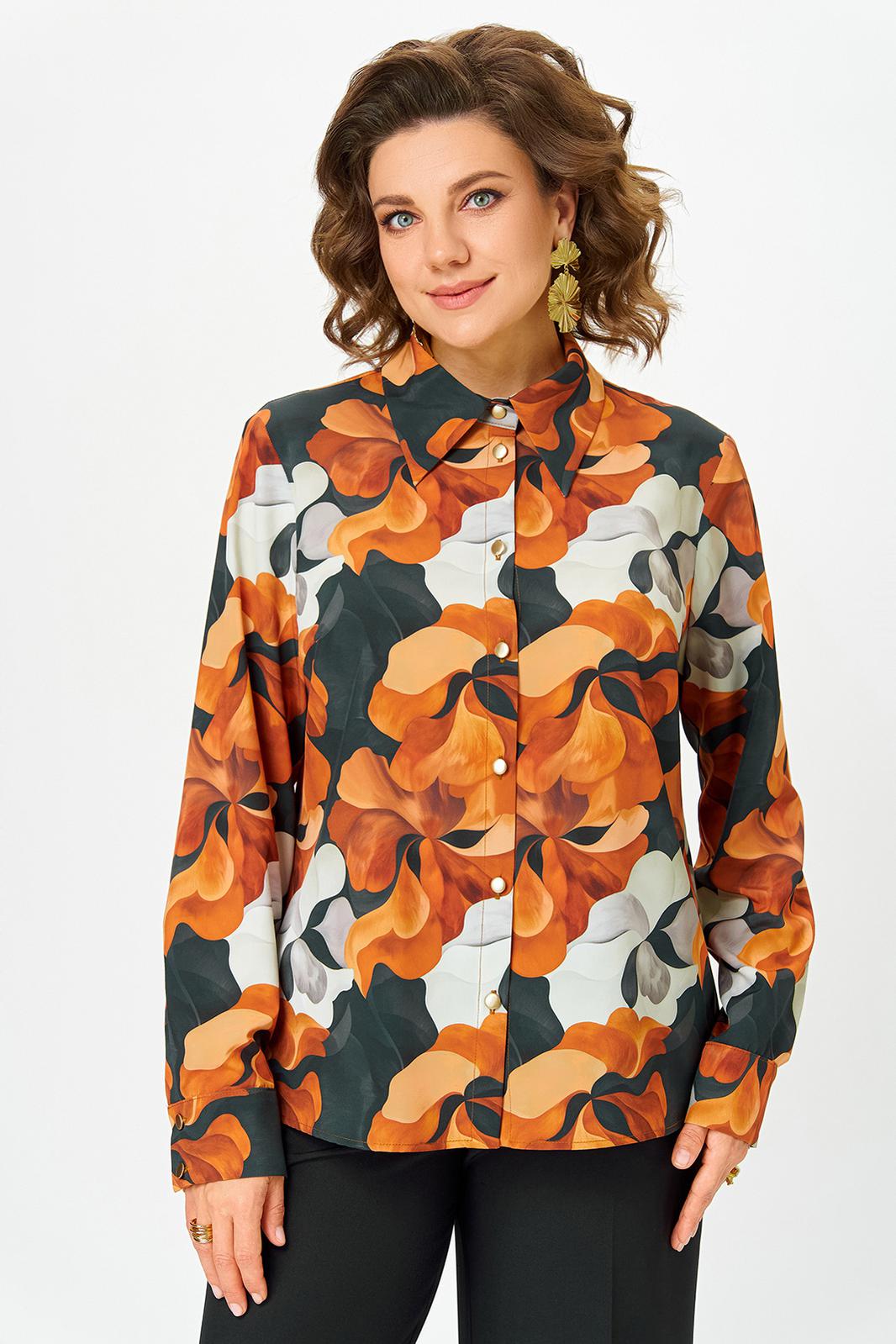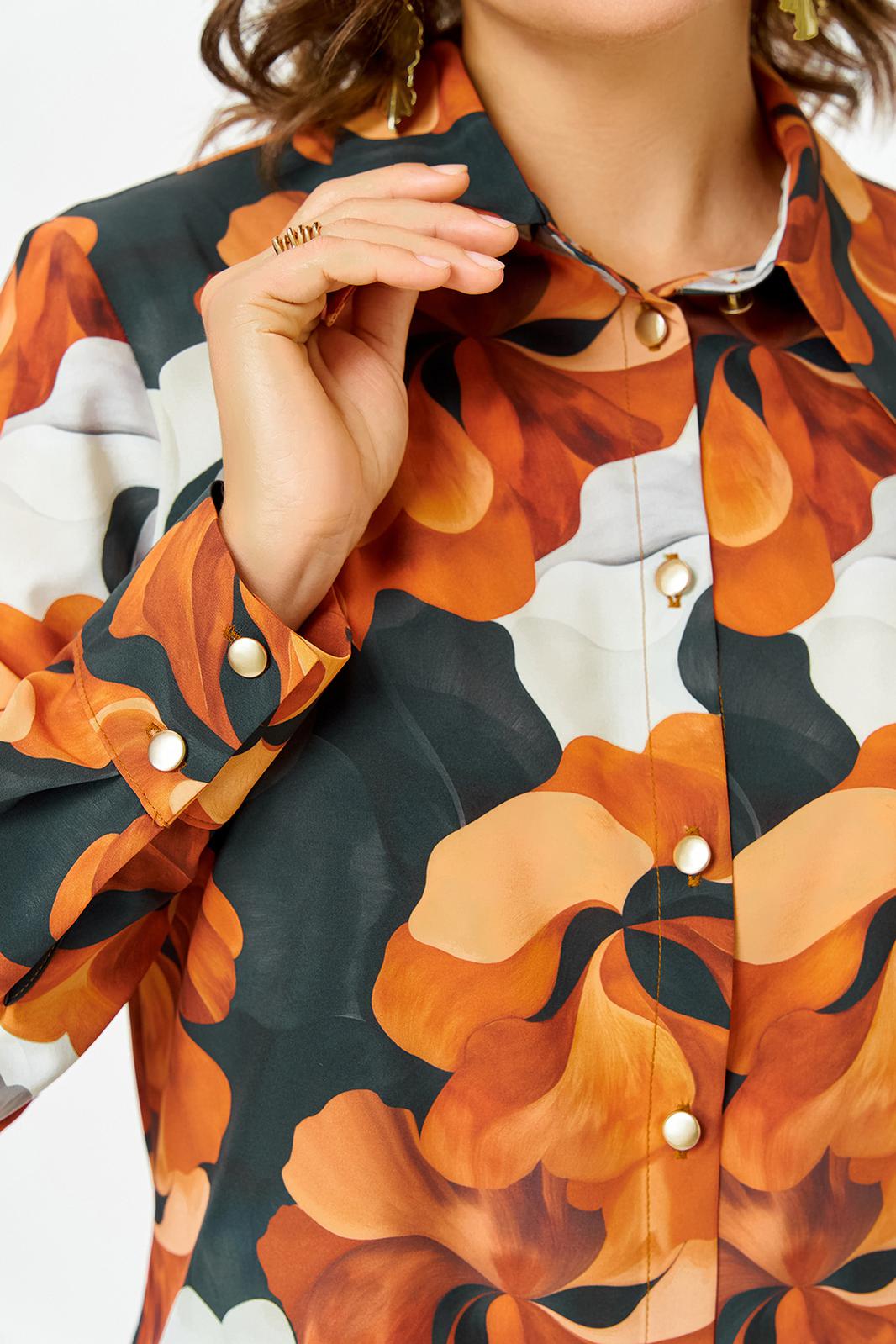 Блузка из нежной ткани «армани», имитирующей шёлк, прямого силуэта с центральной застёжкой на петли и декоративные пуговицы.