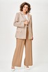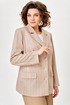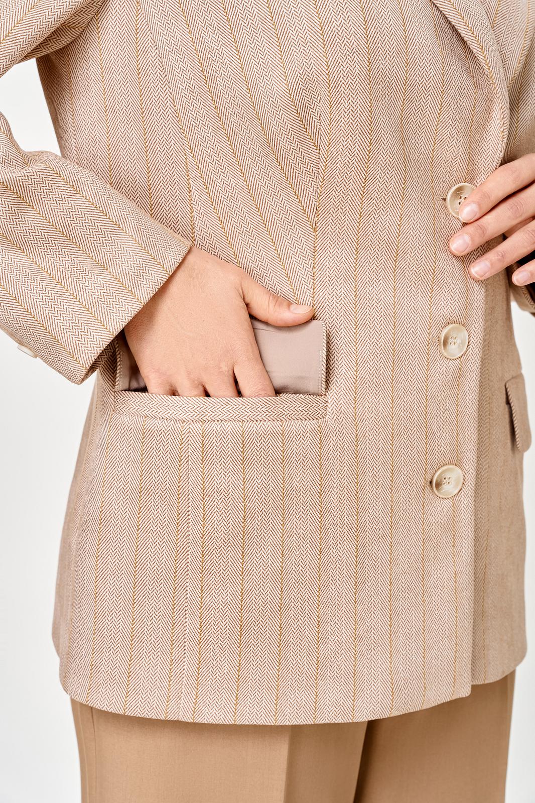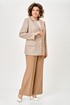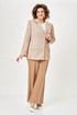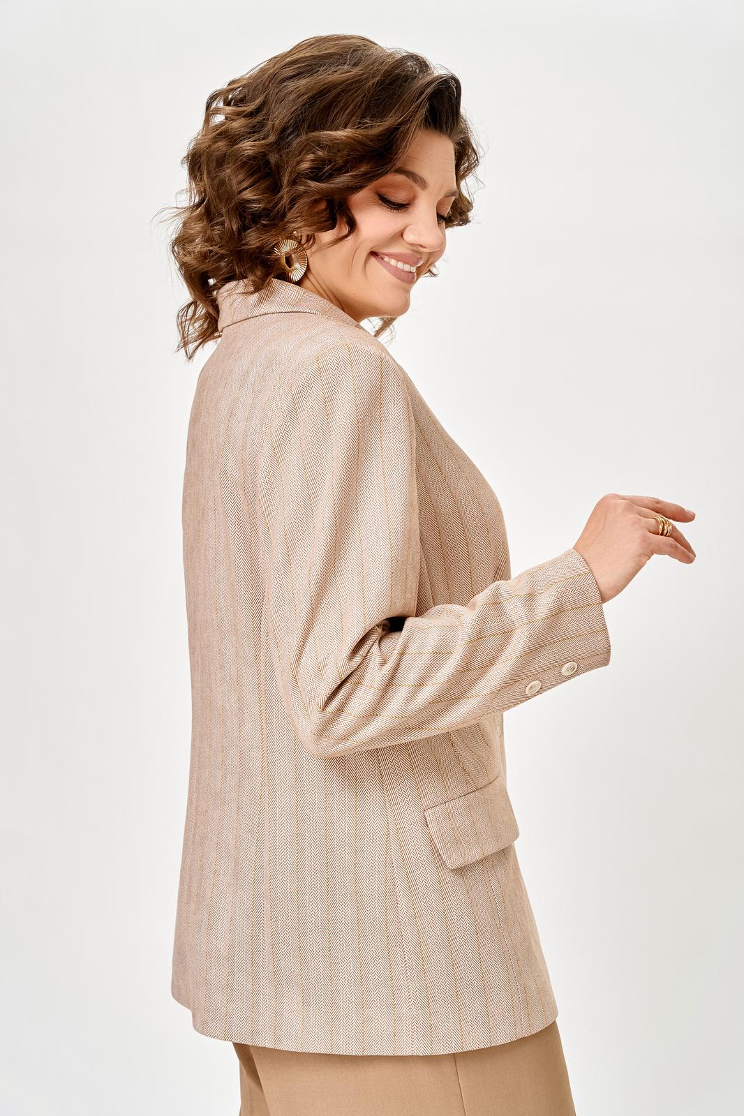 Жакет женский с трикотажной костюмной ткани, полуприлегающего силуэта, с центральной бортовой застежкой на три прорезные петли и три пуговицы; на притачной по низу изделия подкладке. Полочки - с отложными лацканами закруглённой формы; с вертикальными рельефами, идущими от проймы до низа; с вертикальными вытачками, идущими от груди до кармана; с прорезными карманами с клапаном и обтачкой; с прямыми бортами по линии низа. Спинка - со средним швом; с двумя рельефами, идущими от проймы до низа. Рукава - втачные, двухшовные, длинные, с имитацией шлицы декорированной двумя пуговицами. Воротник - втачной, отложной, на притачной стойке. Длина рукава 63 см. (+/-1) см