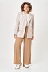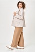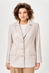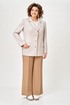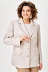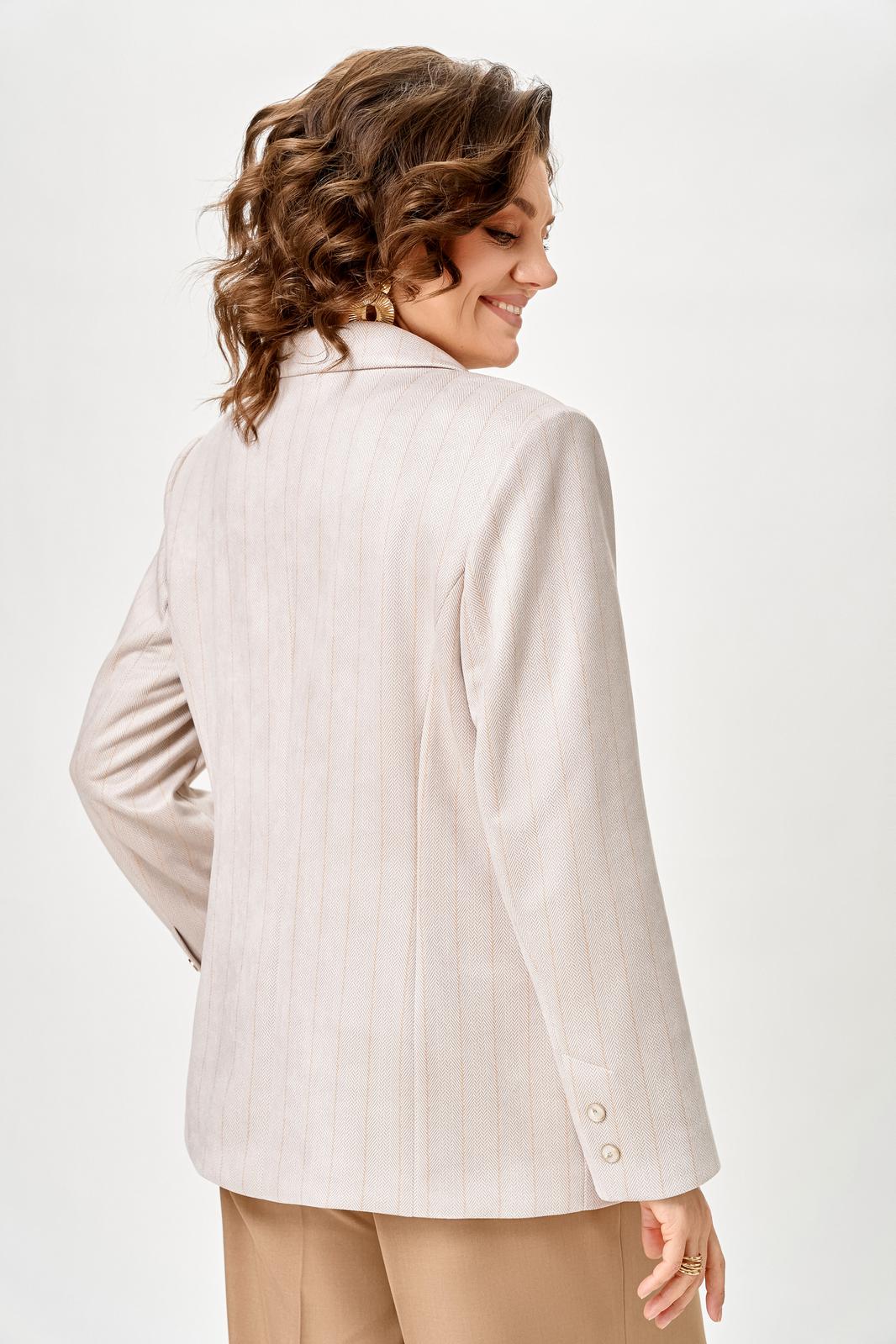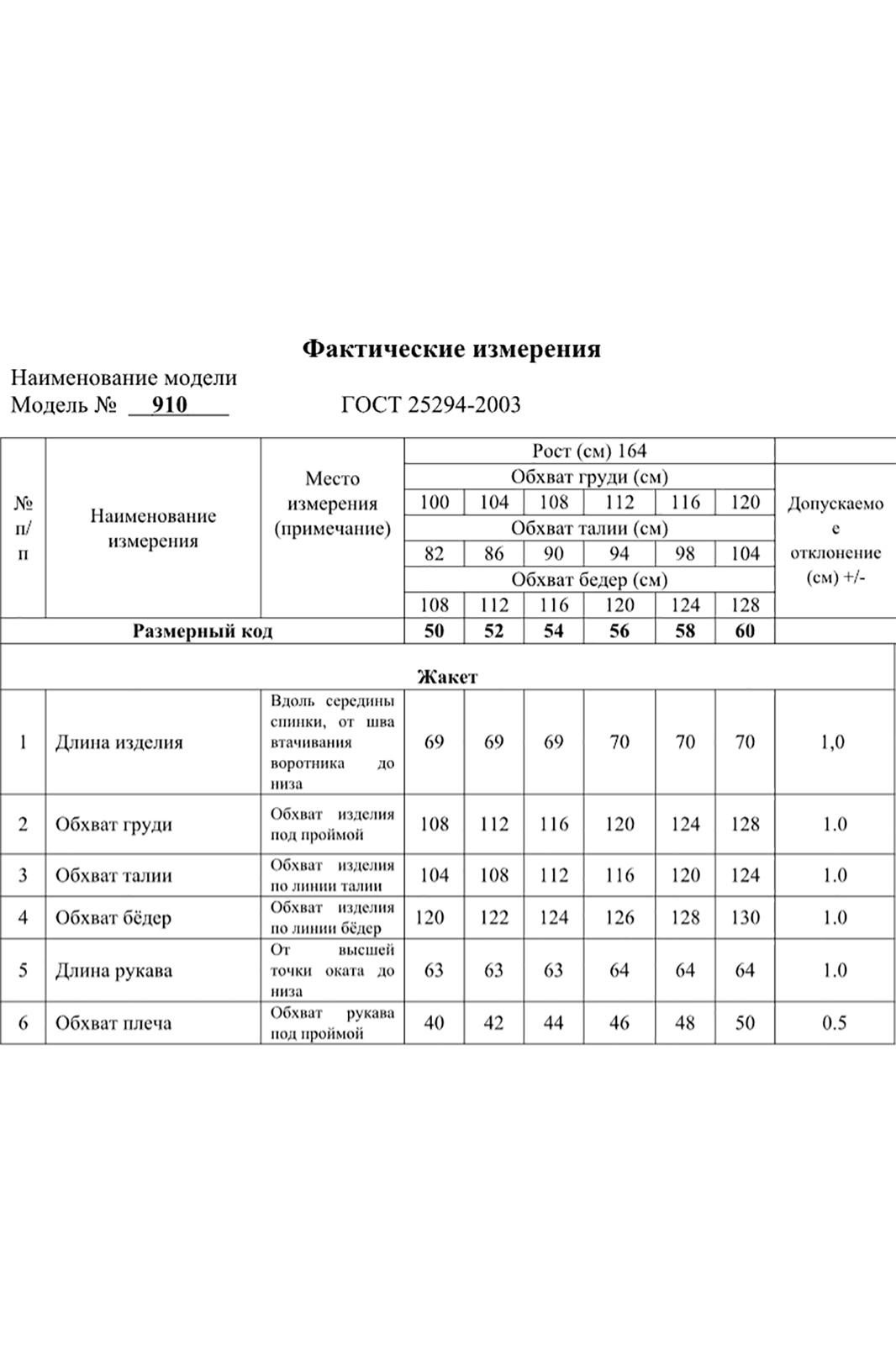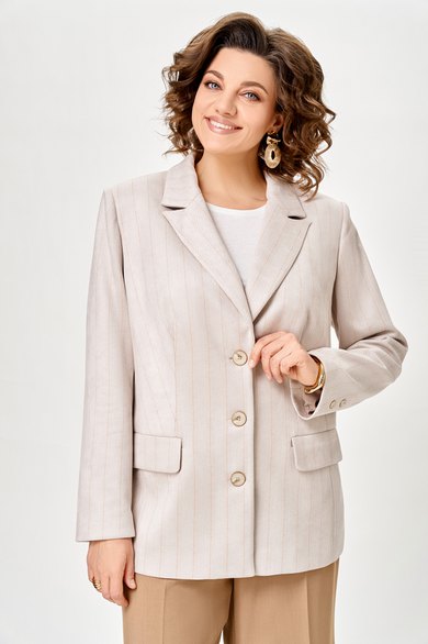Жакет женский с трикотажной костюмной ткани, полуприлегающего силуэта, с центральной бортовой застежкой на три прорезные петли и три пуговицы; на притачной по низу изделия подкладке. Полочки - с отложными лацканами закруглённой формы; с вертикальными рельефами, идущими от проймы до низа; с вертикальными вытачками, идущими от груди до кармана; с прорезными карманами с клапаном и обтачкой; с прямыми бортами по линии низа. Спинка - со средним швом; с двумя рельефами, идущими от проймы до низа. Рукава - втачные, двухшовные, длинные, с имитацией шлицы декорированной двумя пуговицами. Воротник - втачной, отложной, на притачной стойке. Длина рукава 63 см. (+/-1) см