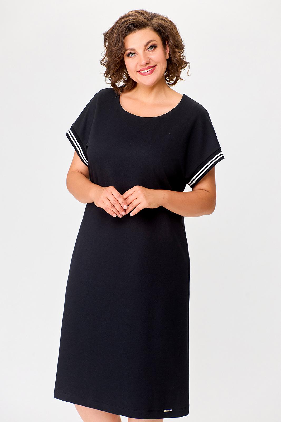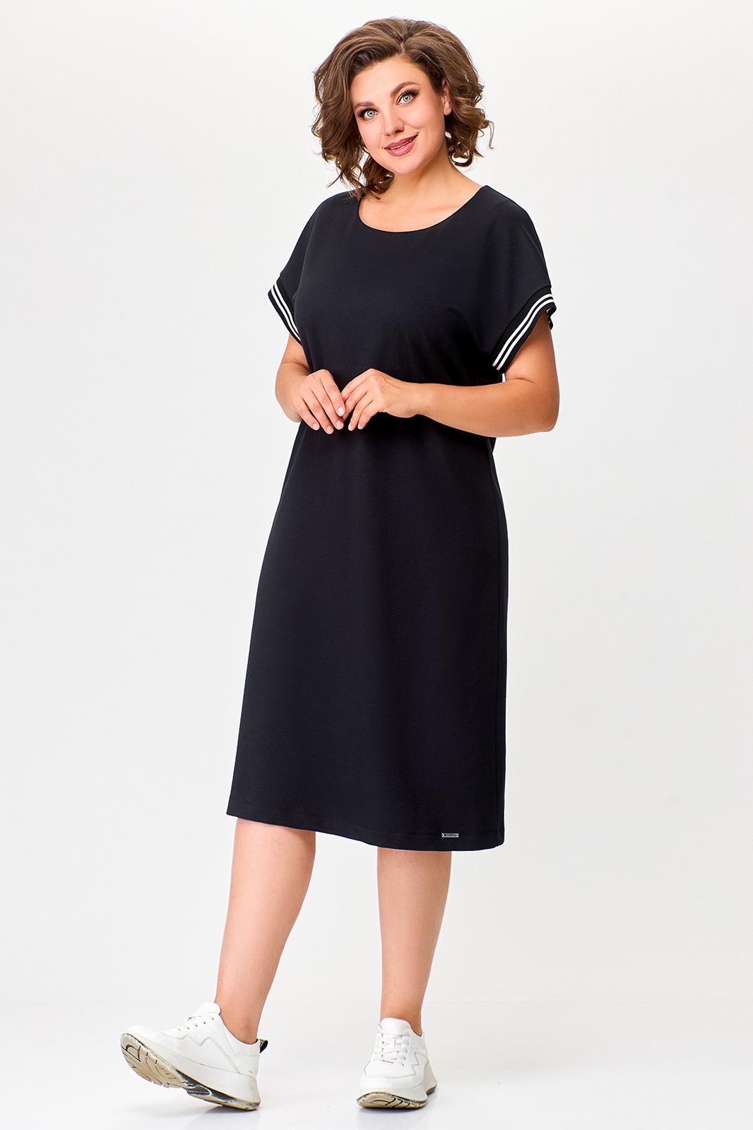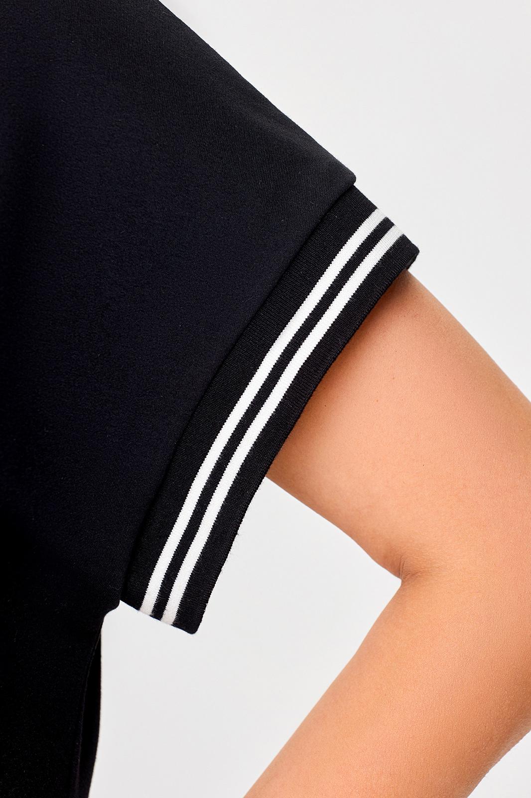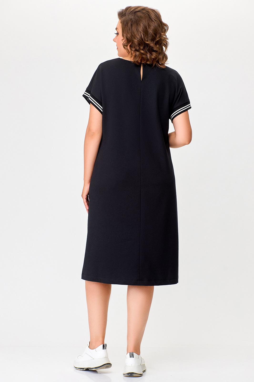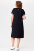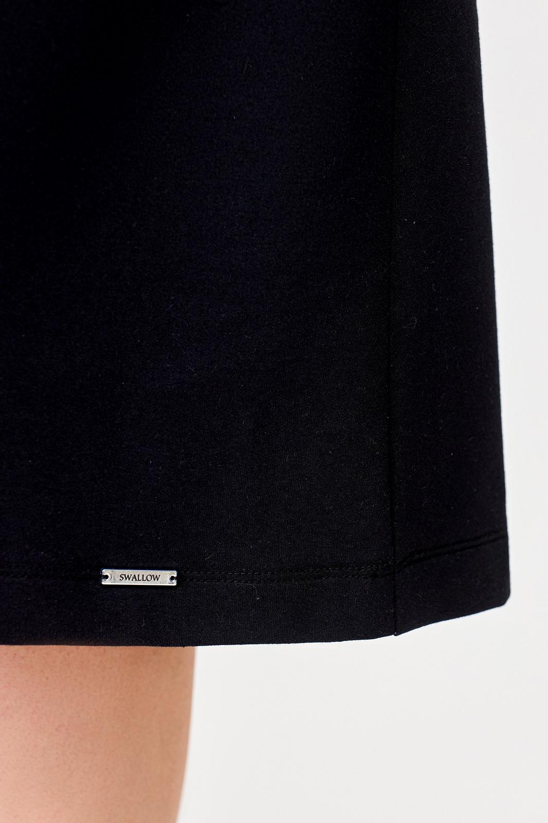 Платье из эластичного трикотажного полотна полуприлегающего силуэта. Перед цельнокроеный. Спинка со средним швом и разрезом с застёжкой на навесную петлю и потайную пуговицу по горловине. Рукав цельнокроеный короткий с манжетой из декоративного трикотажного довяза. В боковых швах обработаны карманы.По низу платя пришита фирменная эмблема «S W А L L O W».