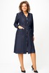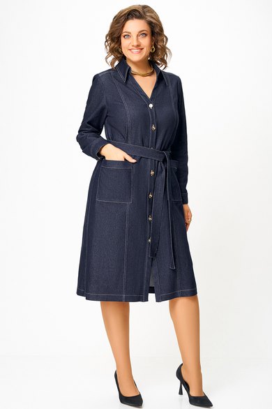 Платье из джинсовой ткани прямого силуэта с центральной застёжкой на петли и джинсовые пуговицы. Полочки с притачными фигурными планками, с рельефным швом и кокеткой, на уровне бёдер накладной карман с планкой и фирменной нашивкой «Swallow».