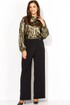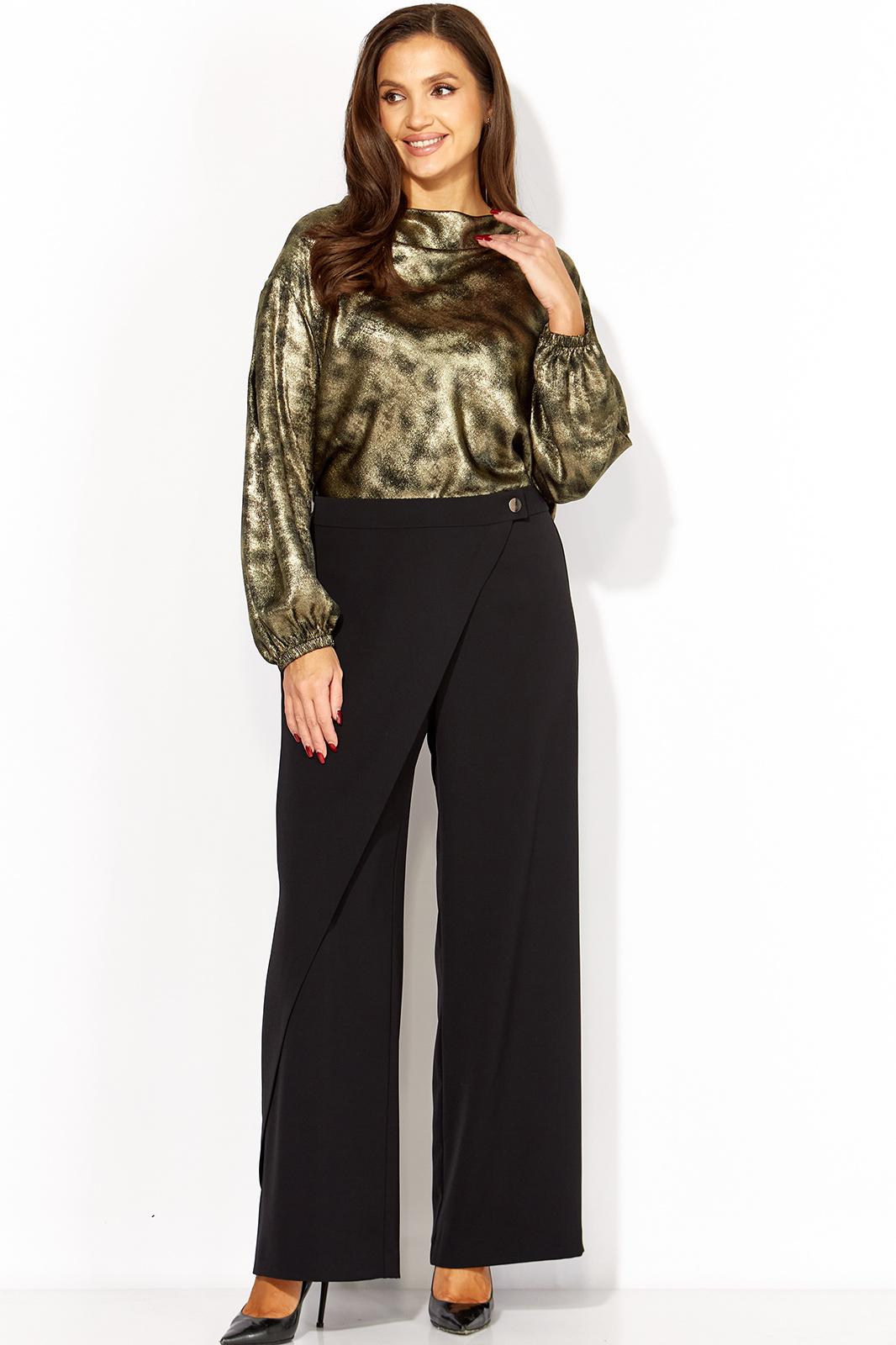 Брюки прямые, из текстильной ткани, с отлетной деталью по переду, закрепленной на отделочную кнопку. застежка брюк спереди на тесьму молния и петлю с пуговицей. Пояс отрезной, по переду гладкий, сзади на резинке.