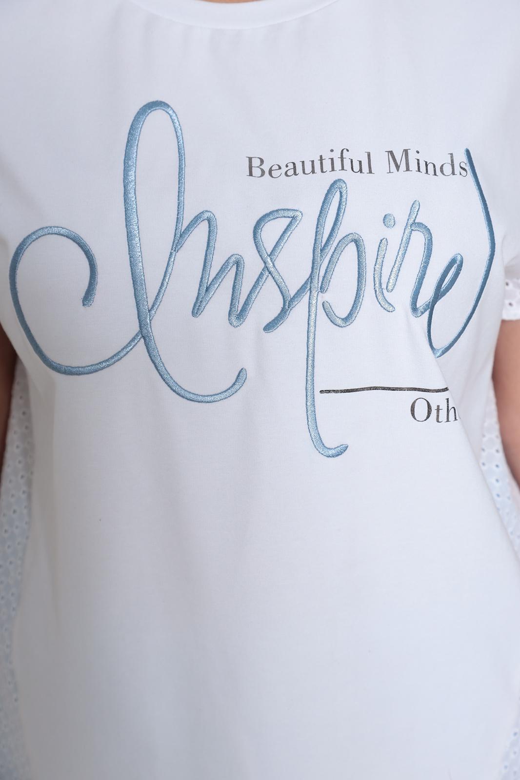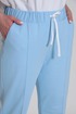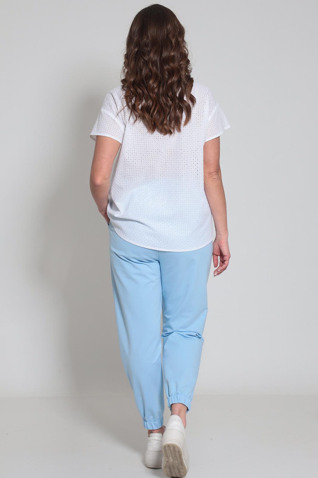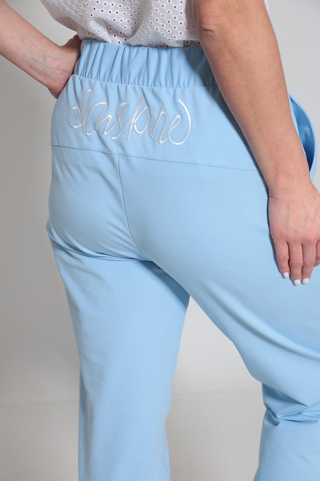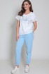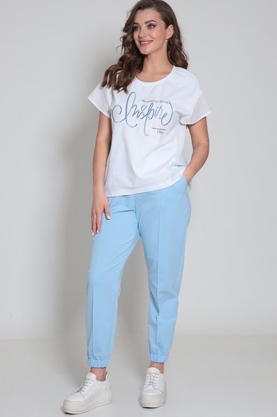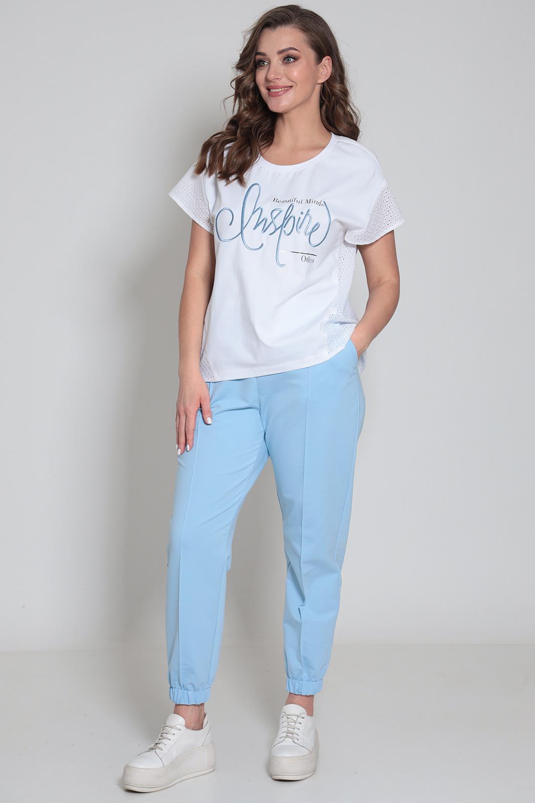Модный женский комплект в стиле спорт-шик. Футболка прямого силуэта с коротким рукавом. Рукав со спущенной линией плеча. Вырез горловины круглой формы с подрезной бейкой. Футболка выполнена из двух видов ткани: перед - трикотажное полотно, спинка и рукава - хлопковое шитье. Перед задекорирован яркой вышивкой и принтом. Брюки прямые, снизу на резинке. Спереди вертикальные защипы. По бокам наклонные функциональные карманы. Сзади отрезная кокетка фигурной формы, задекорированная вышивкой. Пояс притачной с резинкой.