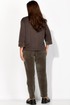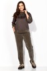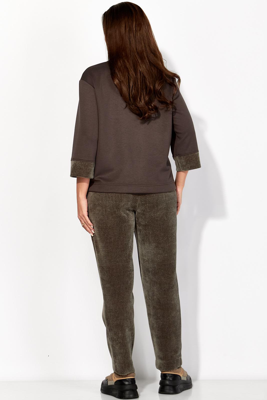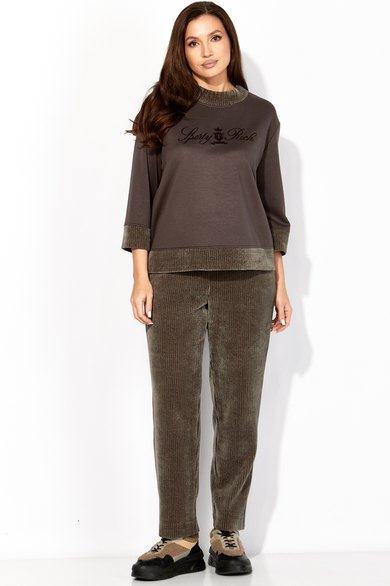 Комплект женский, 2х предметный, состоящий из джемпера и брюк, в сочетании двух видов трикотажного полотна. Джемпер прямого силуэта, с рукавом длинной 3/4. Рукав со спущенной линией плеча. По низу отрезная манжета. Горловина круглой формы, с широкой подрезной бейкой. По низу переда отрезная планка. Перед задекорирован принтом. Манжеты рукавов, бейка горловины и планка низа из отделочного трикотажного полотна. Спинка без особенностей. Брюки прямые. По переду наклонные карманы. Пояс притачной с резинкой и кулисой.