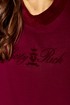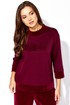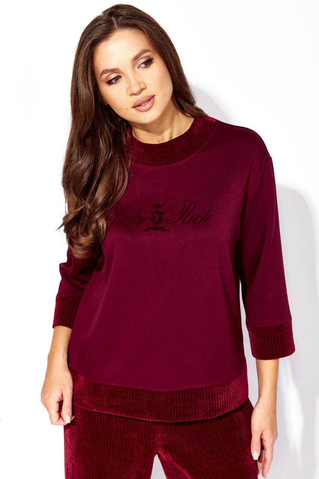 Комплект женский, 2х предметный, состоящий из джемпера и брюк, в сочетании двух видов трикотажного полотна. Джемпер прямого силуэта, с рукавом длинной 3/4. Рукав со спущенной линией плеча. По низу отрезная манжета. Горловина круглой формы, с широкой подрезной бейкой. По низу переда отрезная планка. Перед задекорирован принтом. Манжеты рукавов, бейка горловины и планка низа из отделочного трикотажного полотна. Спинка без особенностей. Брюки прямые. По переду наклонные карманы. Пояс притачной с резинкой и кулисой.
