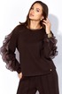 Комплект женский, 2х предметный, состоящий из джемпера и брюк, из трикотажного полотна. Джемпер прямого силуэта, с длинным рукавом. Рукава с чуть спущенной линией плеча, по низу на манжете, задекорирован по центру тремя рядами рюш из отделочной ткани. Вырез горловины круглой формы, с отделочной бейкой по переду. По низу переда подрезная планка. Спинка без особенностей. Брюки прямые, широкие. По переду по три ряда широких, застроченных на ребро рельефов и функциональные карманы. Пояс притачной с резинкой по кругу.