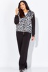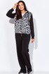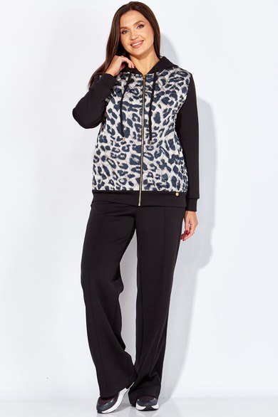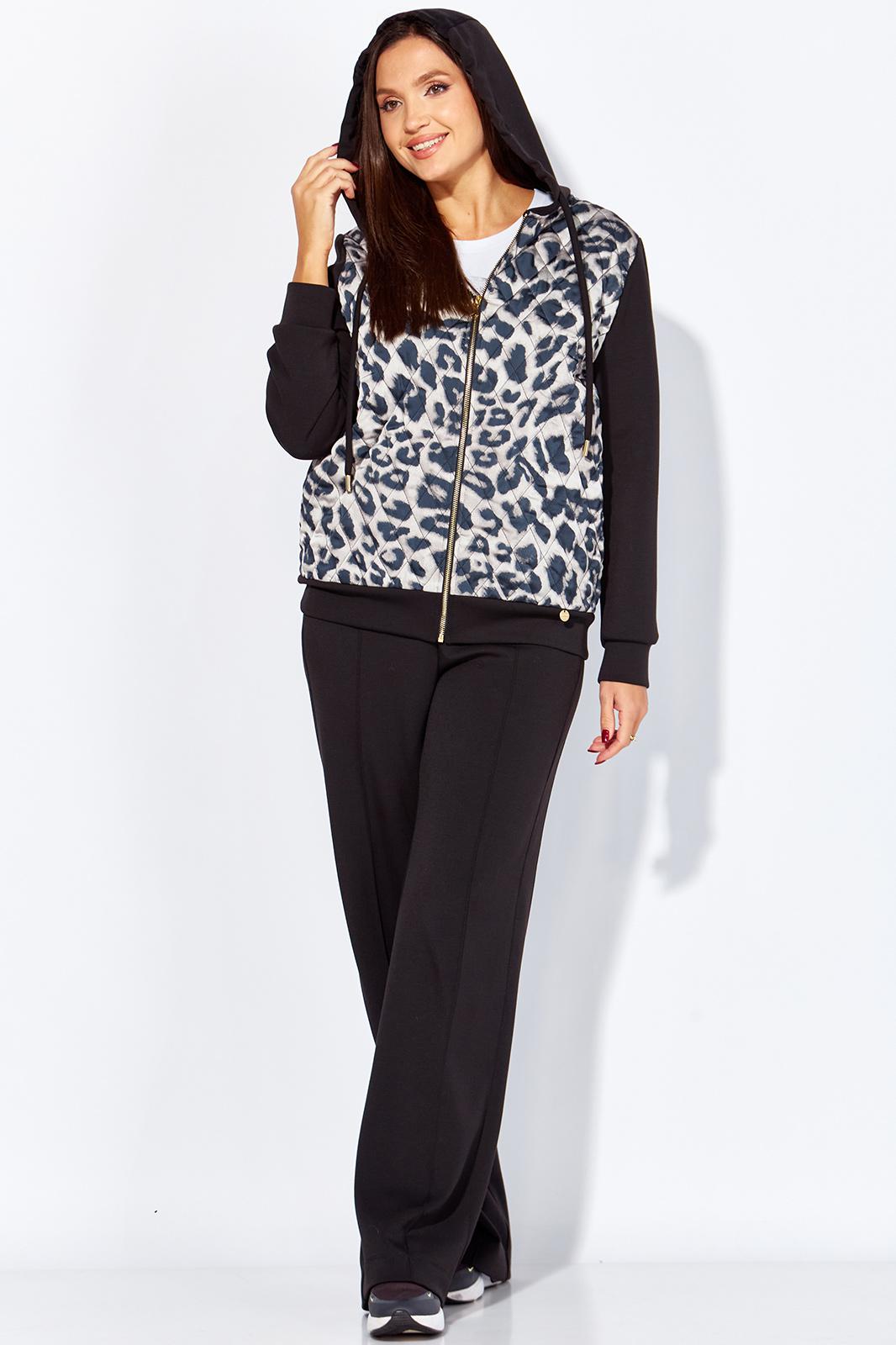 Комплект женский, 2х предметный, состоящий из куртки и брюк, из стежки и трикотажного полотна. Куртка прямого силуэта, по низу на манжете. Перед и спинка выполнены из стеганной на синтепоне, с подкладкой, принтованной текстильной ткани. Карманы в боковых швах. Рукав втачной, длинный, по низу на манжете. Горловина оформлена капюшоном с кулисой. Застежка центральная на тесьму молния. Брюки широкие, прямые. По боку подрезной лампас с отделочной строчкой и карманы. По центру переда прострочены защипы (стрелка) Капюшон, рукава, манжет низа куртки и брюки из трикотажного полотна.