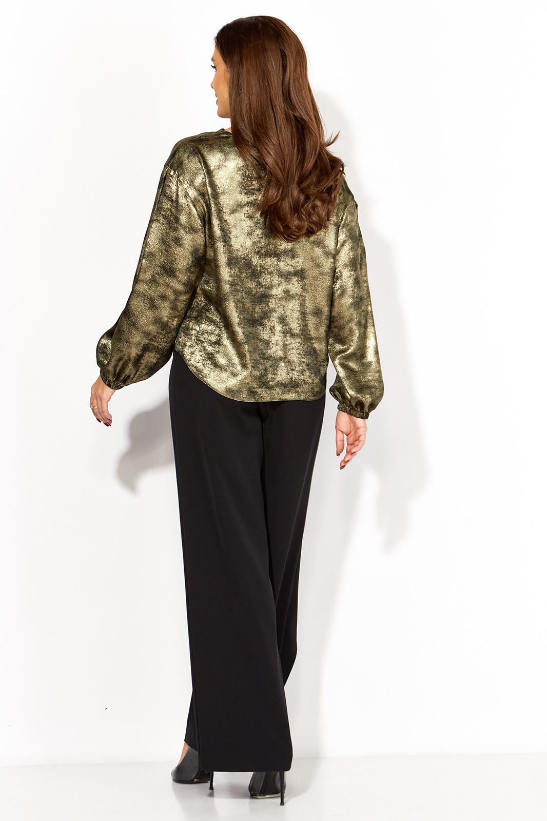 Комплект женский, 2х предметный, состоящий из блузки и брюк. Блузка прямого силуэта с длинным рукавом. Рукав со спущенной линией плеча, мягкой складкой и резинкой по низу. Вырез горловины лодочка По переду в области горловины, мягкие складки (качели) Низ блузки ажурной формы. Брюки прямые, из текстильной ткани, с отлетной деталью по переду, закрепленной на отделочную кнопку. застежка брюк спереди на тесьму молния и петлю с пуговицей. Пояс отрезной, по переду гладкий, сзади на резинке.