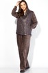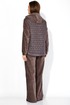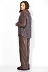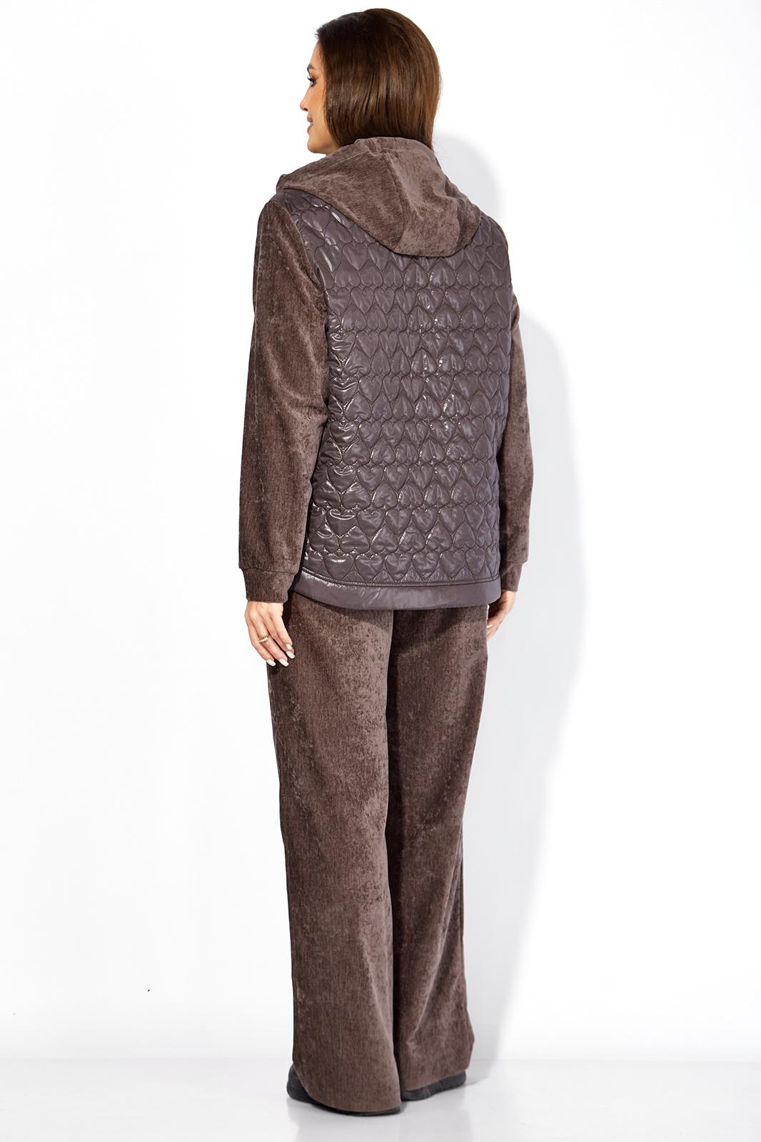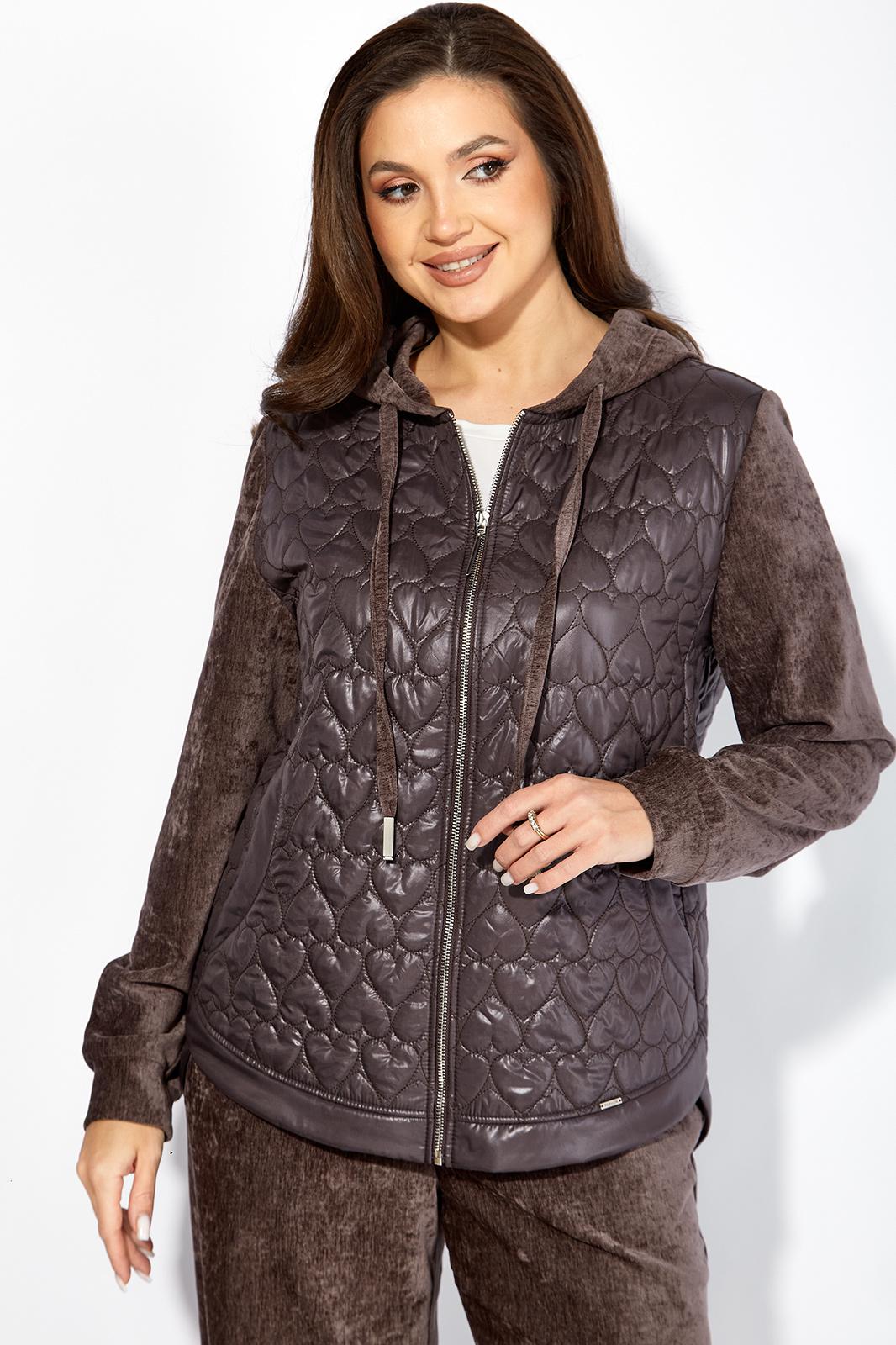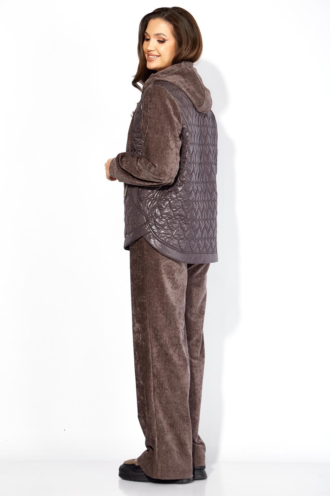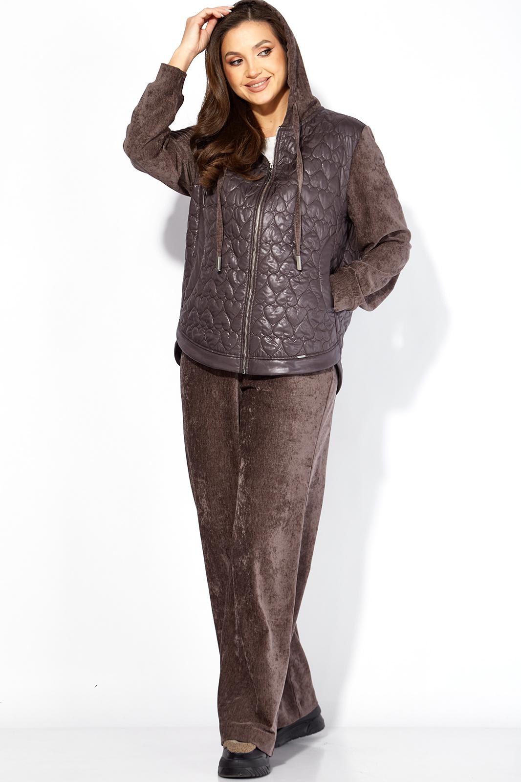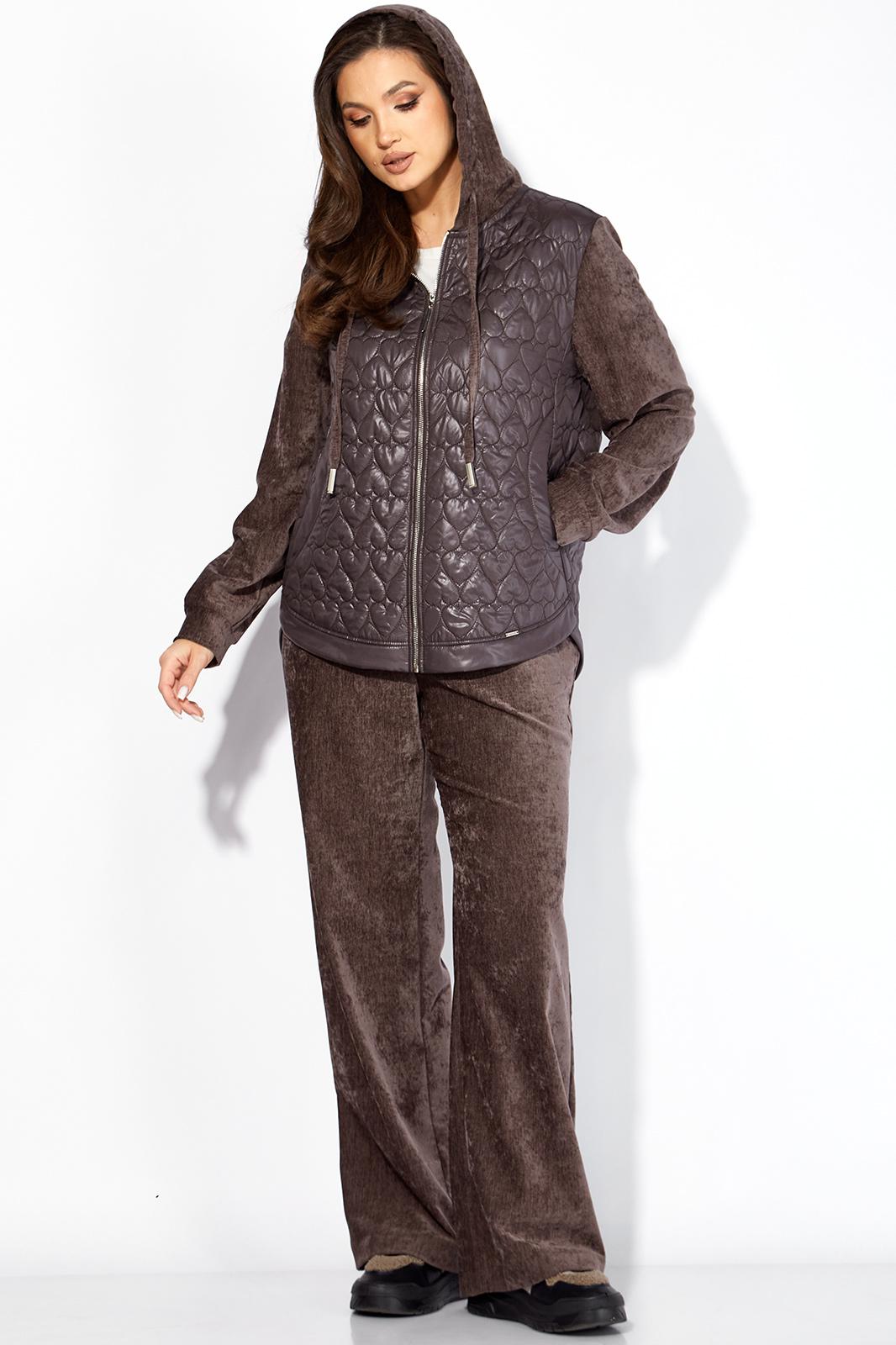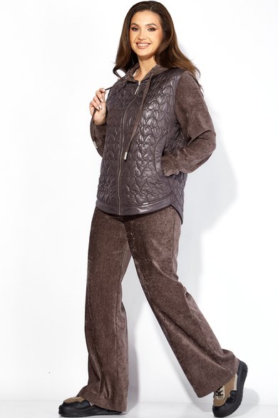 Комплект женский, 2х предметный, состоящий из куртки и брюк, выполнен из двух видов материала. Куртка с сочетании плащевки стеганой на синтепоне и Миланский вельвет со стрейчем. По переду рельефы из пройм, карманы. Вход в карман закругленной формы с отрезной планкой. Застежка центральная на тесьму молния Низ куртки фигурной формы, по спинке удлиннен, с отрезной планкой. Рукав длинный, втачной, по низу на манжете. Горловина оформлена капюшоном с кулисой по краю . Брюки прямые, выполнены из ткани Миланский вельвет. По переду наклонные карманы. Пояс притачной с резинкой по кругу.