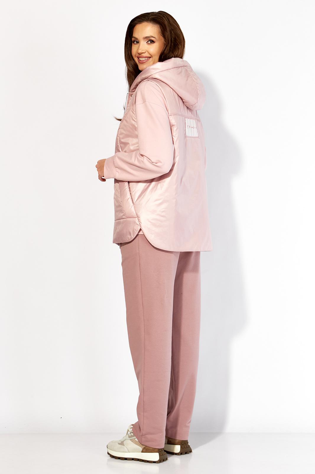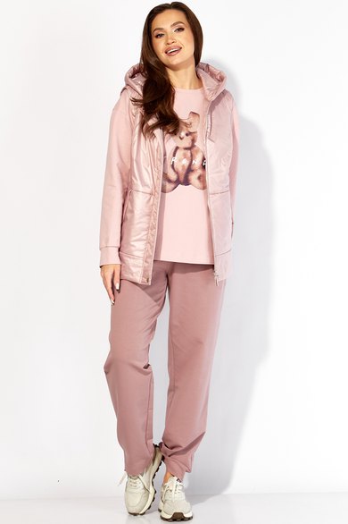 Комплект женский, 3х предметный, состоящий из свитшота, брюк и жилета. Свитшот прямого силуэта с длинным рукавом. Рукав со спущенной линией плеча, снизу на манжете. По переду рельефы. Центр задекорирован принтом. Горловина круглая , с подрезной бейкой. Спинка со средним швом. По низу спинки, фигурной формы манжета, переходящая на перед. Брюки прямые. По переду карманы и мягкие складки. Пояс притачной, на резинке, с гладкой центральной частью. Костюм- трикотажное полотно 2х нитка . Жилет из плащевки на синтепоне( V S 100 ) и на подкладке. По переду рельефы и карманы в подрезах. Горловина оформлена капюшоном. Застежка центральная, на тесьму молния закрытая планкой, закрепленной кнопками. По спинке кокетка и нашивка с принтом.