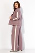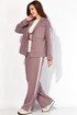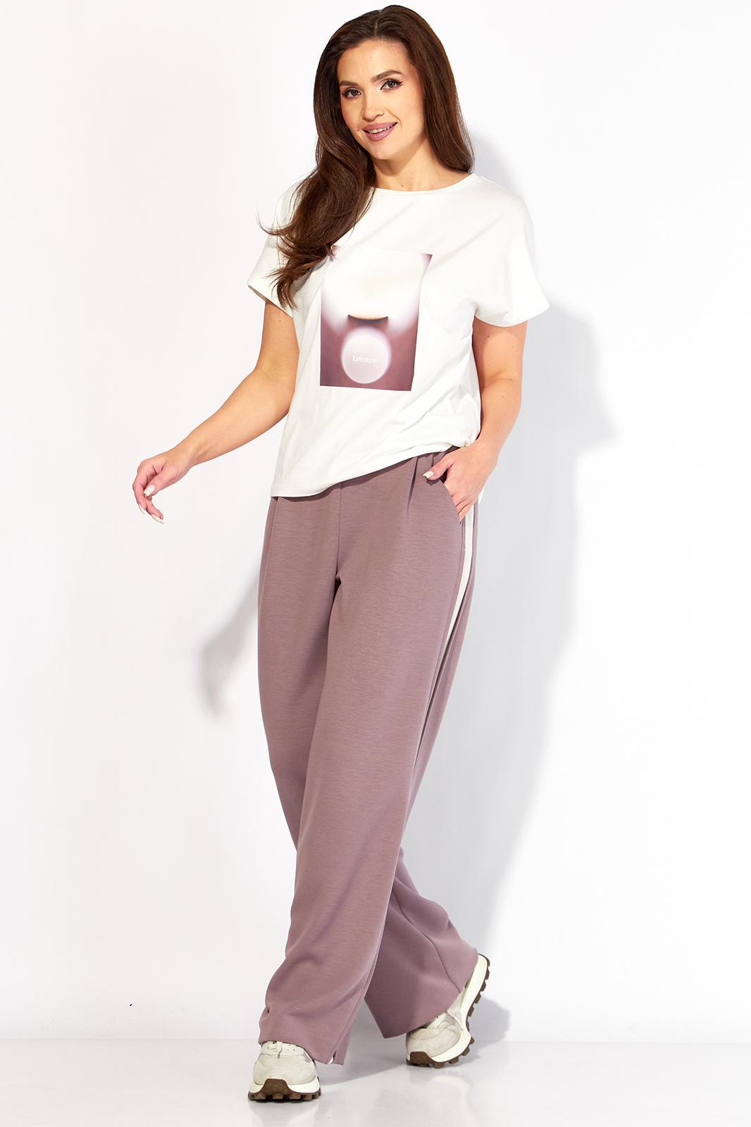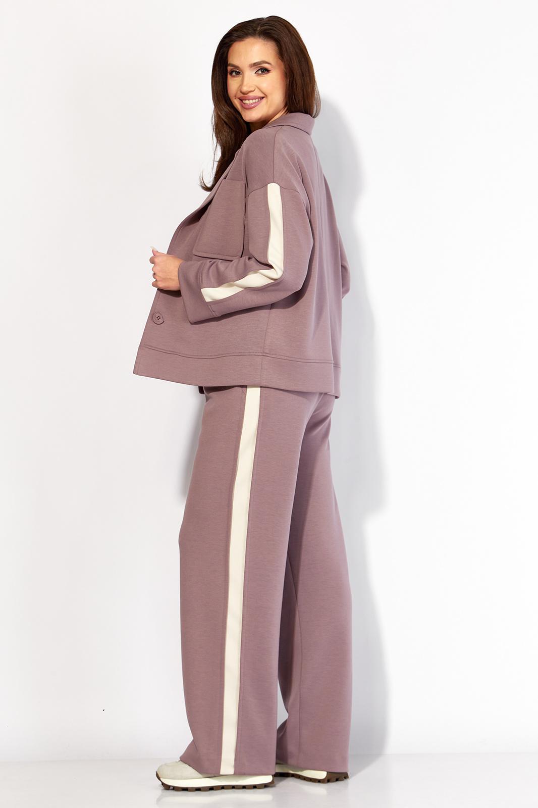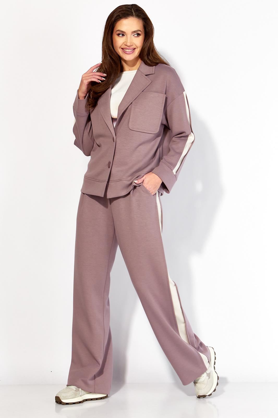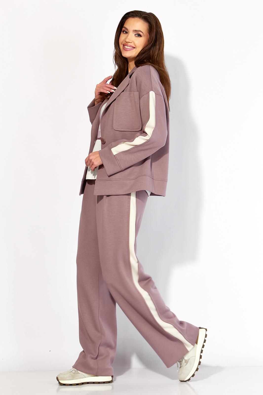 Комплект женский, 3х предметный, состоящий из жакета, топа и брюк. Жакет и брюки выполнены из трикотажного полотна T E N S E L, топ-хлопковый трикотаж (кулирка). Жакет прямого силуэта с длинным рукавом. Рукав со спущенной линией плеча, по низу манжета. По рукаву отделочный лампас со складками. Воротник отложной с лацканами. Застежка центральная на петли и пуговицы. На левой полочке накладной карман. По низу жакета отрезная планка. Спинка со средним швом. Брюки прямые, с наклонными карманами спереди и мягкими складками. По боку отделочный лампас со складками. Пояс притачной, с резинкой и гладкой центральной частью. Топ прямого силуэта, с коротким цельнокройным рукавом. Горловина круглая, с отрезной планкой. По переду топа яркий принт