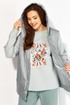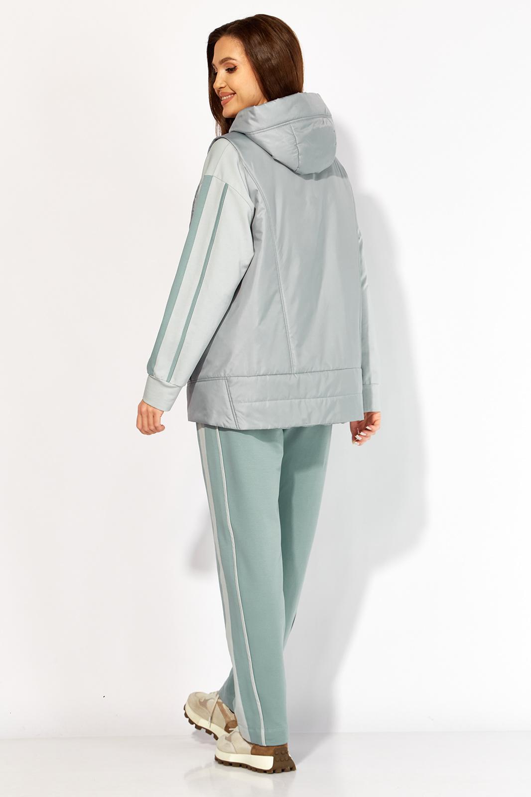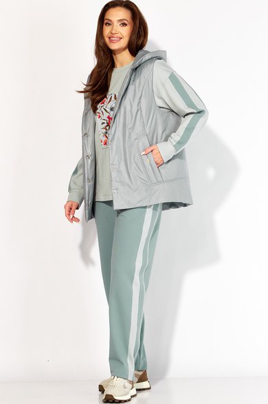 Комплект женский 3х предметный, состоящий из жилета, свитшота и брюк. Жилет прямого силуэта, из плащевки на синтепоне, на подкладке. По переду рельефы из пройм, переходящие в подрез по низу. В рельефах карманы с фигурными листочками. По спинке рельефы из пройм и подрез по низу с отделочной строчкой. Горловина оформлена капюшоном с планкой. Застежка центральная на кнопки. Костюм выполнен из трикотажного полотна (2х нитка) Свитшот прямого силуэта с длинным рукавом. Рукав со спущенной линией плеча и манжета по низу. На рукаве отделочные лампасы и кант. Горловина круглая с отрезной бейкой. По переду яркий принт. Спинка без особенностей. Брюки зауженные к низу с карманами по переду. По бокам отделочные лампасы и кант. Пояс притачной с резинкой по кругу,