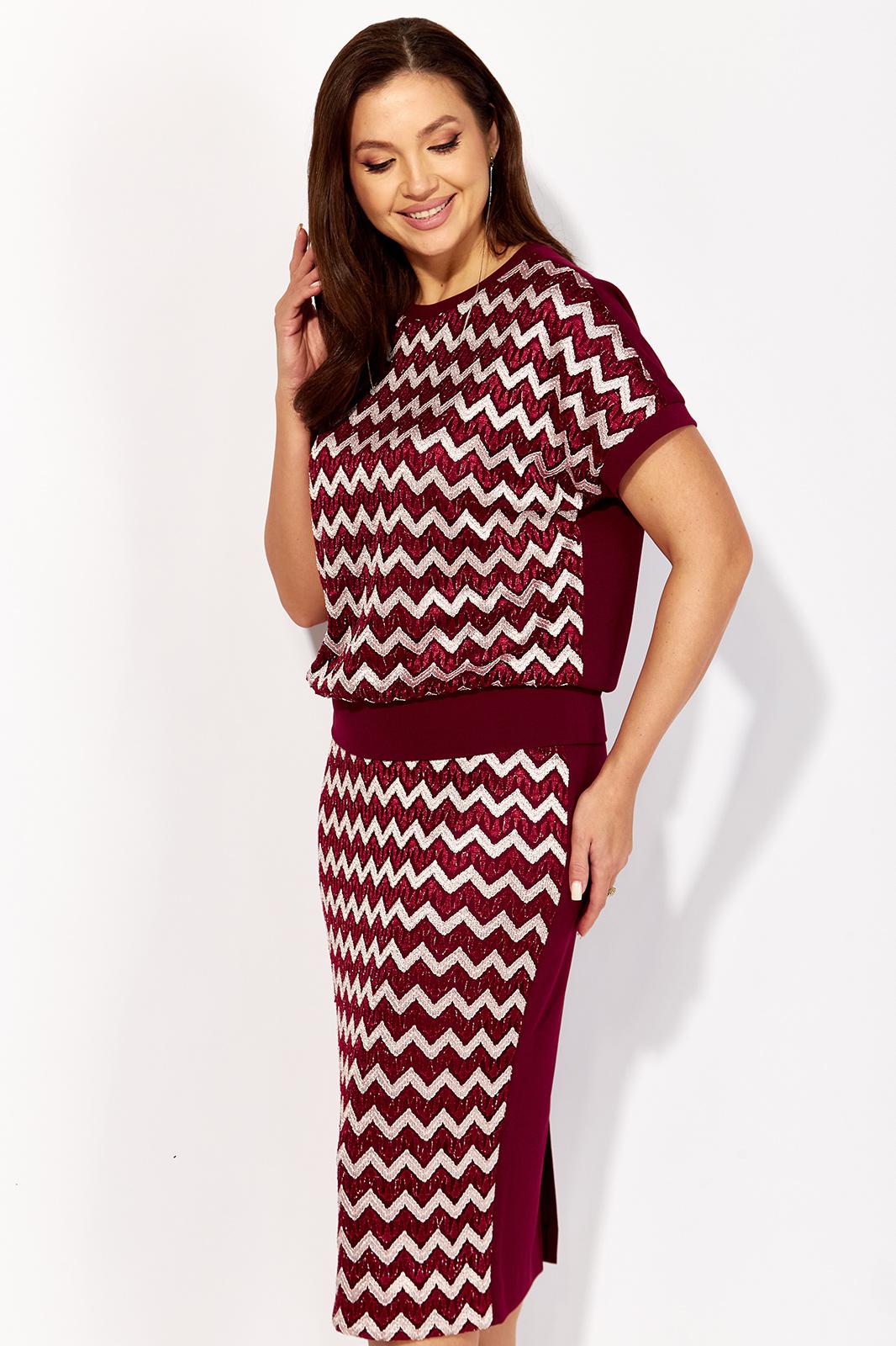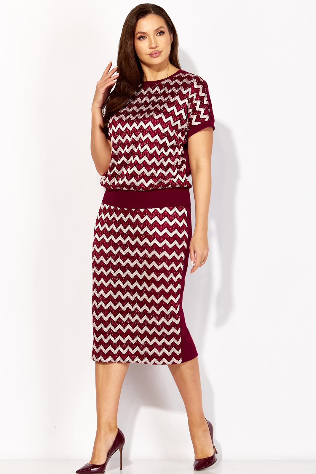 Комплект женский, 2х предметный, состоящий из блузы и юбки. Блуза прямого силуэта, с коротким цельнокроеным рукавом, снизу на манжете. Вырез горловины круглой формы. По низу рукавов и горловине подрезные бейки. Юбка прямая. Сзади средний шов и подрез снизу. Пояс на резинке(по переду отрезной, по спинке цельнокроеный) Перед блузы и юбки выполнен из полотна с паетками, спинка блузы и юбки из гладкого трикотажного полотна. По переду блузы и юбки трикотажная подкладка.