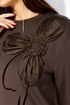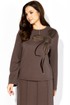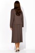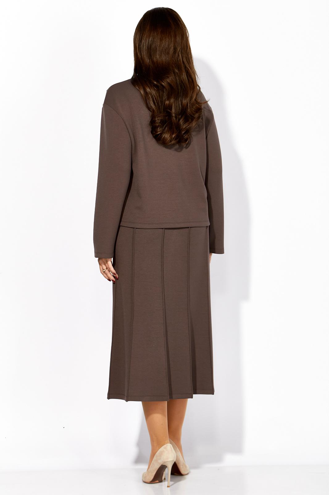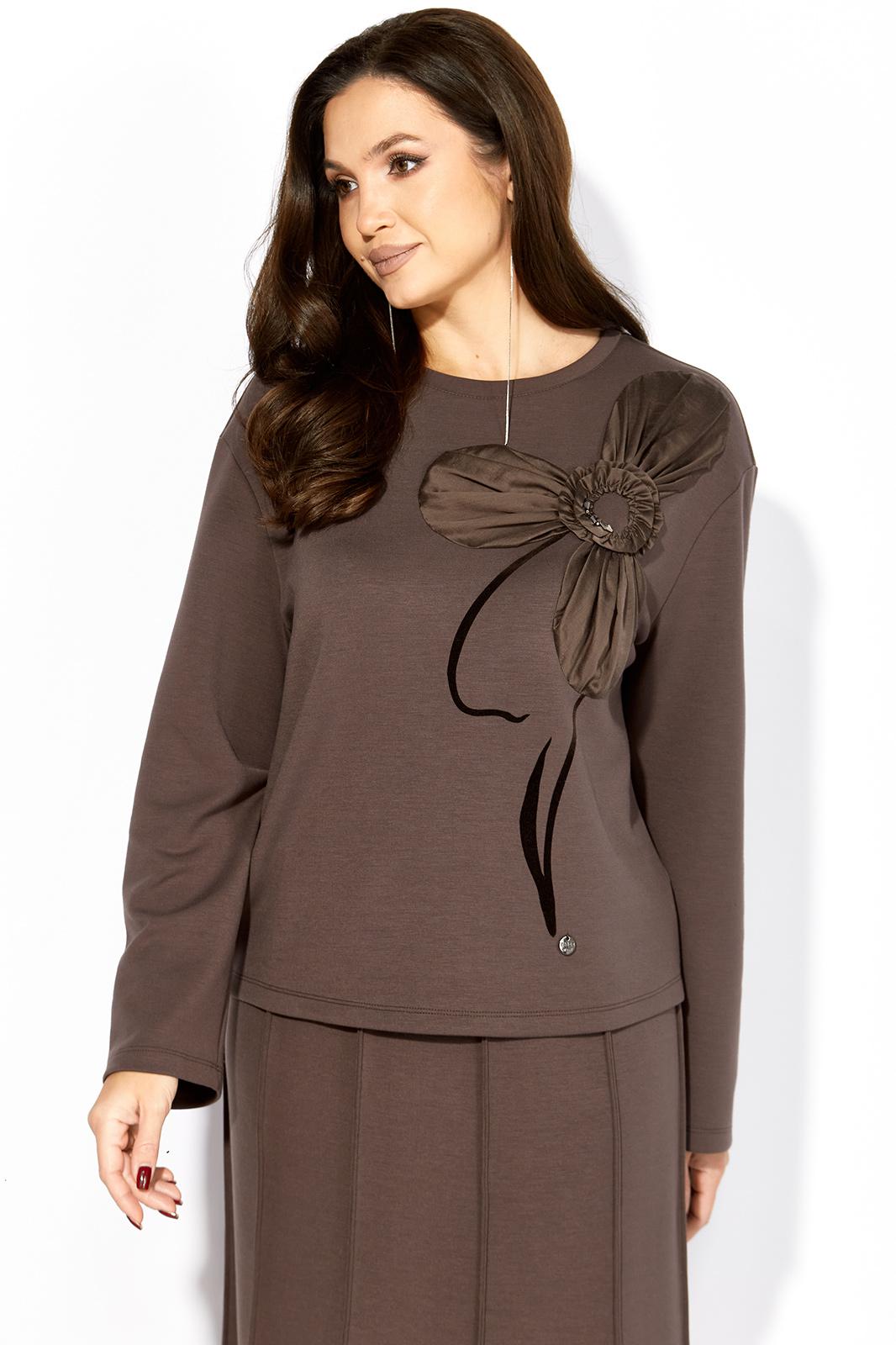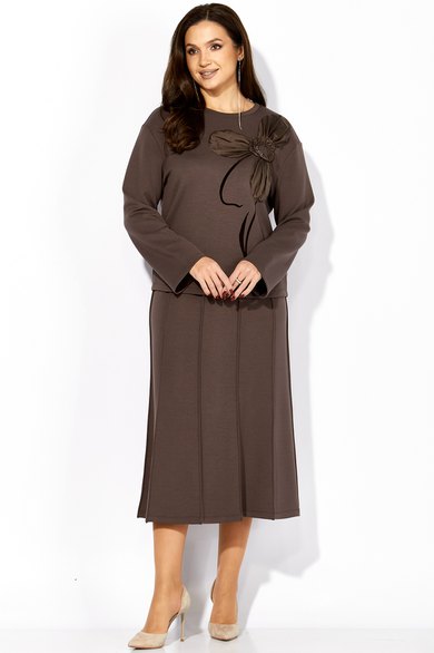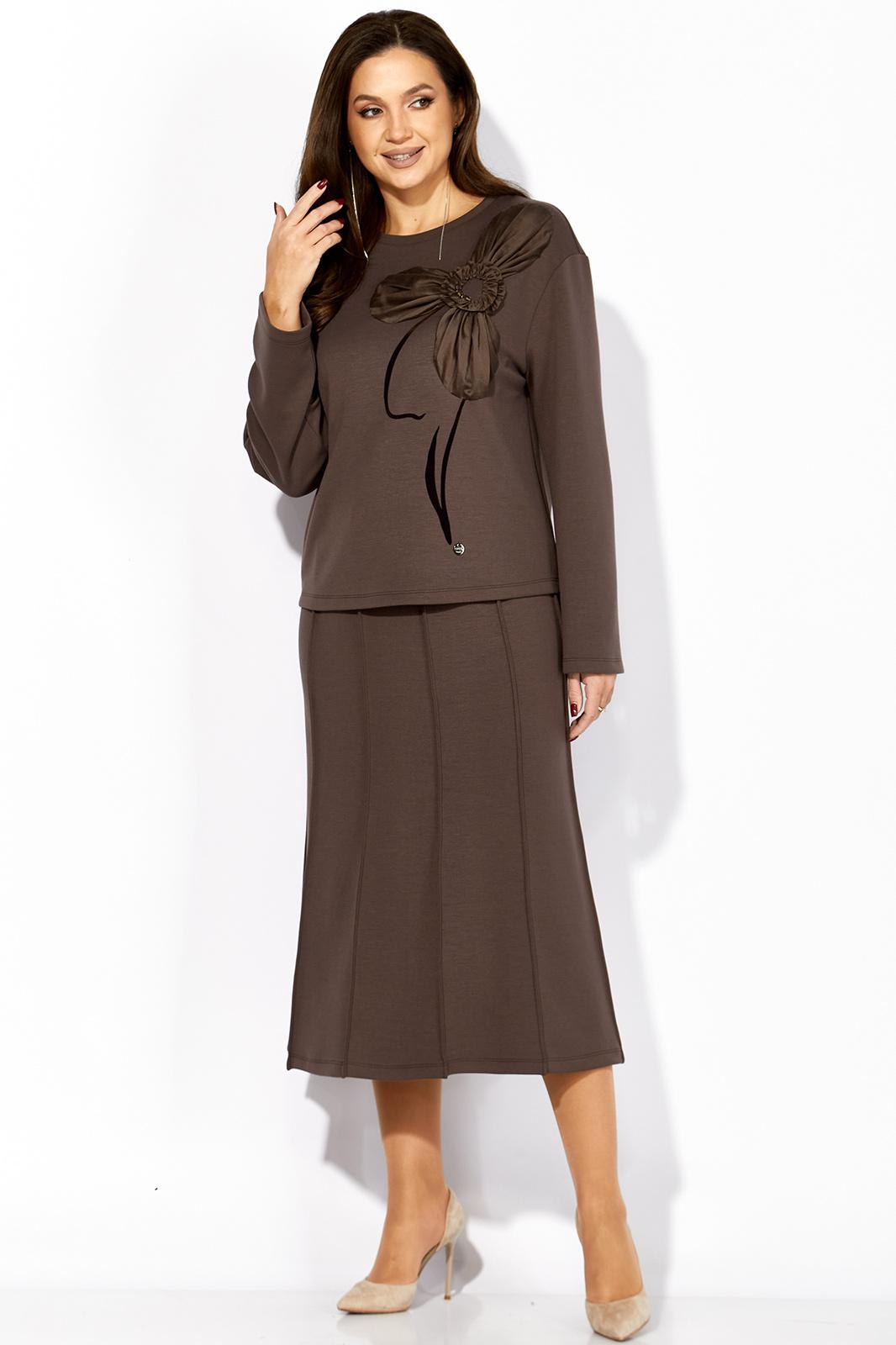 Комплект женский, 2х предметный, из трикотажного полотна тенсел, состоящий из джемпера и юбки. Джемпер прямого силуэта с длинным рукавом. Рукав со спущенной линией плеча. Вырез горловины круглой формы с подрезной бейкой. Перед акцентирован принтом и декоративным цветком из отделочной ткани. Юбка чуть расширенная к низу , состоит из десяти клиньев, застроченных на ребро в виде рельефов. Пояс притачной с резинкой по кругу.