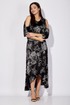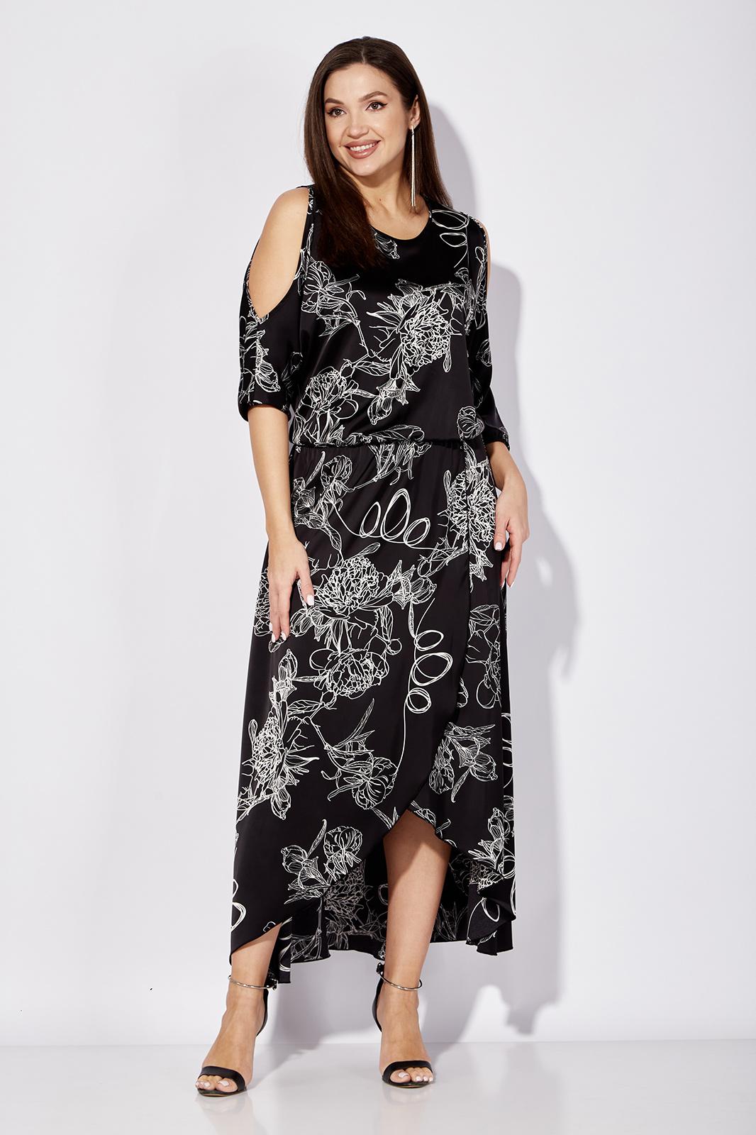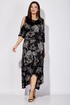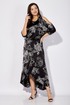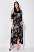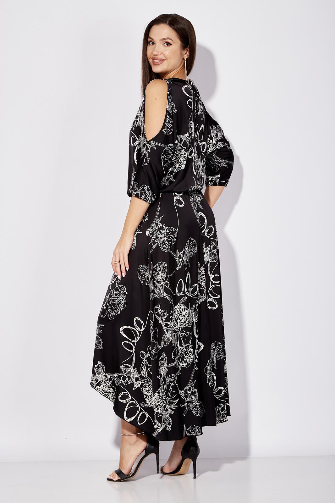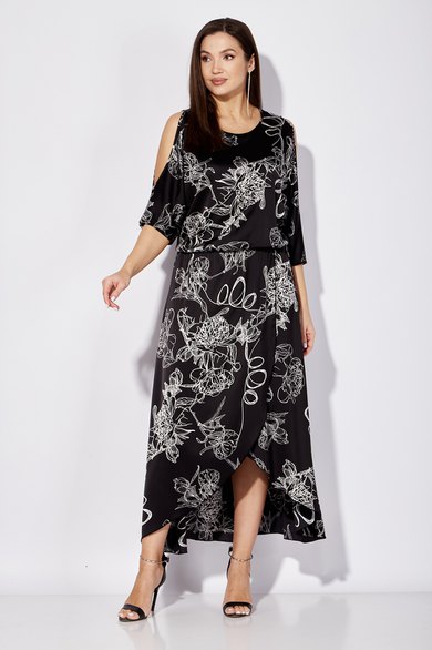 Платье женское, расширенное к низу, отрезное по линии талии. Рукав цельнокройный, длиной 3/4 с открытым плечом. По талии и низу рукава резинка. Горловина круглой формы. По спинке разрез с завязками. Низ платья расширен, по переду с фигурным запахом. Запах сверху частично закреплен.