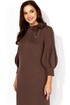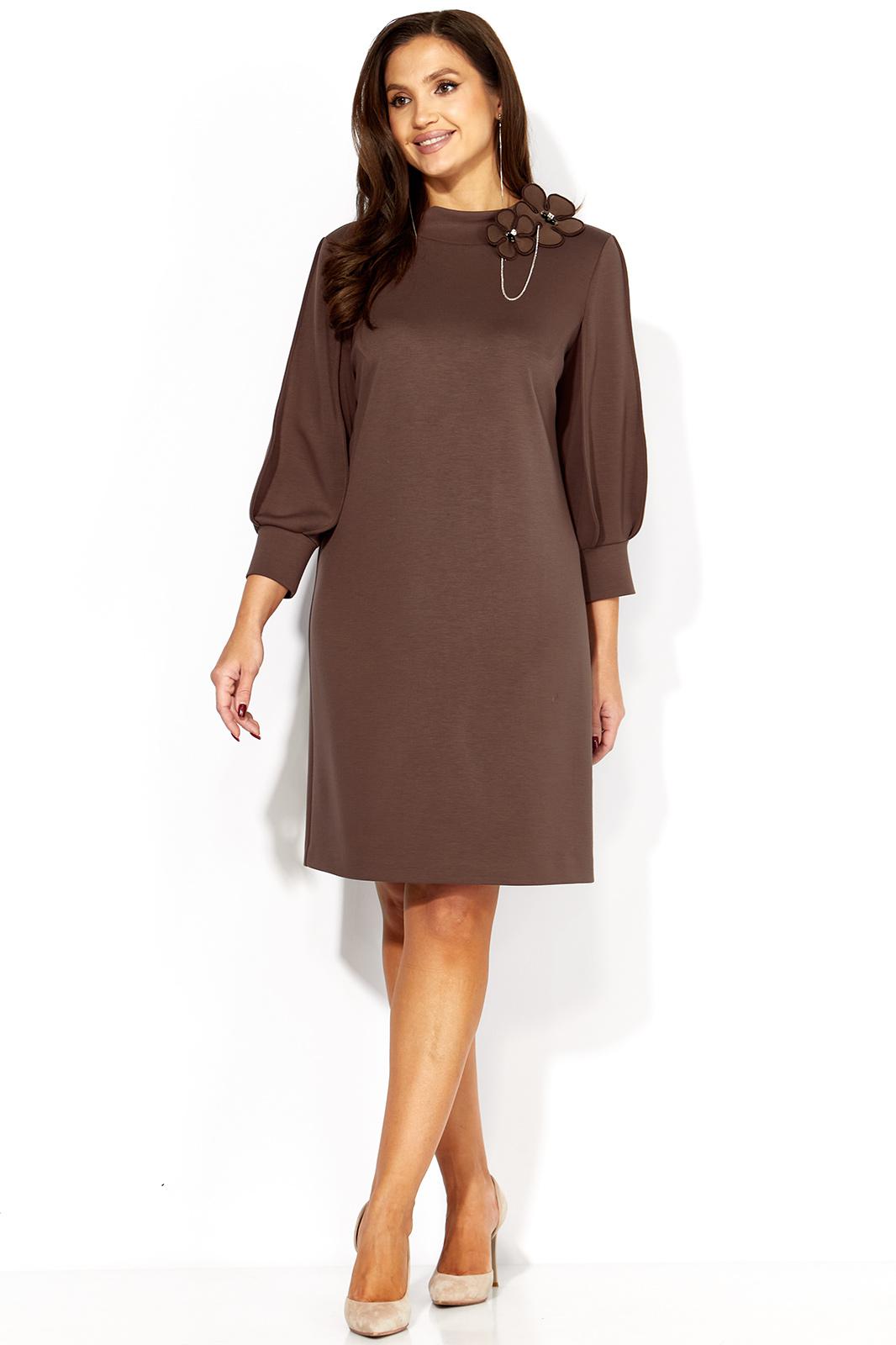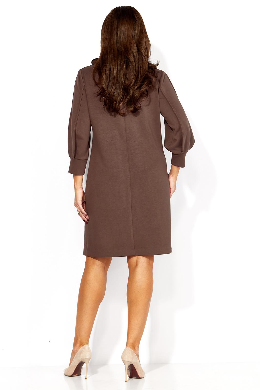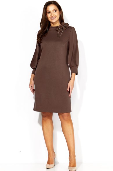 Платье женское, А-силуэта с втачным рукавом, длинной 3/4. Рукав фантазийной формы, типа фонарик состоящий из четырех деталей. Швы рукава отстрочены стройкой на ребро По переду нагрудные вытачки из пройм. Горловина оформлена расширенной , мягкой строчкой. Декором служит съемное украшение.