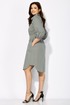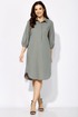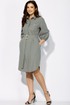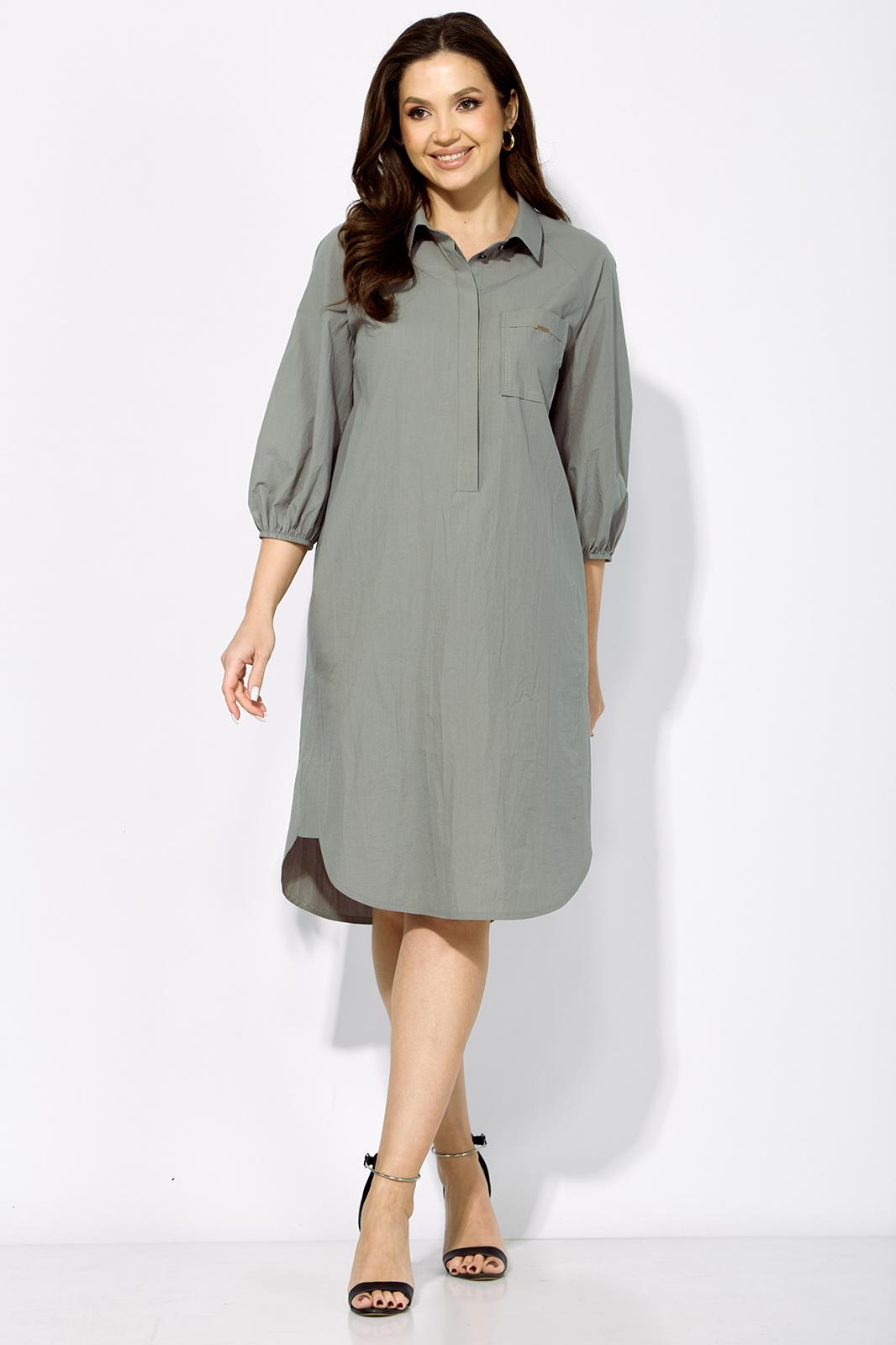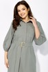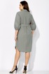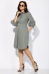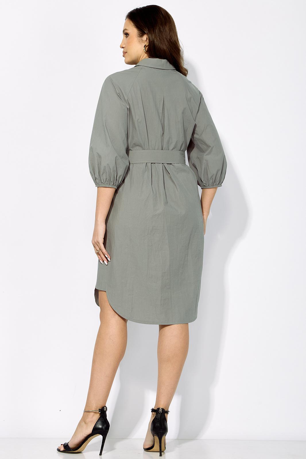 Платье женское, прямого силуэта с рукавом реглан длинной 3/4. Низ рукава присобран на резинку. Воротник рубашечный, на стойке. Застежка спереди, до линии талии, на пуговицы, с потайной планкой. Слева накладной карман с декоративной нашивкой. Карманы в боковых швах. По спинке мягкая встречная складка. Низ платья фигурной формы, со вставками по бокам, сзади чуть длиннее. Талию подчеркивает съемный пояс с пряжкой.