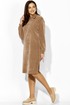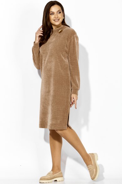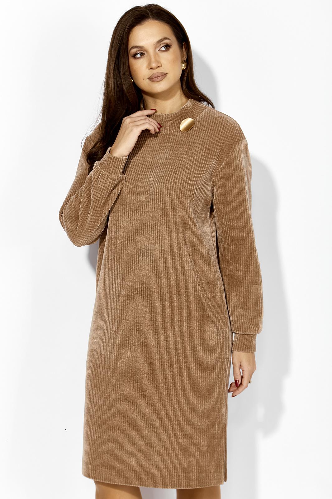 Платье женское, прямого силуэта с длинным рукавом. Рукав со спущенной линией плеча, по низу на манжете. Горловина оформлена высокой, мягкой стойкой. По боку разрез, акцентирован декоративной сточкой. Спинка без особенностей.