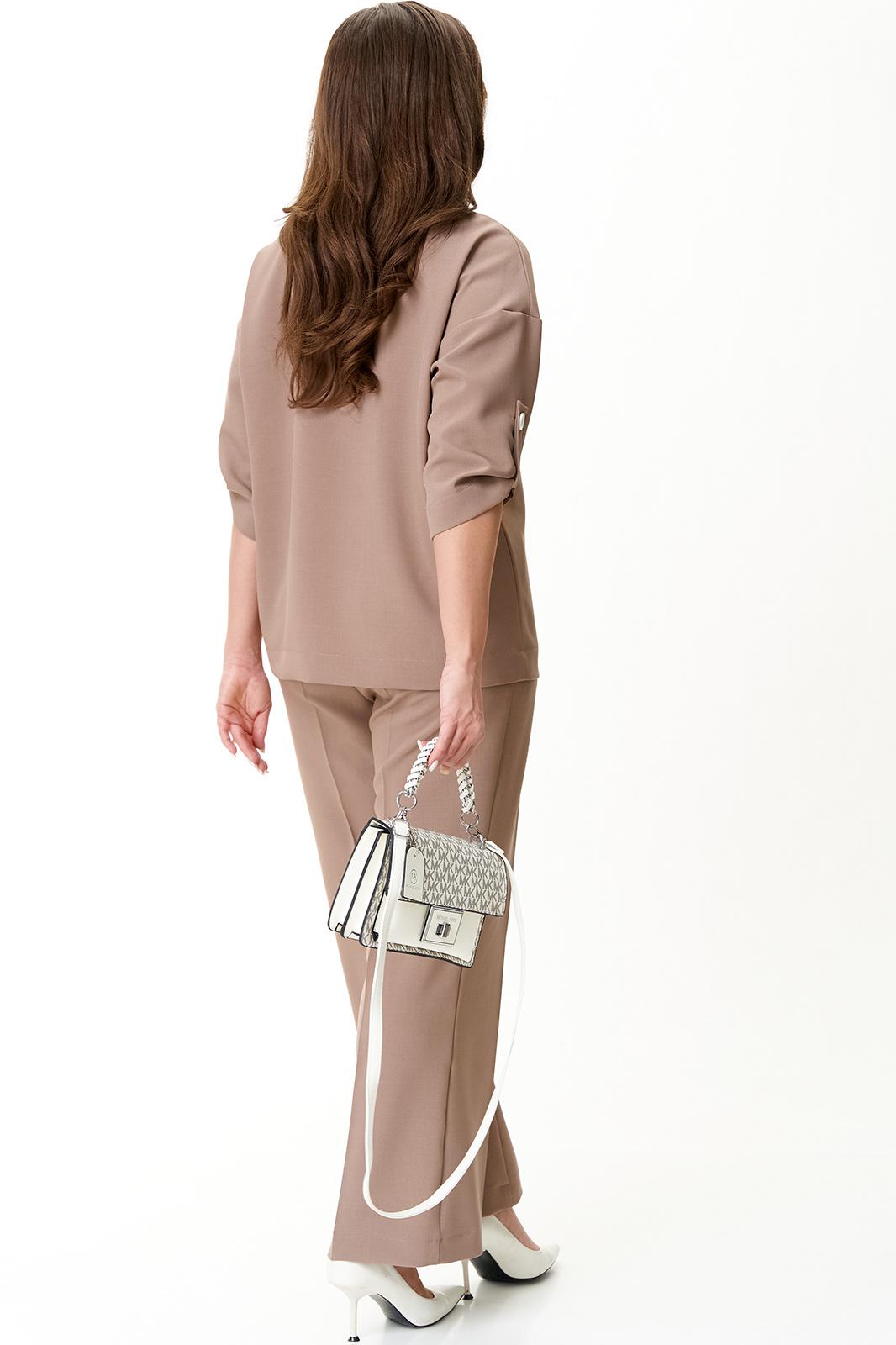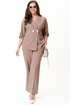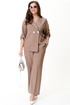 Очень стильный ,элегантный ,модный женский комплект . Состоит их брюк палаццо и жакета прямого силуэта , со спущенной проймой ,что придает свободу движению и комфорта при носке. Интересный дизайн жакета , двубортный с одним рядом крупных пуговиц контрастного цвета. Рукав на пате с пуговицей контрастного цвета меньшего размера. При желании рукав можно удлинить ,расстегнув пуговицу. Длина жакета по спинке от плеча — 70,5 см. Брюки палаццо прямые с функциональными карманами, сзади на резинке. Длина брюк -101 см.