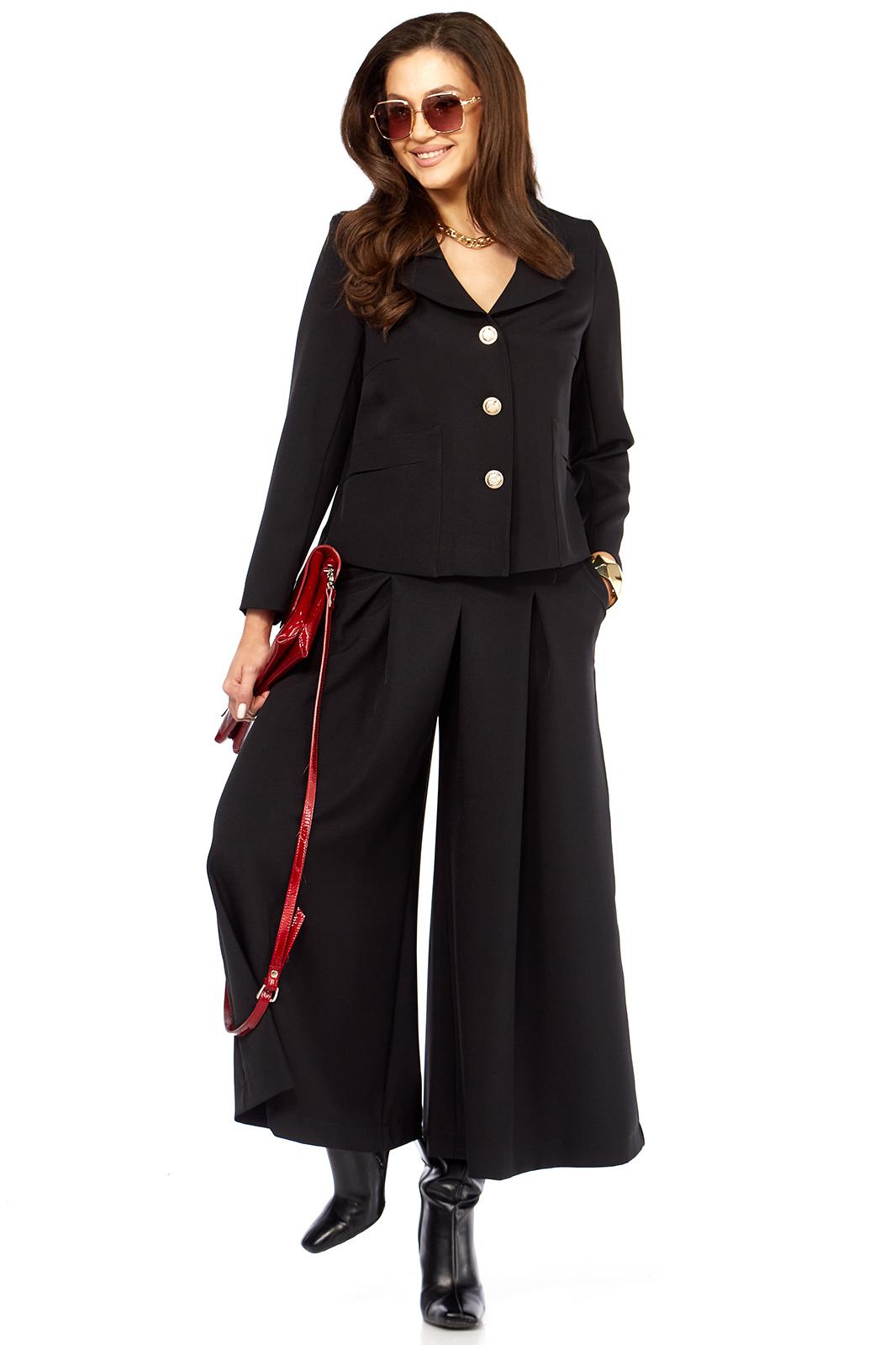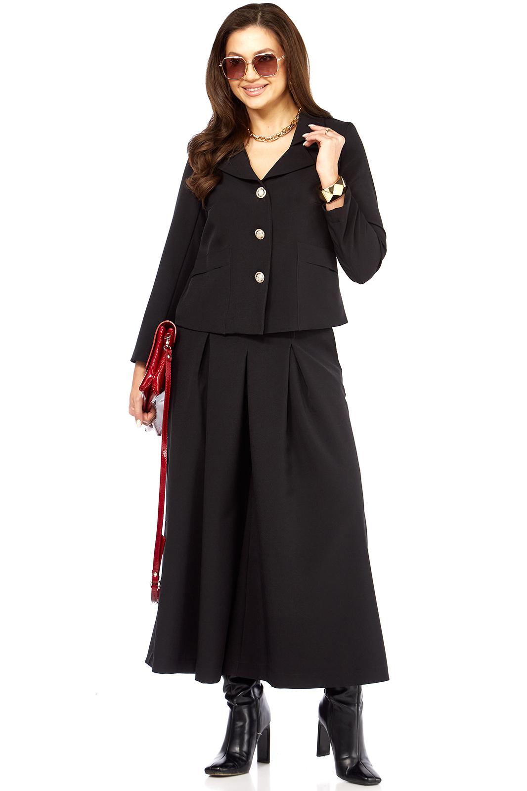 Стильный элегантный интересный женский комплект. Состоит из юбки- брюк ( кюлоты) и жакета. Жакет с интересным дизайном воротника, накладными карманами оригинального дизайна. Рукав длина — 58 см. Длина жакета от плеча по спинке 56 см. Кюлоты очень хорошей посадки с функциональными карманами по бокам, с тремя встречными складками спереди, сзади пояс на резинке, по поясу есть шлеки, что позволяет носить юбку-брюки с любым верхом, можно добавить ремень. Длина юбки-брюк 93 см.