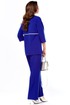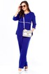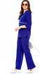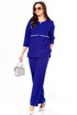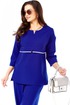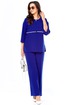 Стильный, оригинальный, красивый, удобный комплект, подходит как для торжественного случая, так и для повседневной носки. Блузон очень интересного дизайна, со спущенной проймой, что придает удобство при носке. Очень интересный ворот, с V-образной вставкой по горловине, с отлетной кокеткой по переду и спинке и контрастной окантовкой, с декоративной лейбой золотого цвета, низ передней части блузона с закругленными краями, спинка длиннее переда на 2,5 см. Длина блузона по спинке -72,5 см. Брюки классические, прямые, с функциональными карманами, пояс сзади на резинке. Длина брюк — 105 см. Рост модели 173 см.