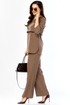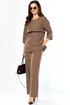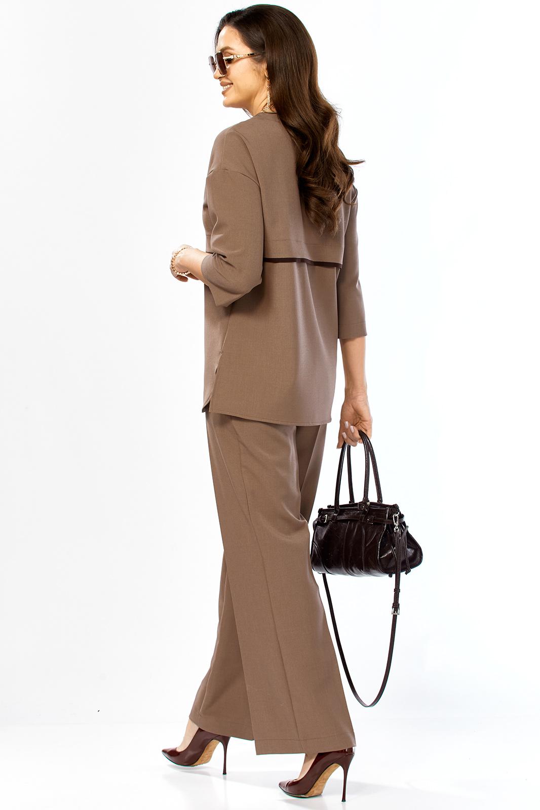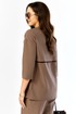 Стильный, оригинальный, красивый, удобный комплект, подходит как для торжественного случая, так и для повседневной носки. Блузон очень интересного дизайна, со спущенной проймой, что придает удобство при носке. Очень интересный ворот, с V-образной вставкой по горловине, с отлетной кокеткой по переду и спинке и контрастной окантовкой, с декоративной лейбой золотого цвета, низ передней части блузона с закругленными краями, спинка длиннее переда на 2,5 см. Длина блузона по спинке -72,5 см. Брюки классические, прямые, с функциональными карманами, пояс сзади на резинке. Длина брюк — 105 см. Рост модели 173 см.