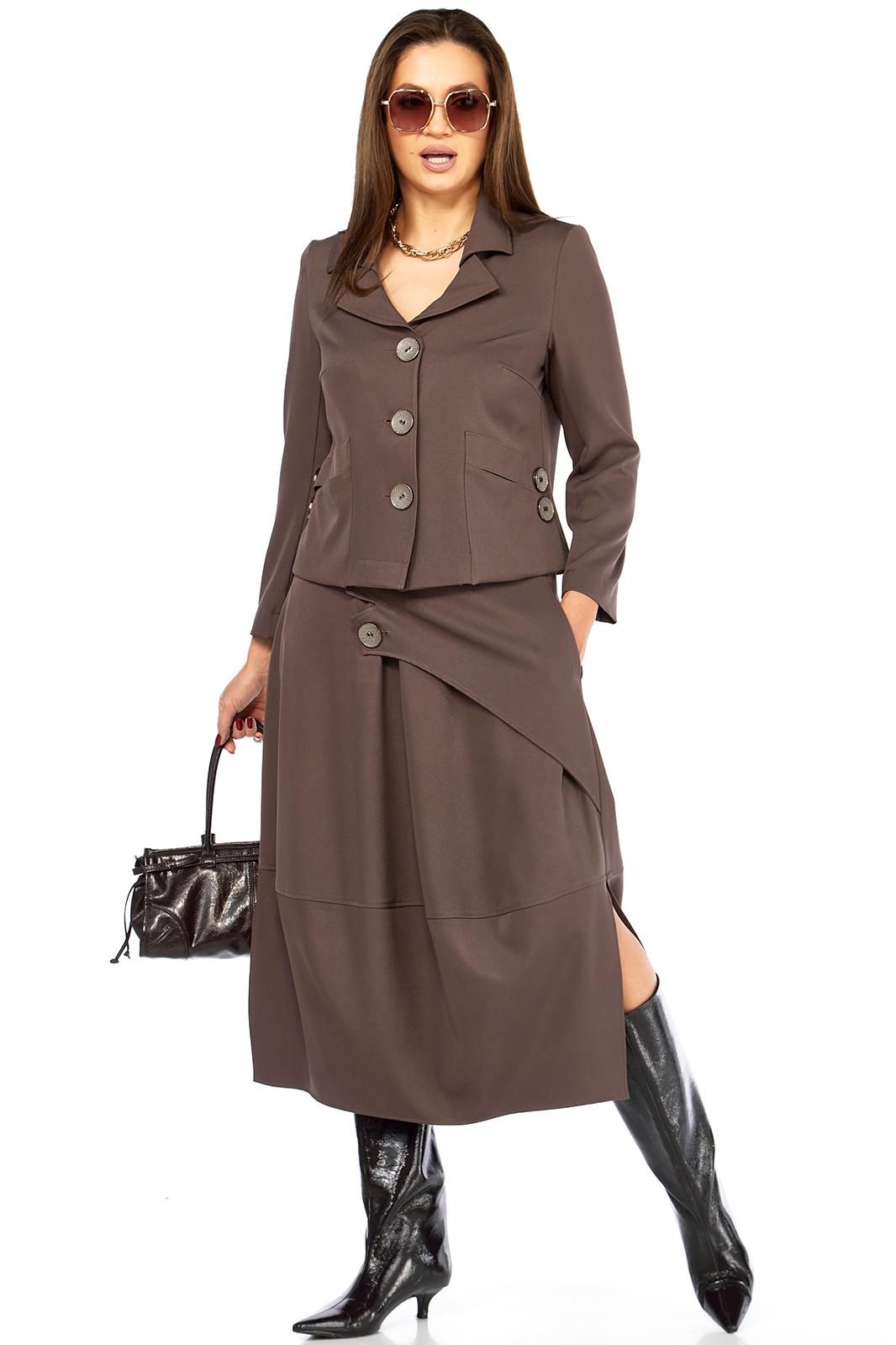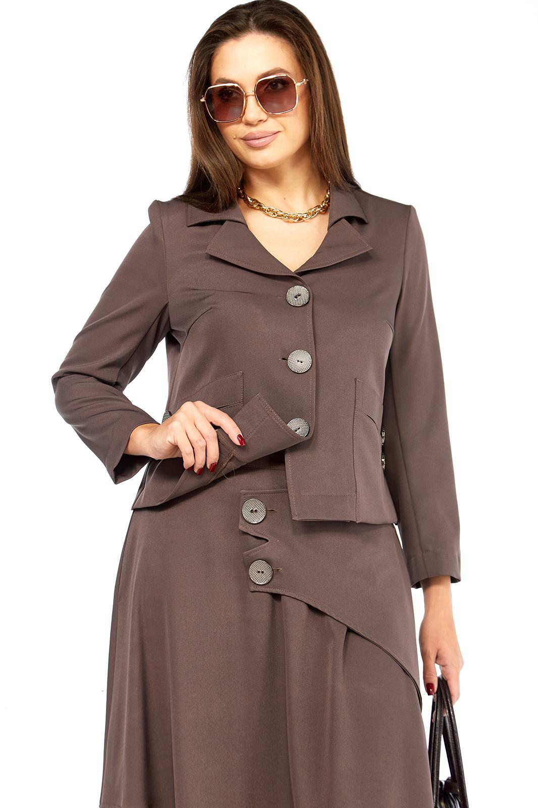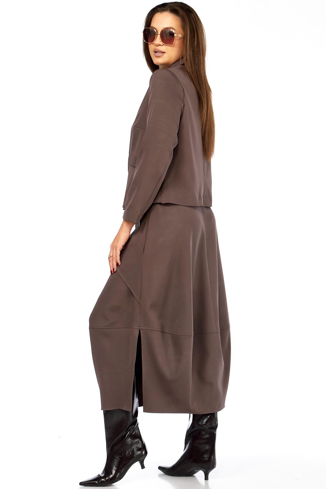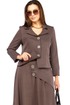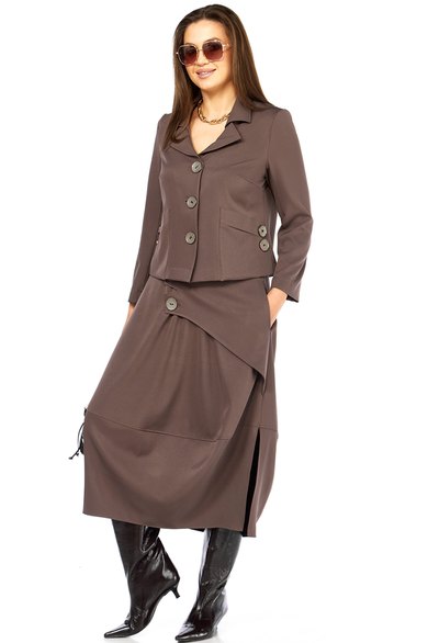 Очень стильный, элегантный , модный женский комплект , состоит блузона и юбки. Блузон с накладные карманы и большими пуговицами. Рукав 7/8 длины — 57 см, воротник интересного дизайна , верхняя часть не соединена с нижней частью . Длина жакета р р 46-50 (54 см) , в р 52-54 (56 см). Стильная модная юбка с расклешением и сужающей планкой книзу , с отлетной деталью сбоку и большими пуговицами , с разрезом сбоку. Длина юбки 81,5 см.