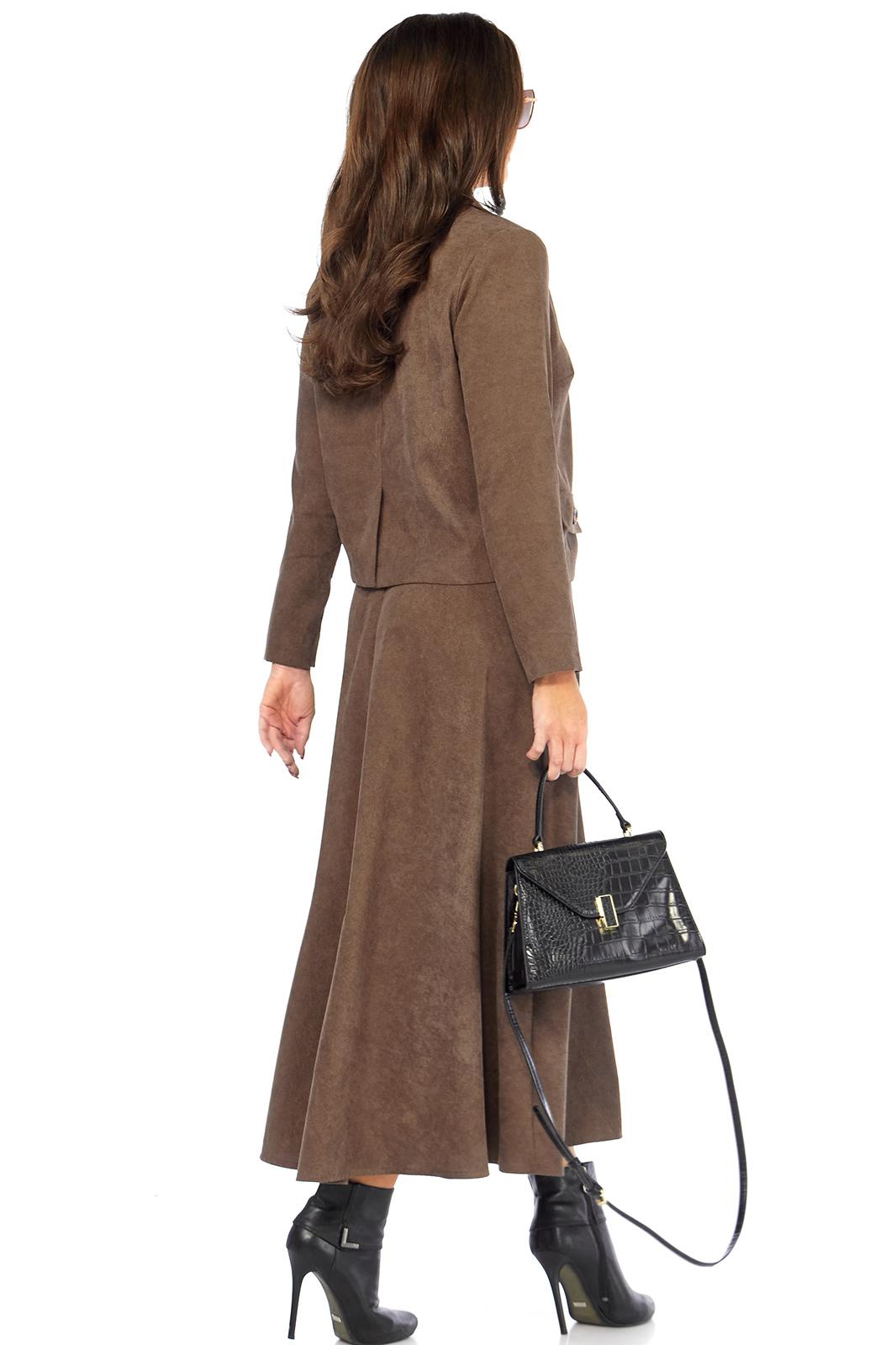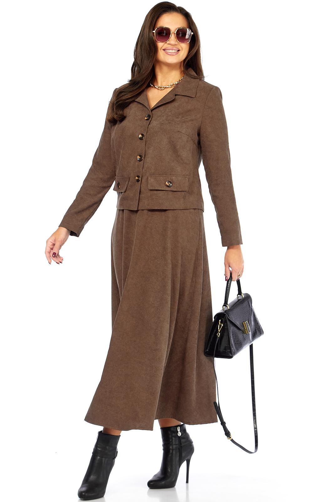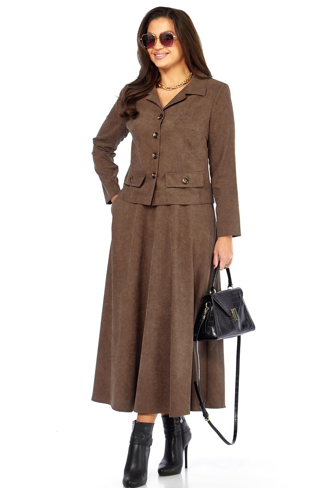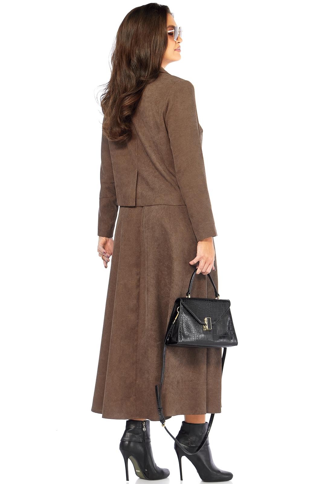 Стильный ,элегантный женский комплект из ткани микровельвет, штрукс в мелкую полоску. Жакет полуприлегающего силуэта , с интересным отложным воротником , с клапанами по низу жакета и пуговицами на них. Рукав длинный, длина рукава- 60 см. Сзади шов , переходящий в шлицу. Длина жакета от плеча сзади 55 см. Юбка очень стильная п/солнце, очень красиво ложится фалдами, это хорошо видно на фото. Сбоку юбки функциональные карманы, пояс по бокам на резинке. Длина юбки - 92 см .