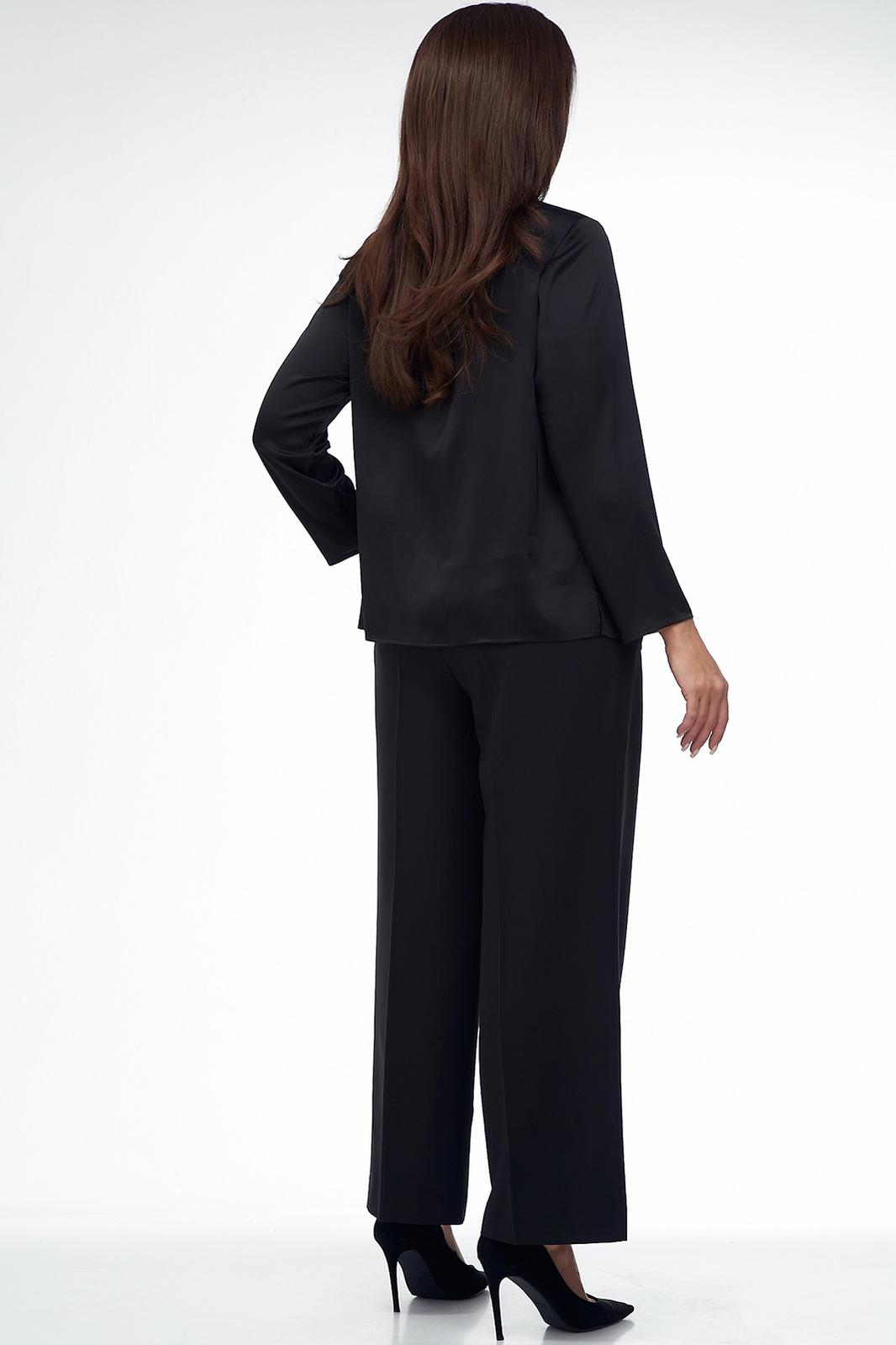 Блуза из легкой атласной ткани, прямого силуэта с нагрудными вытачками, разрезами по бокам, с застежкой на петлю и пуговицу. Рукав втачной, одношовный, укороченный. Вырез горловины круглый. Воротник отложной.
