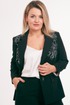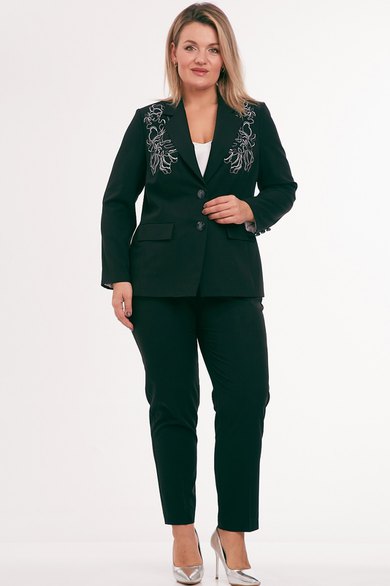 Жакет из костюмной ткани на подкладке, полуприлегающего силуэта, с отложным воротником и лацканами, с центральной бортовой застежкой на петли и пуговицы. Перед с талиевыми вытачками, прорезными карманами с клапаном и вышивкой в области груди. Спинка со средним и рельефными швами. Рукав втачной двухшовный. Воротник отложной пиджачного типа.